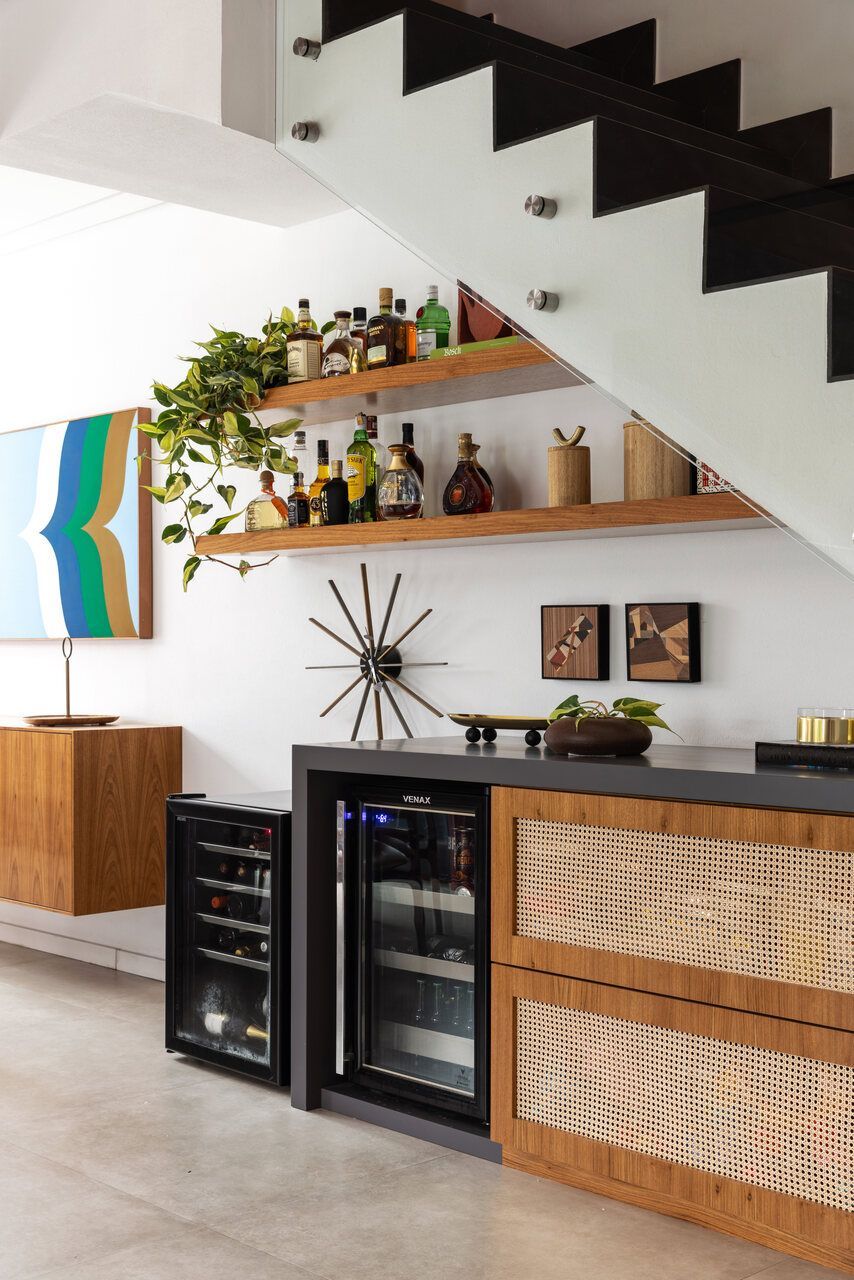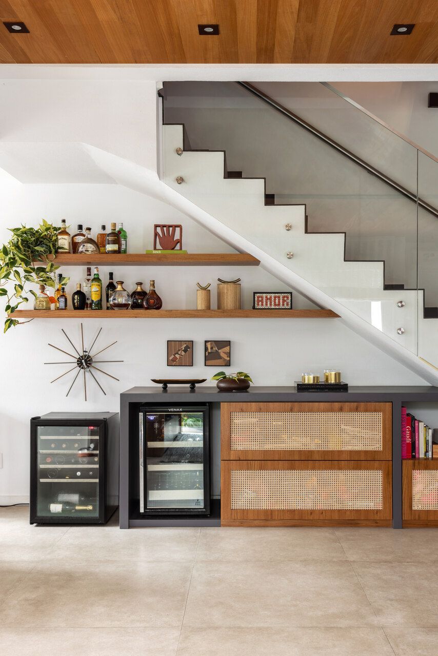 Outro destaque está na marcenaria planejada sob medida, como o buffet da sala de jantar, o móvel sob a escada e o rack do home theater. O cuidado no desenho garantiu que essas peças dialogassem naturalmente com os móveis de design assinado, sem parecerem meramente funcionais ou destoarem da elegância do conjunto.