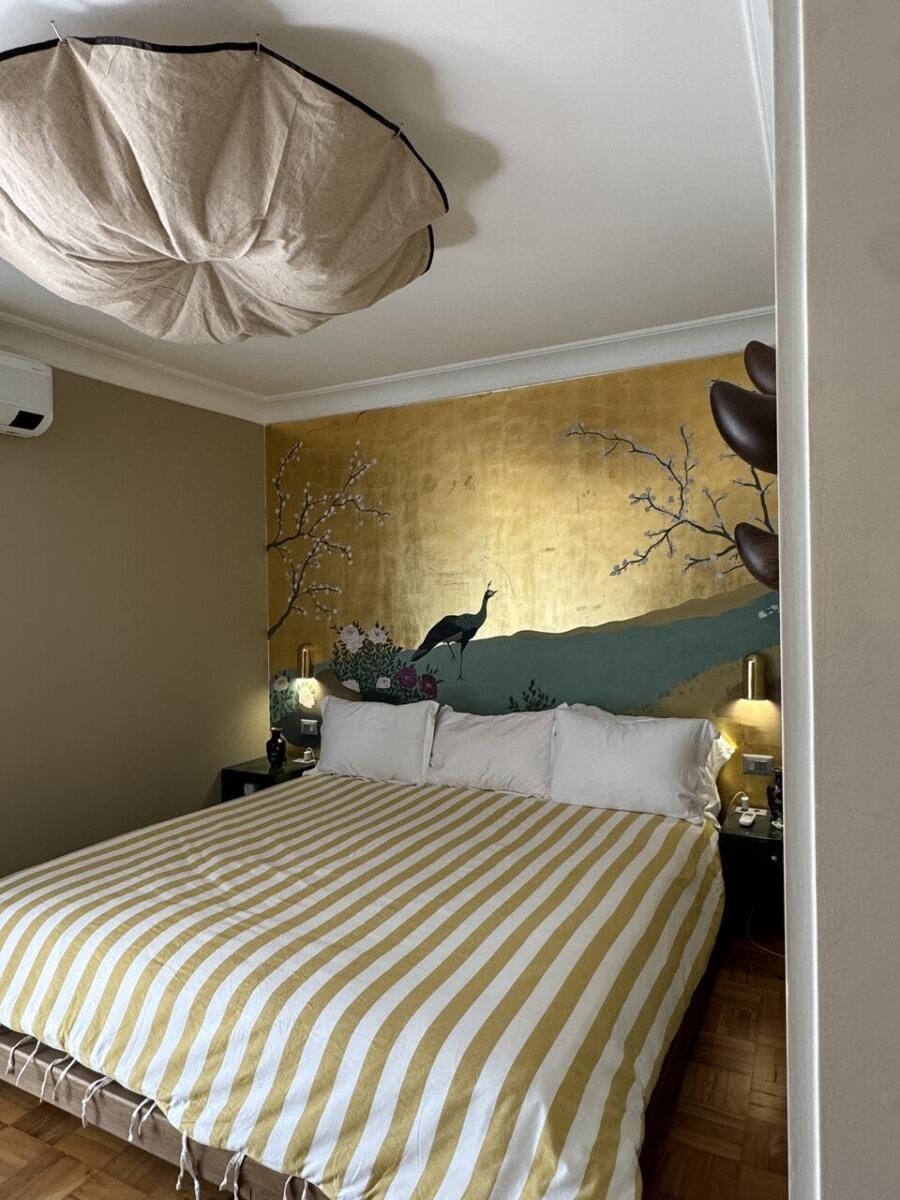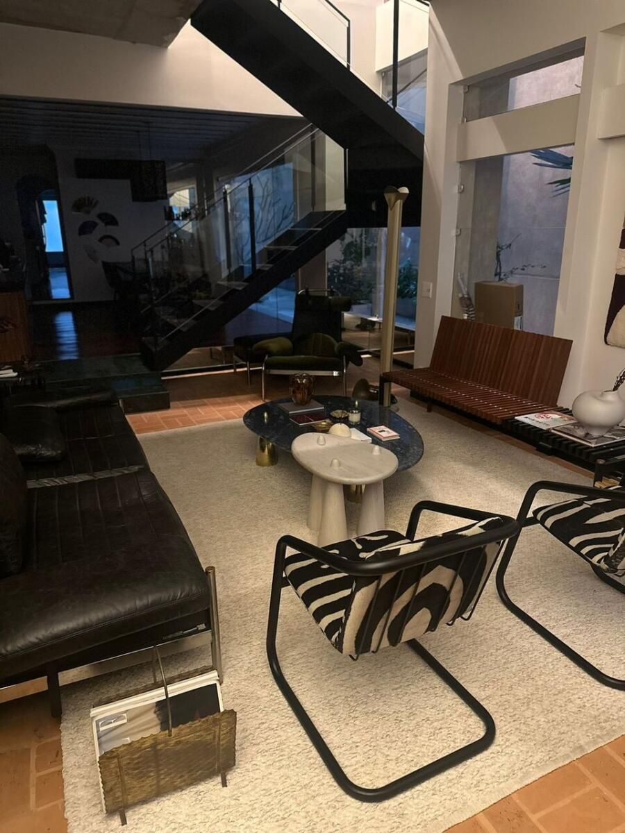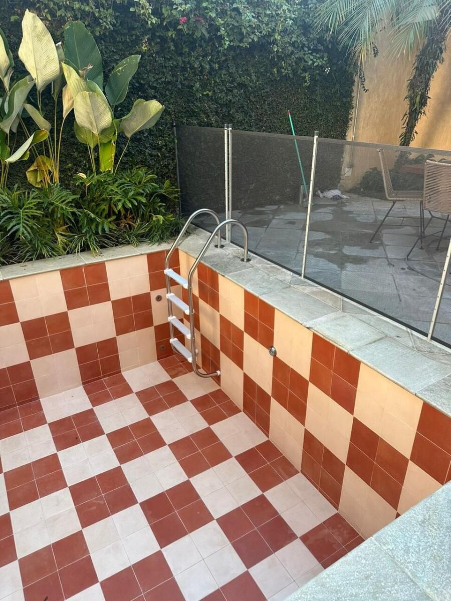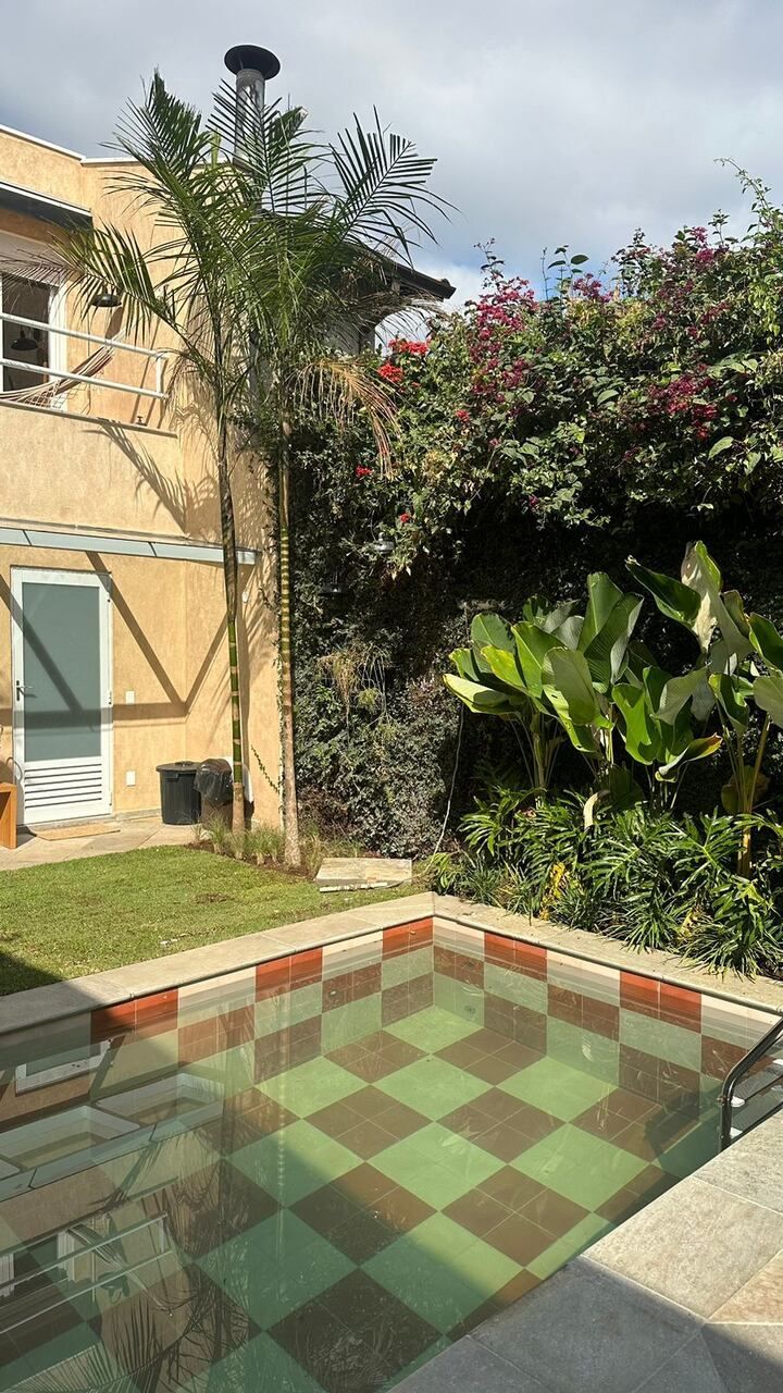Os móveis escolhidos possuem um design industrial que se harmonizam com peças garimpadas em antiquários e objetos de família, criando uma mistura de estilos que traz personalidade ao espaço. Elementos como mármore e pinturas feitas à mão nos quartos agregam ainda mais valor à decoração. A piscina, com ladrilhos hidráulicos quadriculados, não só serve como um ponto focal, mas também como um convite ao relaxamento e à convivência, complementando perfeitamente a proposta de um lar moderno e acolhedor.