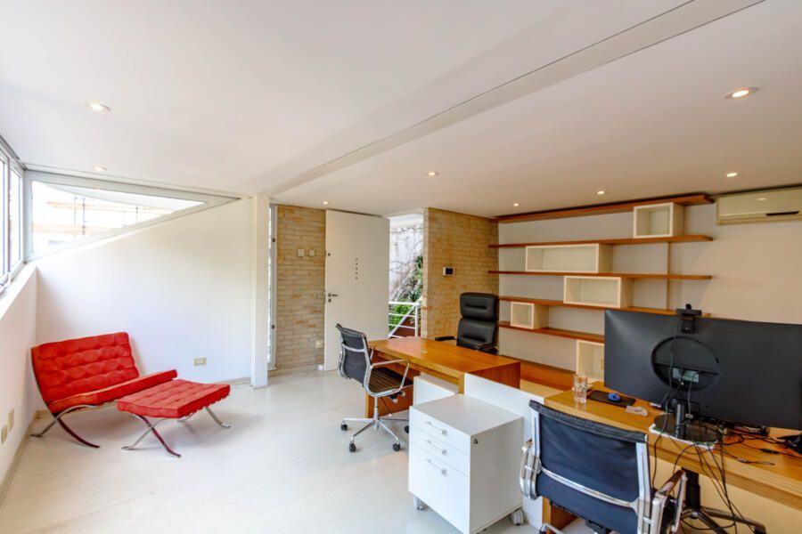 Um dos espaços que mais me encantou foi o escritório com entrada independente, perfeito para quem, assim como eu, valoriza a possibilidade de trabalhar em casa sem abrir mão da privacidade. Além disso, a vista permanente para as copas das árvores e o paisagismo cuidadosamente desenhado transformam o dia a dia em uma experiência visualmente inspiradora.