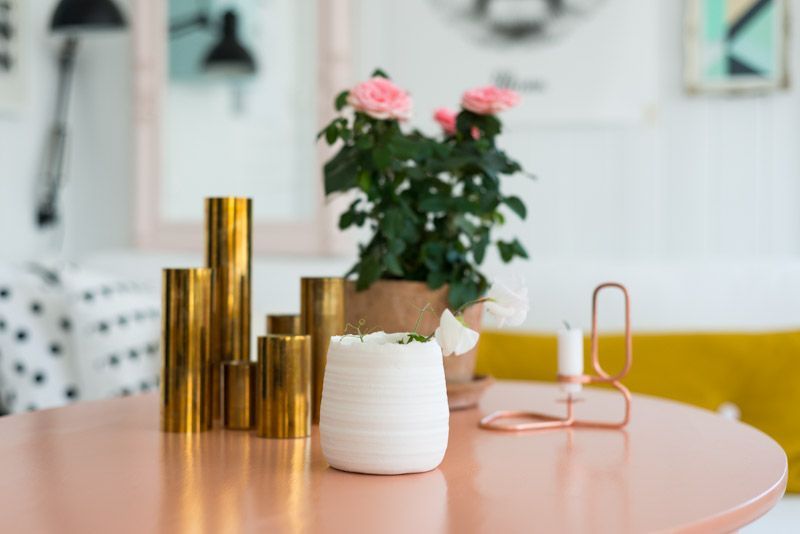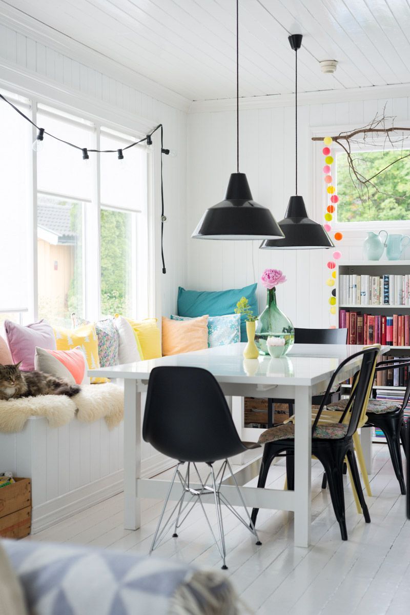 Gosto de muitas sacadinhas da Ingrid como, por exemplo, usar o banco da janela como acento para a mesa de jantar, a mesa de centro que ela usa na sala de estar que é mais alta que o tradicional e dá para tomar um chá ou até trabalhar rapidinho e a organização cromática que ela faz com os livros.