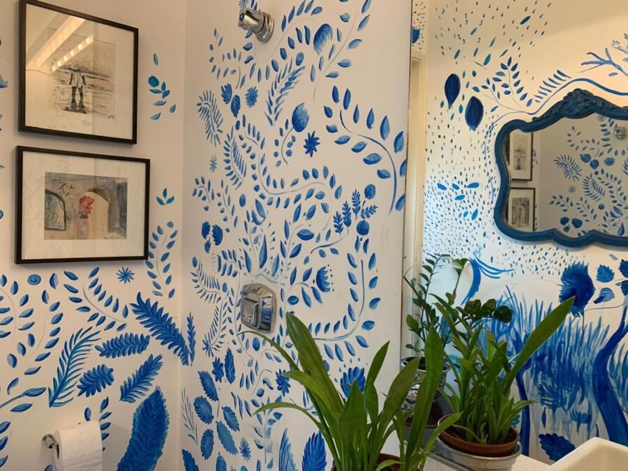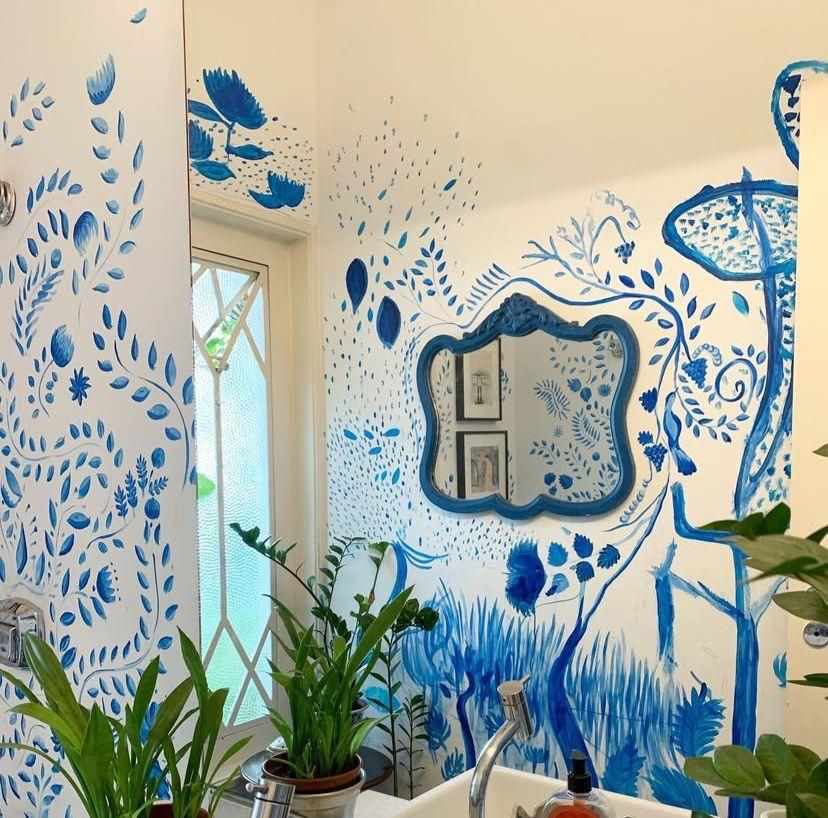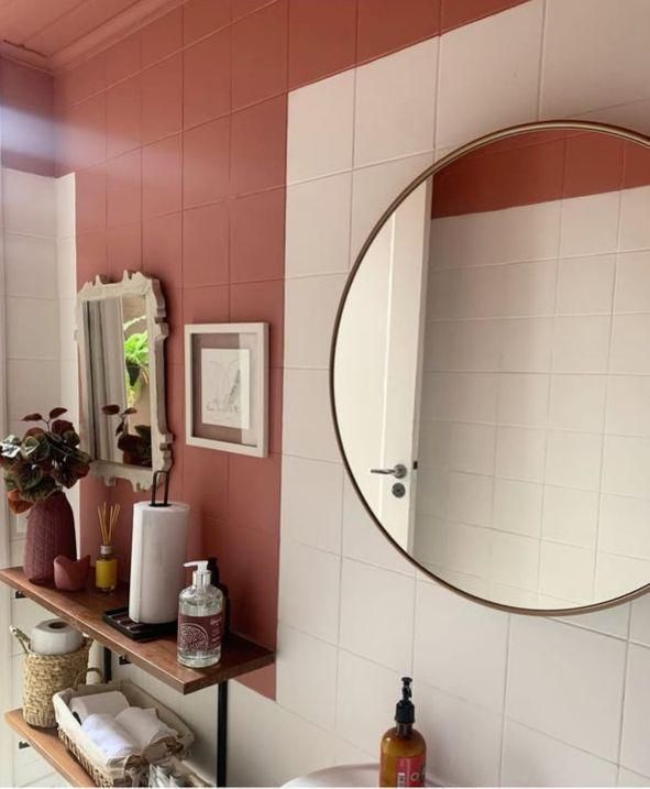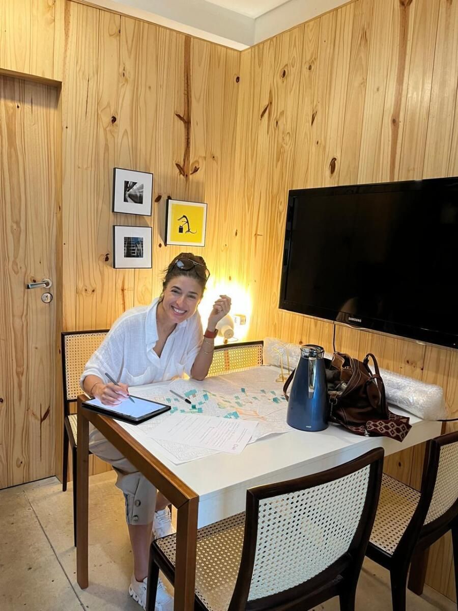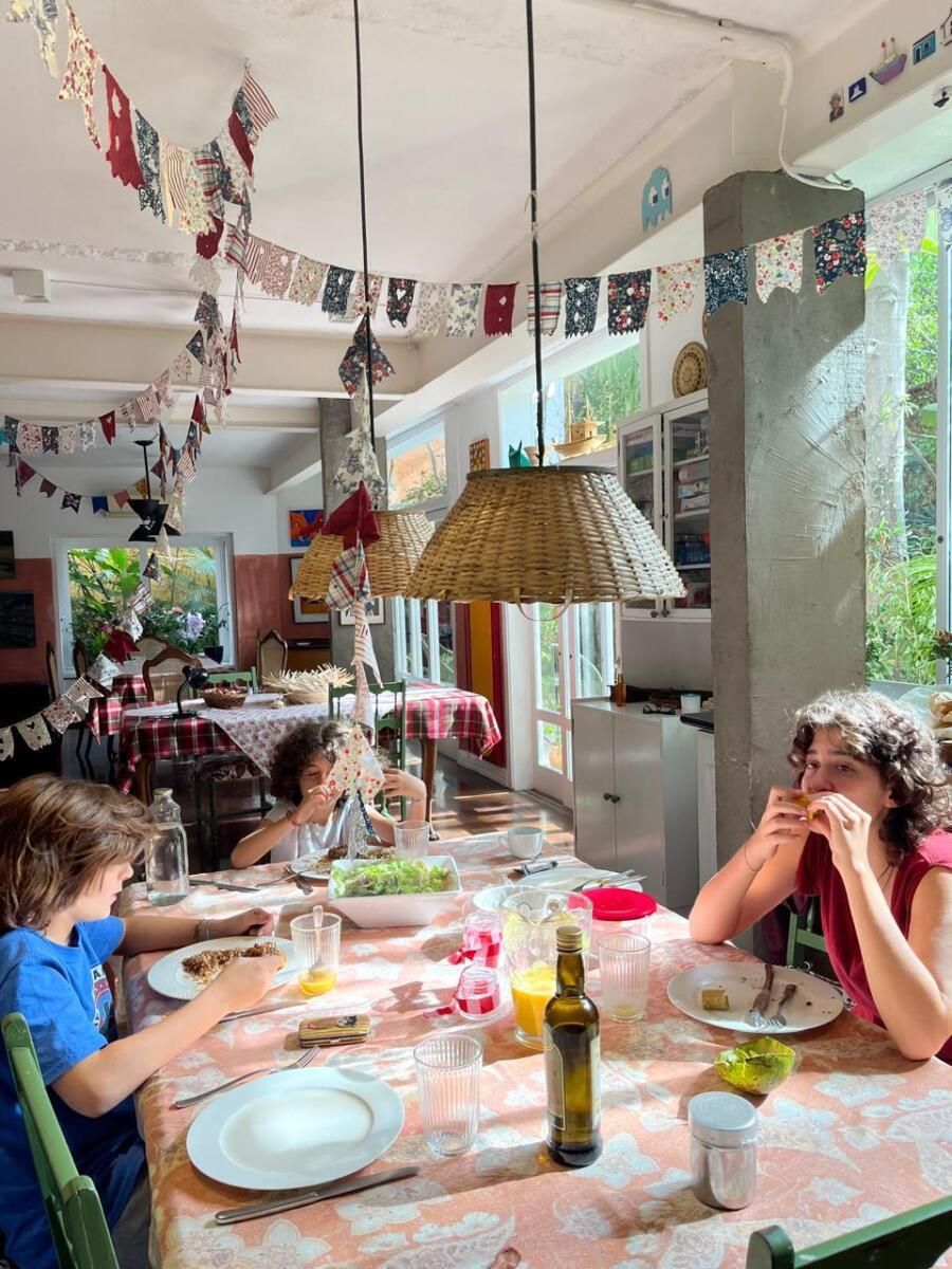 No fundo, o jardim com balanço oferece um espaço de respiro. O lavabo ganhou um mural feito à mão por Carolina e seus filhos, um detalhe simples, mas cheio de significado. Já o escritório de arquitetura funciona dentro da própria casa, reforçando a ideia de que morar e trabalhar podem coexistir perfeitamente.