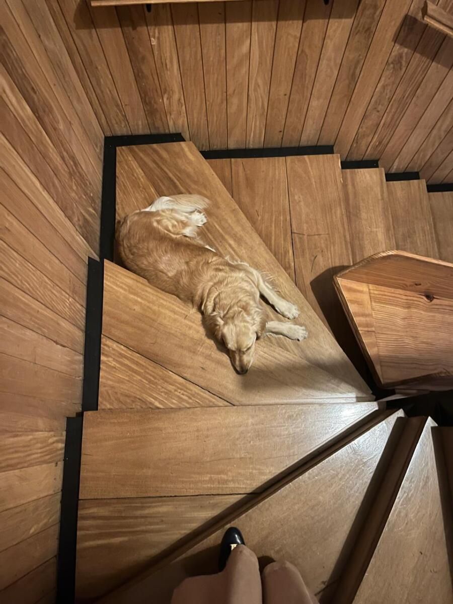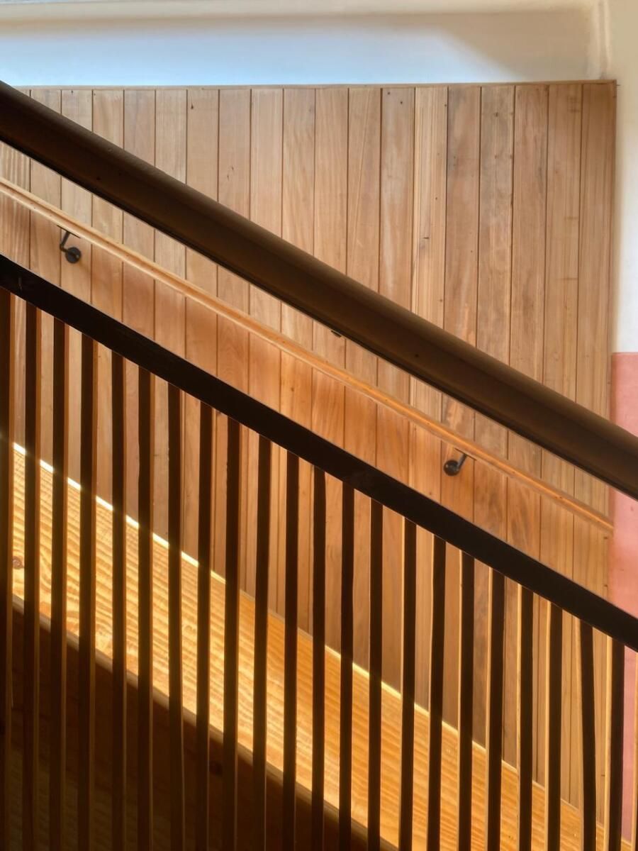 Conforme entramos pela casa, vamos descobrindo algumas surpresas nada convencionais, como é o caso do escorregador de madeira na escada central pensado para os filhos de Carol!