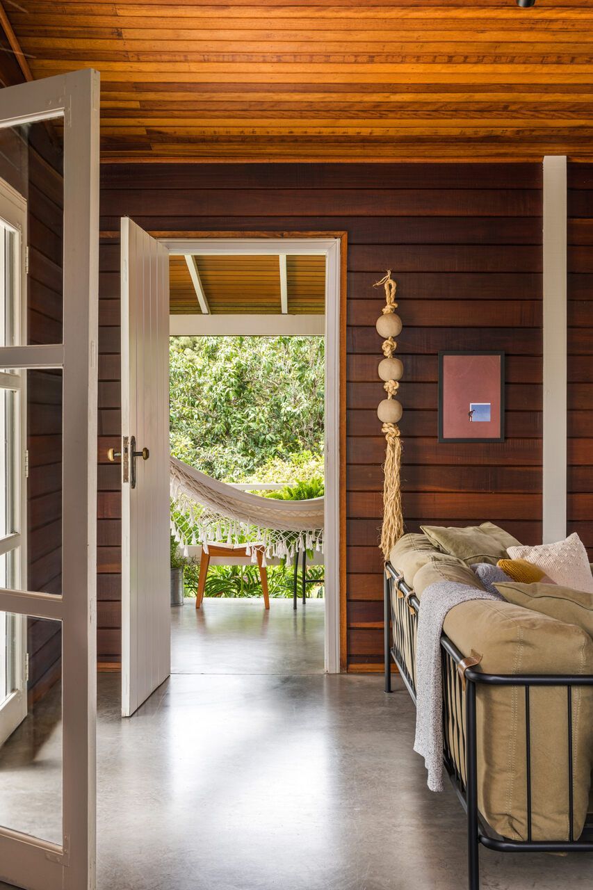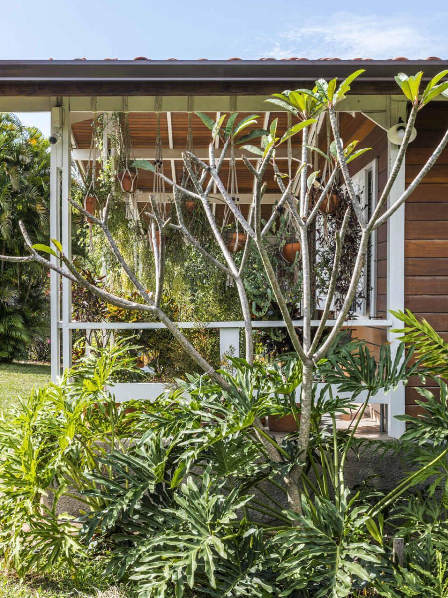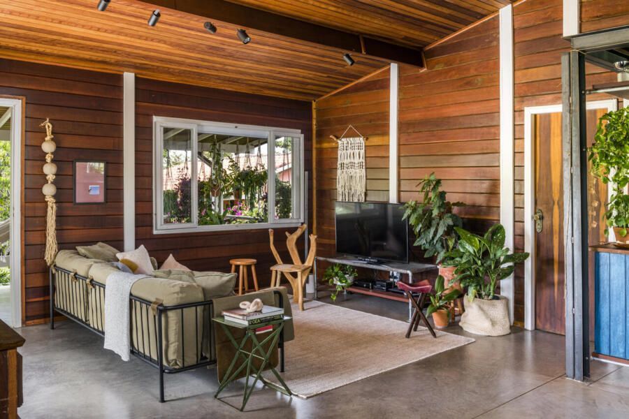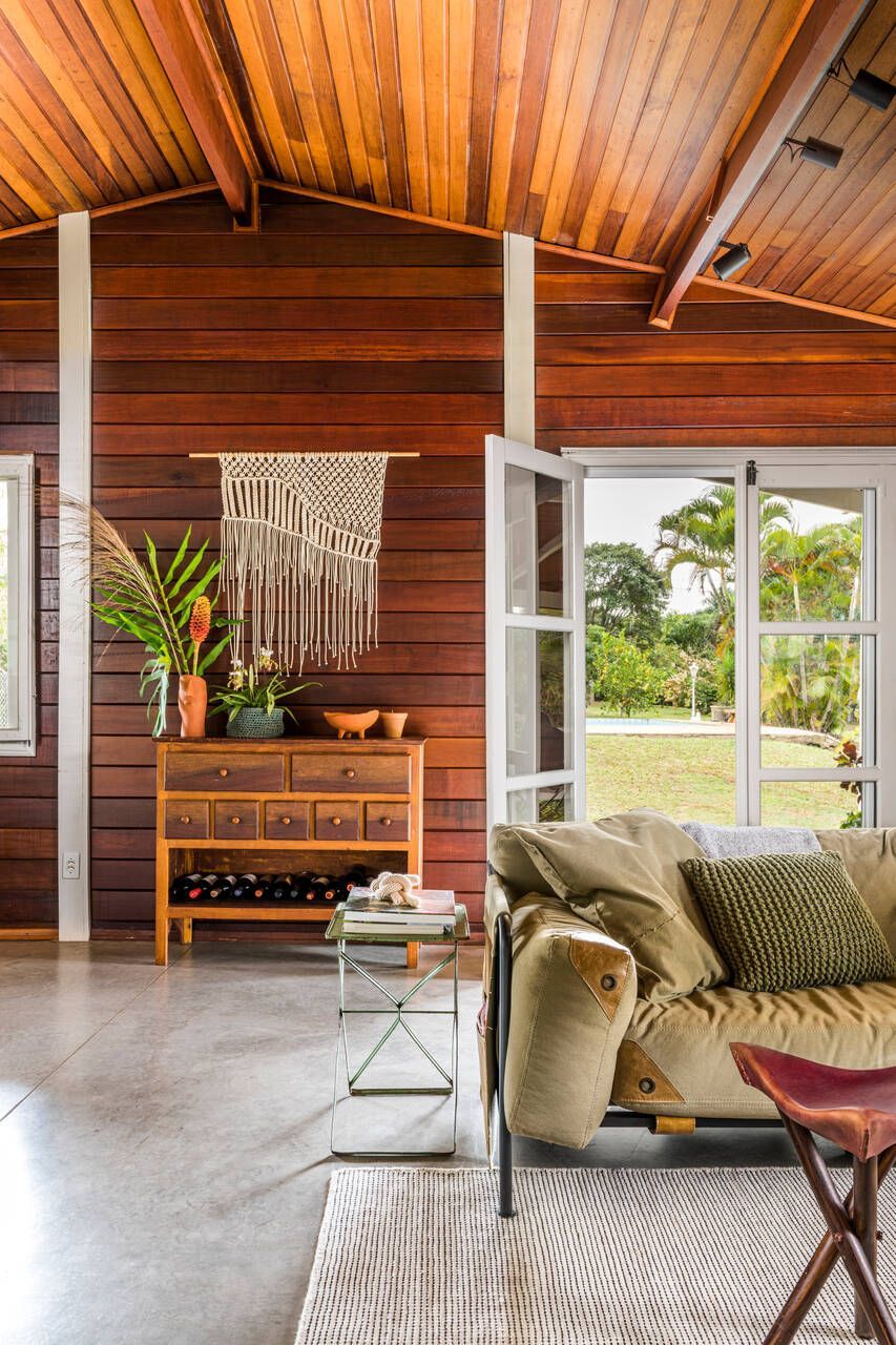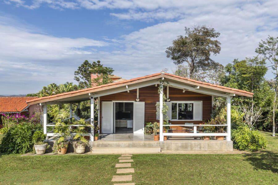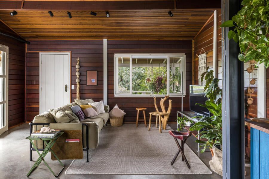 MACRO Arquitetos: A casa existente em madeira pré-fabricada foi um partido de inspiração, a ideia era respeitar a construção existente, trazendo um conforto visual aconchegante, dialogando com a paisagem inserida.