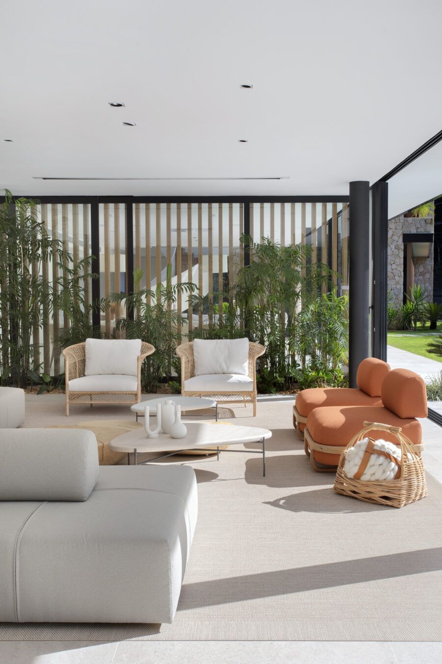 Como a casa é usada nos finais de semana pela família e amigos que eles recebem, os tecidos dos sofás são todos impermeáveis e os tapetes do estar e do espaço gourmet também são próprios para área externa. Assim todos podem circular com roupas de praia/piscina sem ter preocupação de estragar ou manchar os estofados.