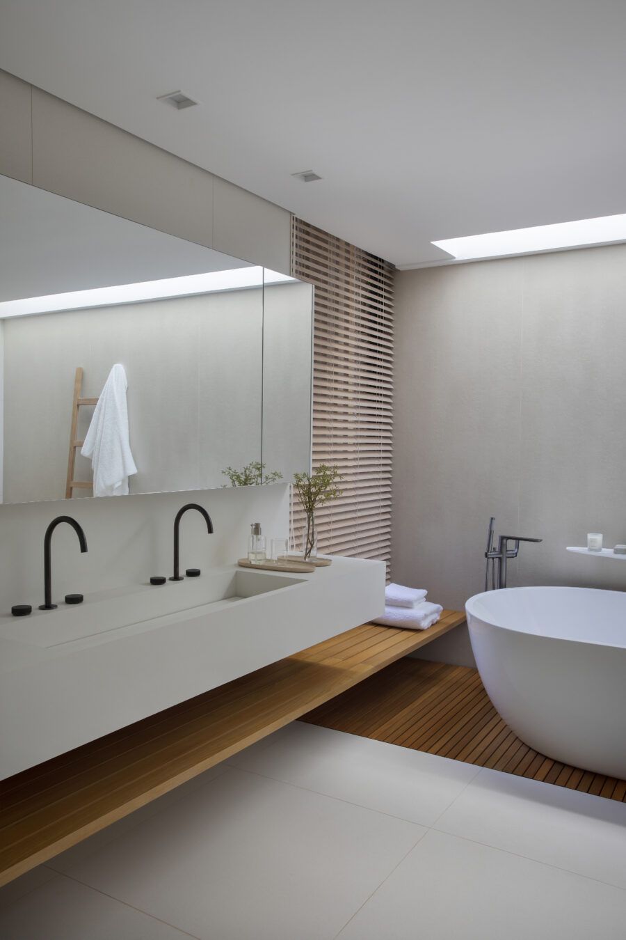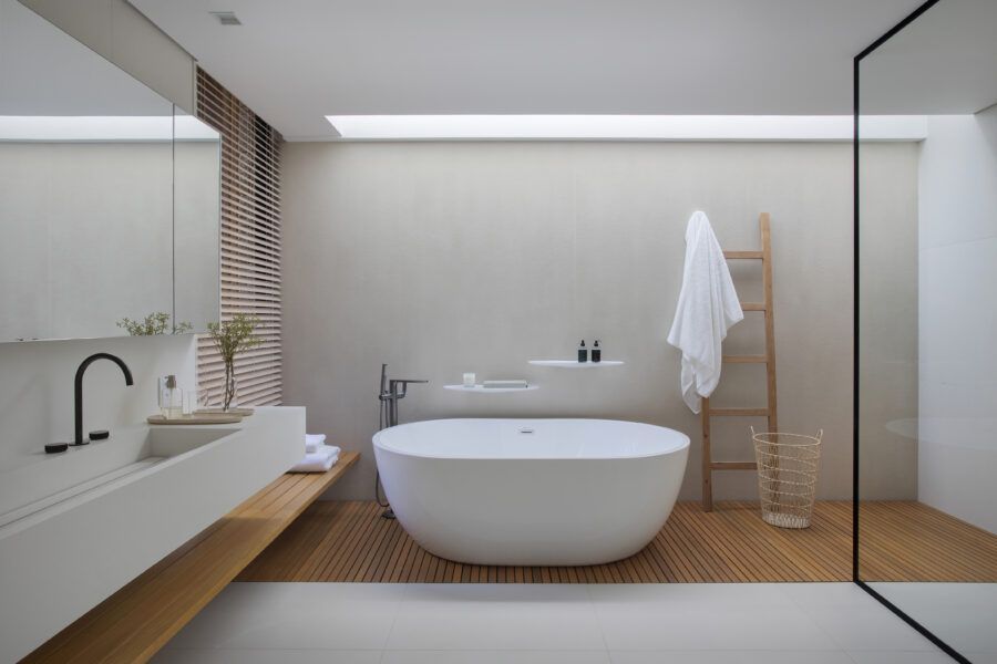 Com projeto arquitetônico assinado por Candido Chutorianscy, a casa foi construída do zero. Por isso, cada mínimo detalhe foi pensado de acordo com a personalidade dos clientes. A suíte do casal, por exemplo, possui uma televisão que pode tanto ser usada no quarto quanto no banheiro, instalada em frente a um painel que divide estes dois cômodos e pode ser oculto. Tudo para atender ao desejo da moradora, que queria um banheiro especial, bem espaçoso e perfeito para se arrumar com as amigas.