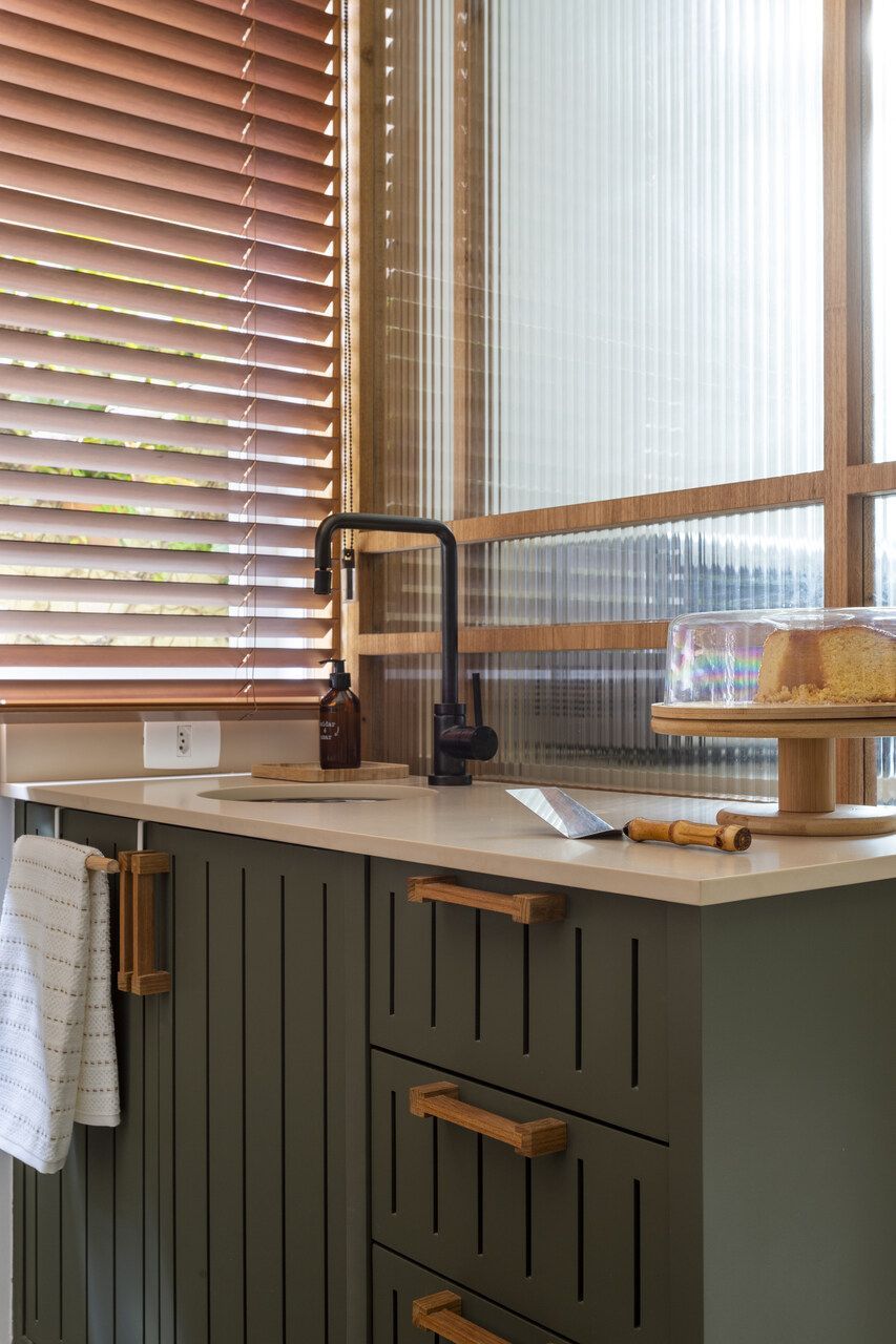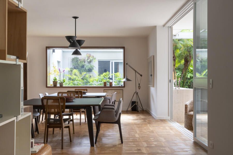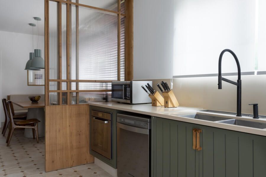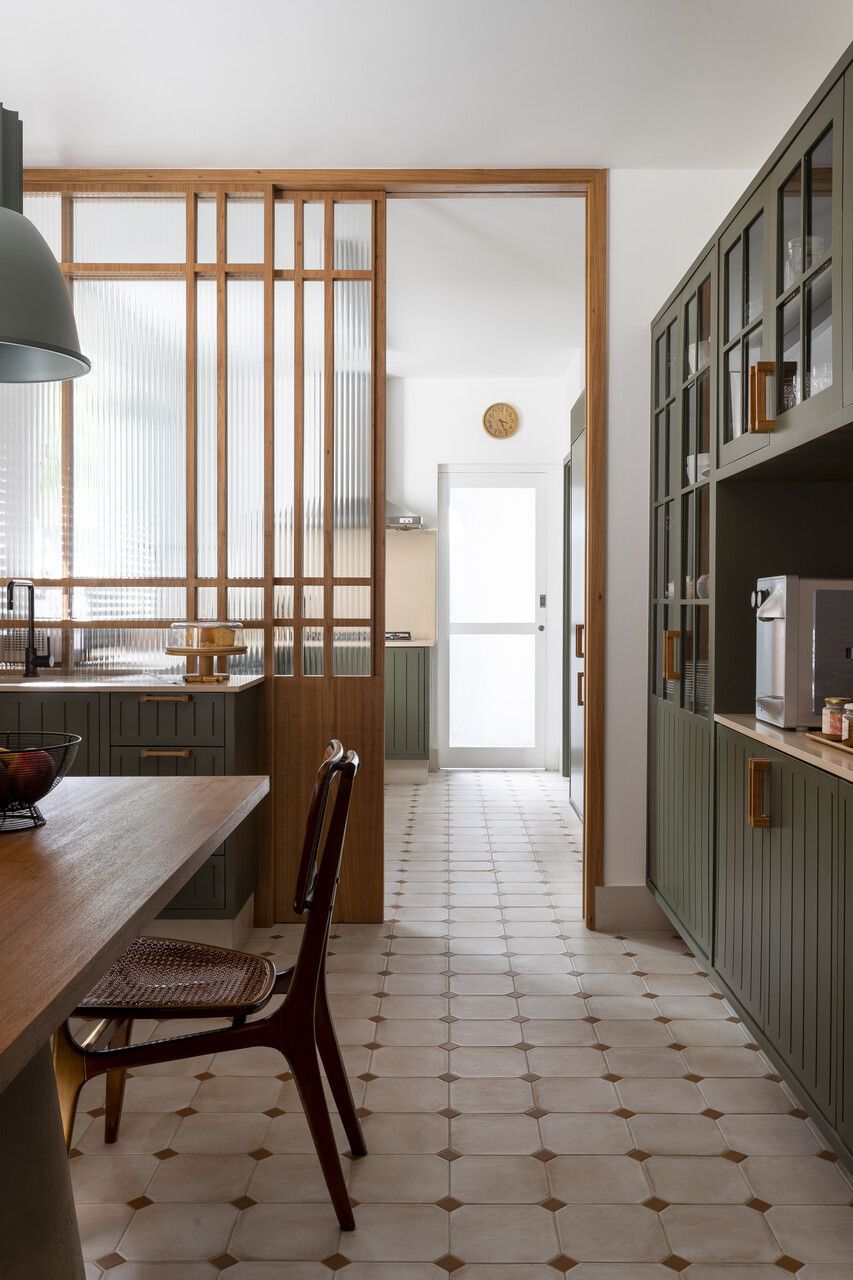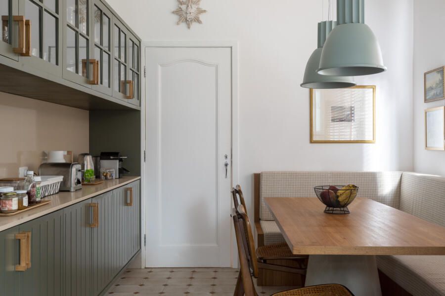 Cacau Ribeiro: A solução foi criar uma circulação única, dando amplitude aos ambientes: na sala de jantar, que antes era um home, abriu-se um grande janelão de vidro fixo, para trazer mais verde para dentro do espaço. Outra porta foi aberta da cozinha para esta sala de jantar, para facilitar o acesso e, também se criou uma cozinha bem charmosa: dividindo um espaço para uma copa, que se transformou no coração da casa! Tudo pensando na praticidade de ter tudo à mão (para a correria do dia a dia, logo cedo com as crianças…), já que a cozinha era bem pequena proporcionalmente ao restante da casa.