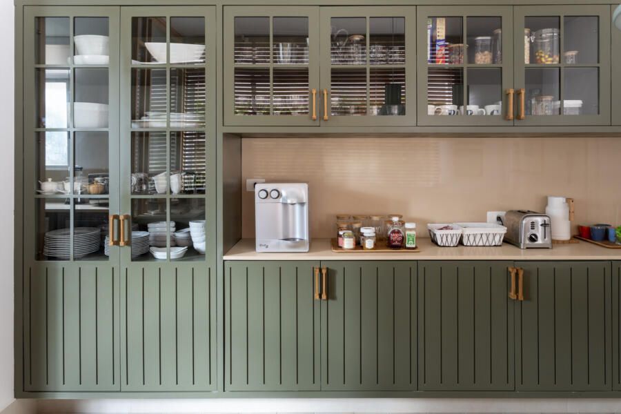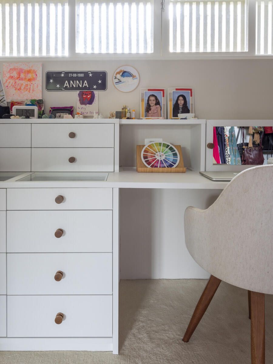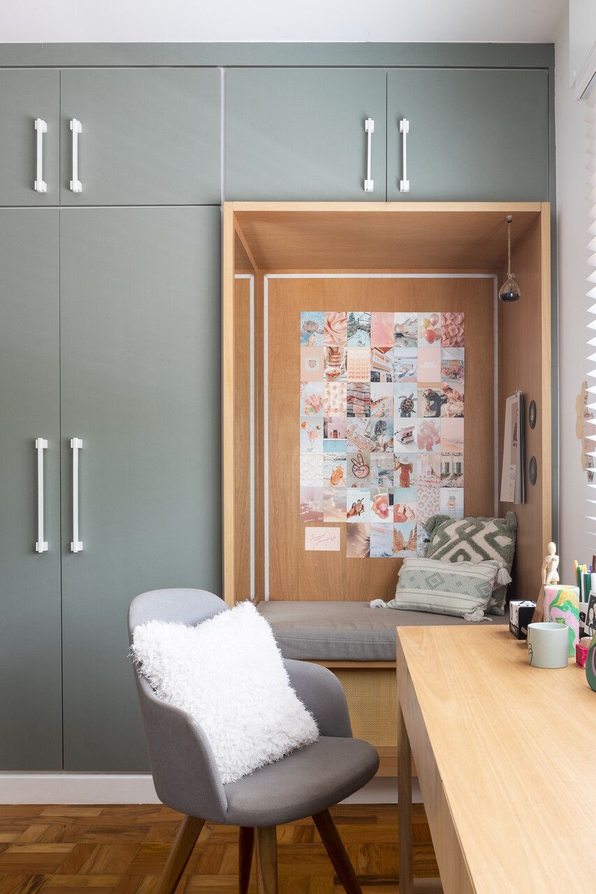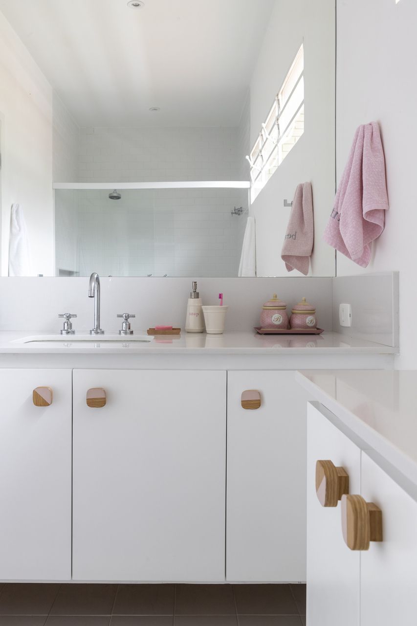 Cacau Ribeiro: A solução foi criar uma circulação única, dando amplitude aos ambientes: na sala de jantar, que antes era um home, abriu-se um grande janelão de vidro fixo, para trazer mais verde para dentro do espaço. Outra porta foi aberta da cozinha para esta sala de jantar, para facilitar o acesso e, também se criou uma cozinha bem charmosa: dividindo um espaço para uma copa, que se transformou no coração da casa! Tudo pensando na praticidade de ter tudo à mão (para a correria do dia a dia, logo cedo com as crianças…), já que a cozinha era bem pequena proporcionalmente ao restante da casa.