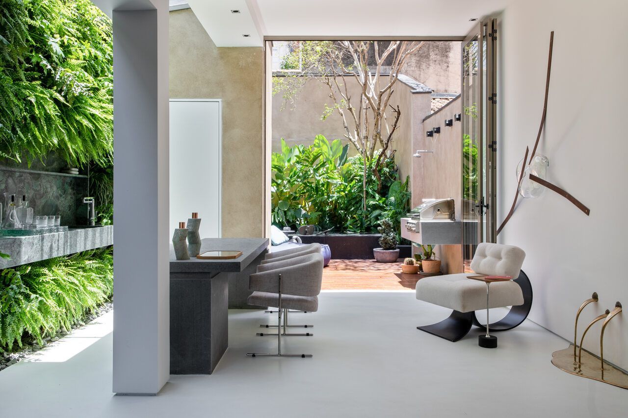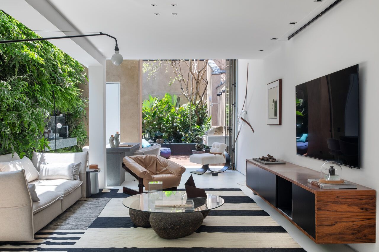 No Open de house vou te mostrar a casa do José Carlos Navarro, no Itaim Bibi, SP. A casa tem 5m de testada x 40 de profundidade, e o tamanho do terreno foi o maior desafio do arquiteto. Ele optou por fazer uma claraboia com um pé direito mais alto uma lateral da sala, e mais um espaço para o bar também com pé direito mais alto.