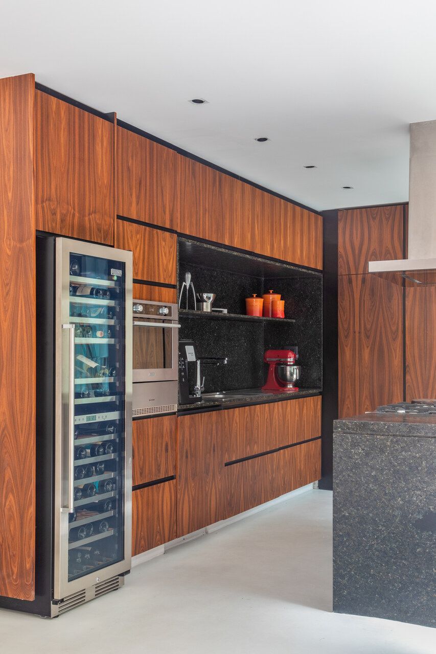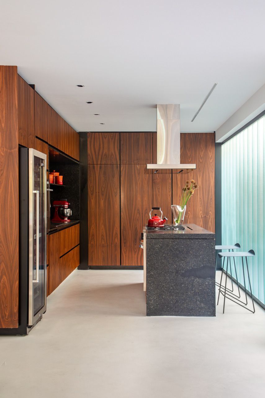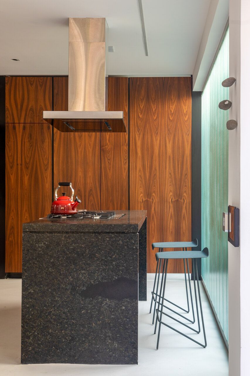 A cozinha é um dos principais destaques da casa, visto que é um espaço para cozinhar com os amigos. Para o piso da sala, era desejado um piso monolítico, a fim de não interferir nas obras de arte que ficassem apoiadas no chão e foi utilizado o cimento queimado. Ainda seguindo essa ideia, foi escolhido um carpete para os quartos.