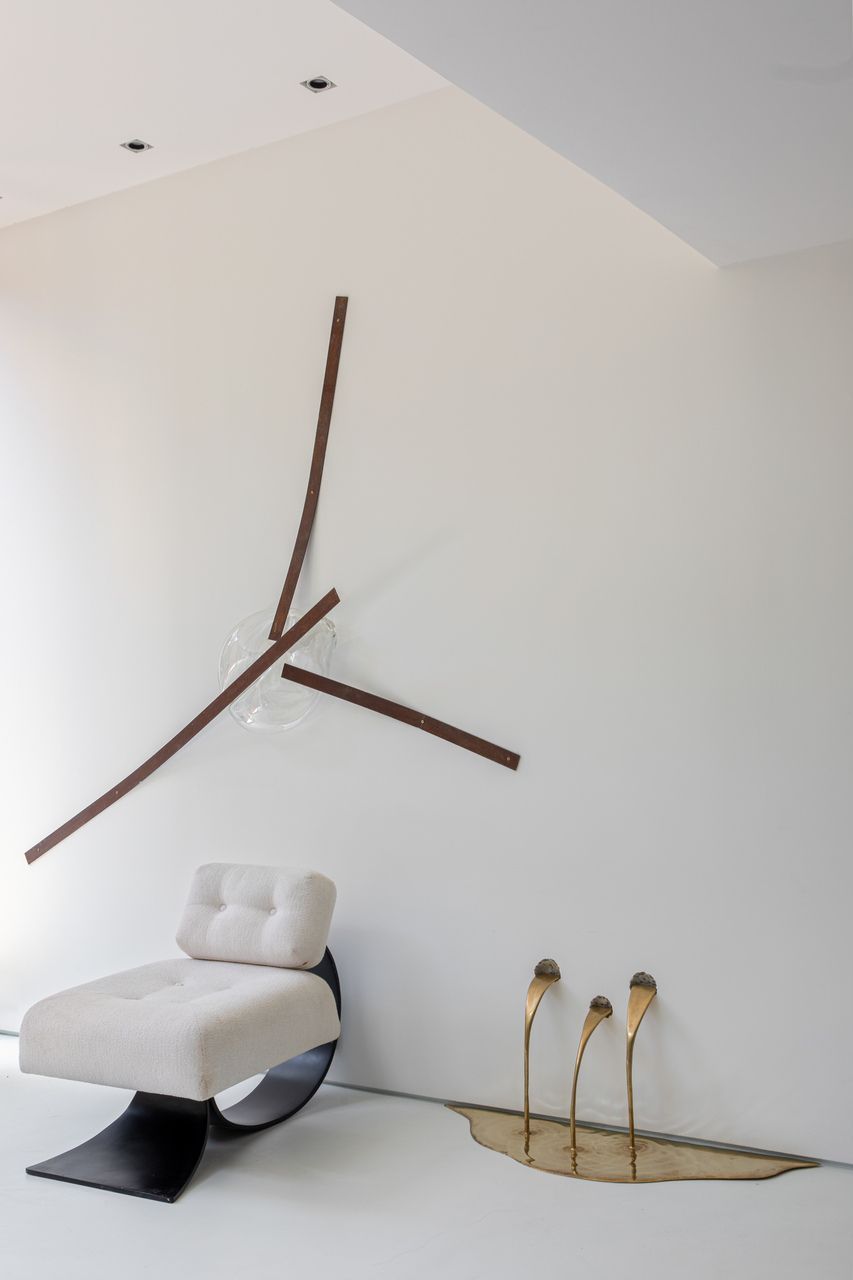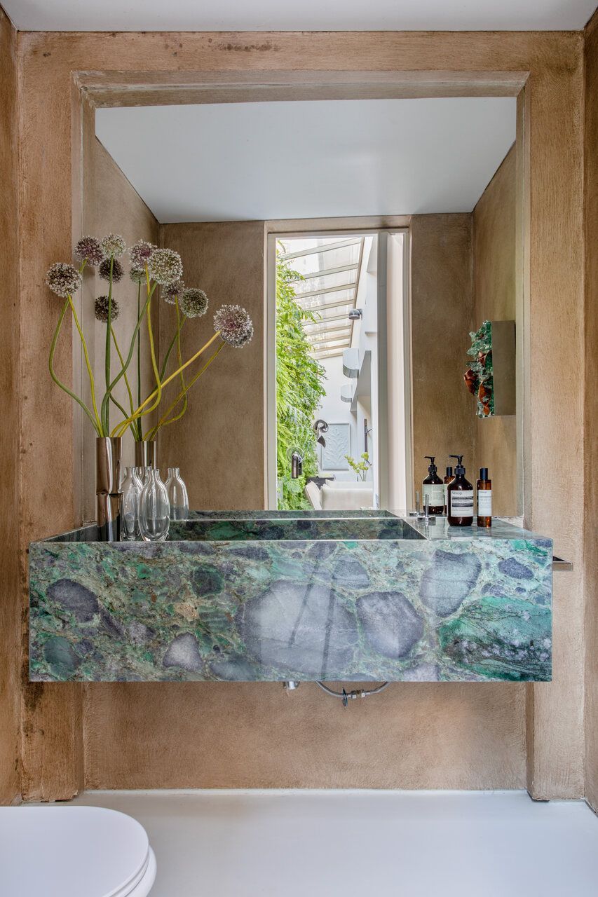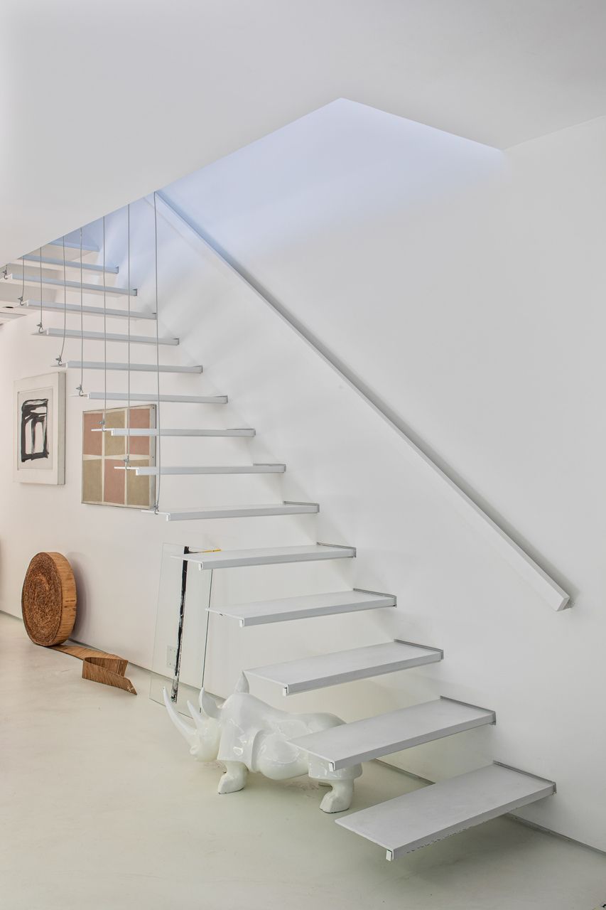 A cozinha é um dos principais destaques da casa, visto que é um espaço para cozinhar com os amigos. Para o piso da sala, era desejado um piso monolítico, a fim de não interferir nas obras de arte que ficassem apoiadas no chão e foi utilizado o cimento queimado. Ainda seguindo essa ideia, foi escolhido um carpete para os quartos.