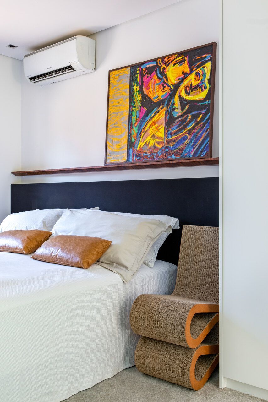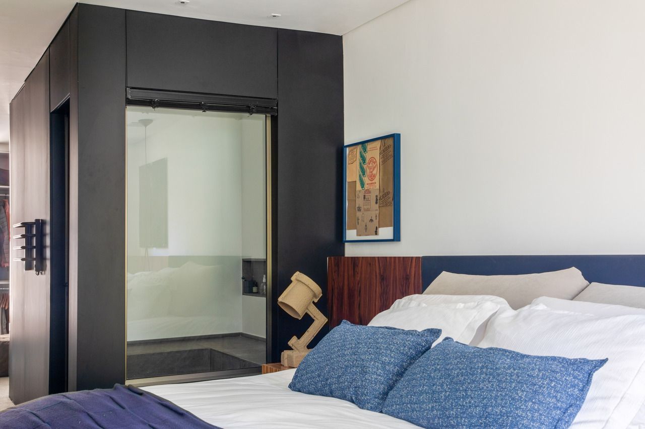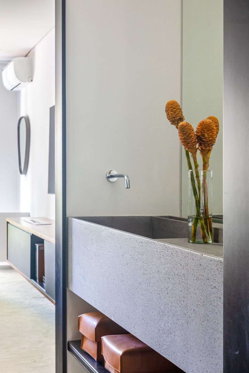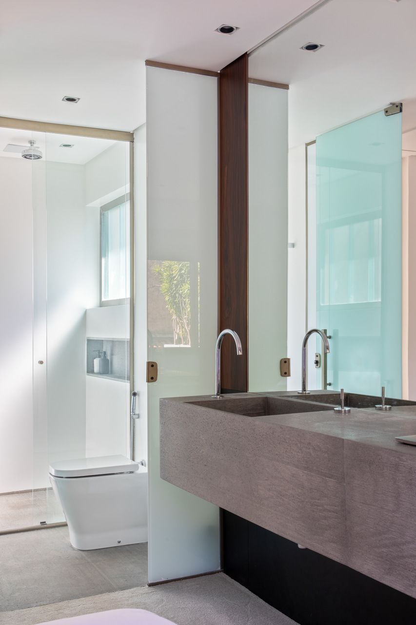 Outro destaque é o chuveiro do quarto do casal, que funciona como sauna. Já na suíte de visitas, a bancada do banheiro fica no quarto, permitindo o uso da bancada enquanto outra pessoa está tomando banho/usando o banheiro.