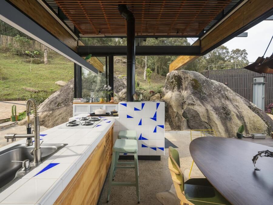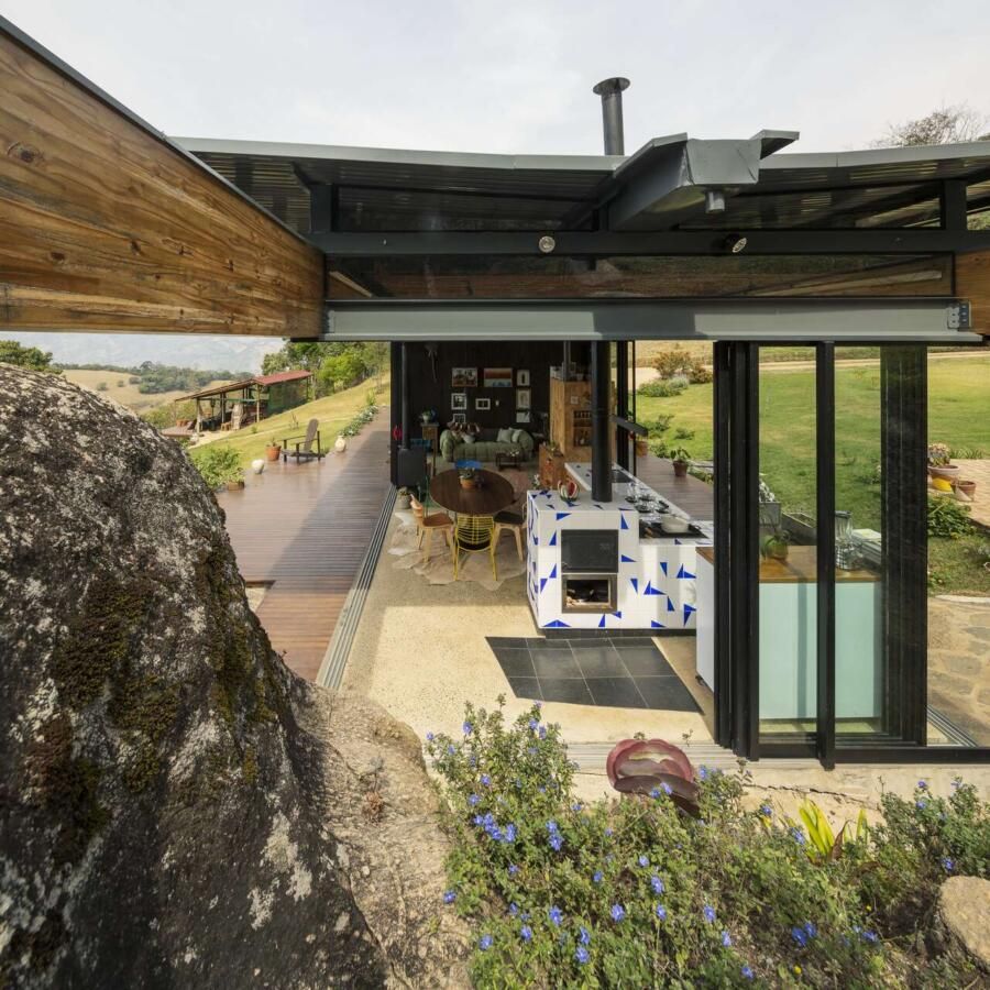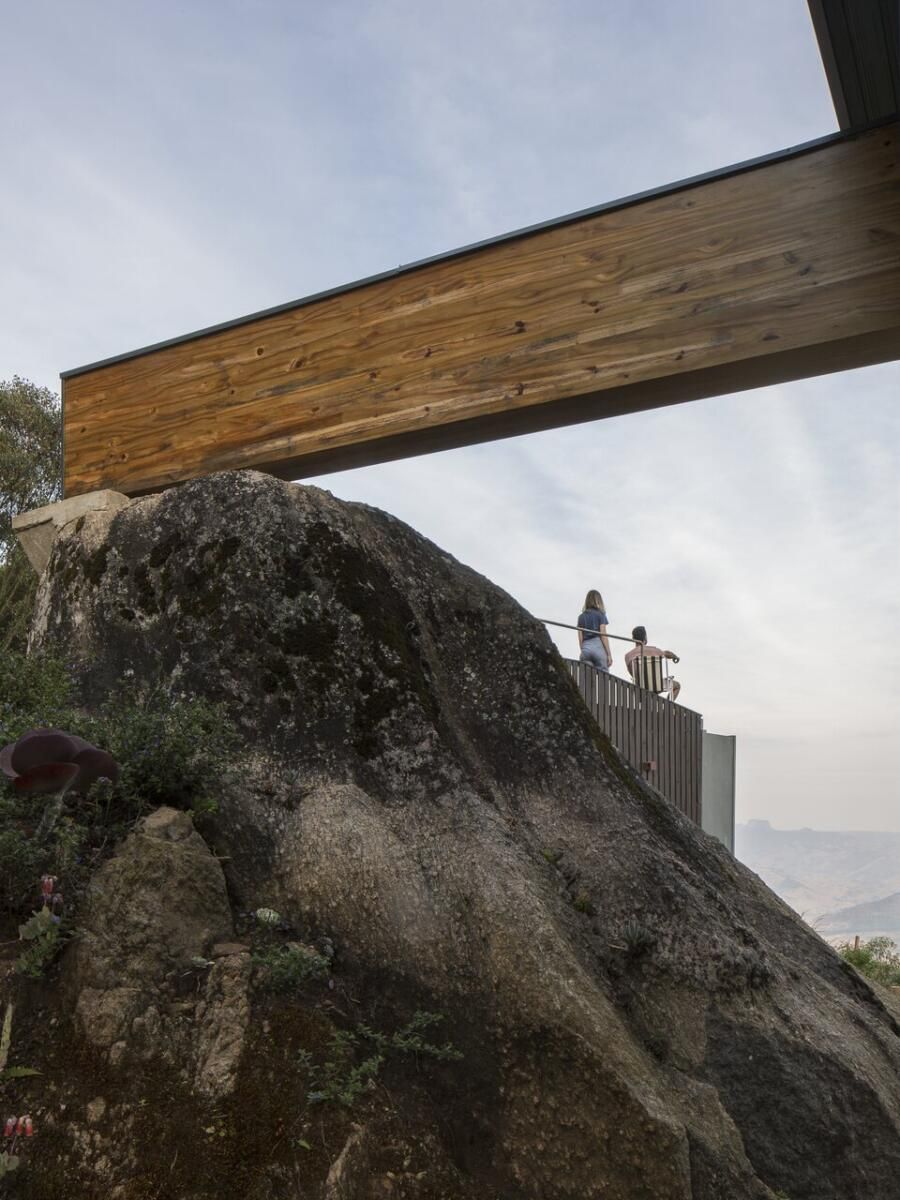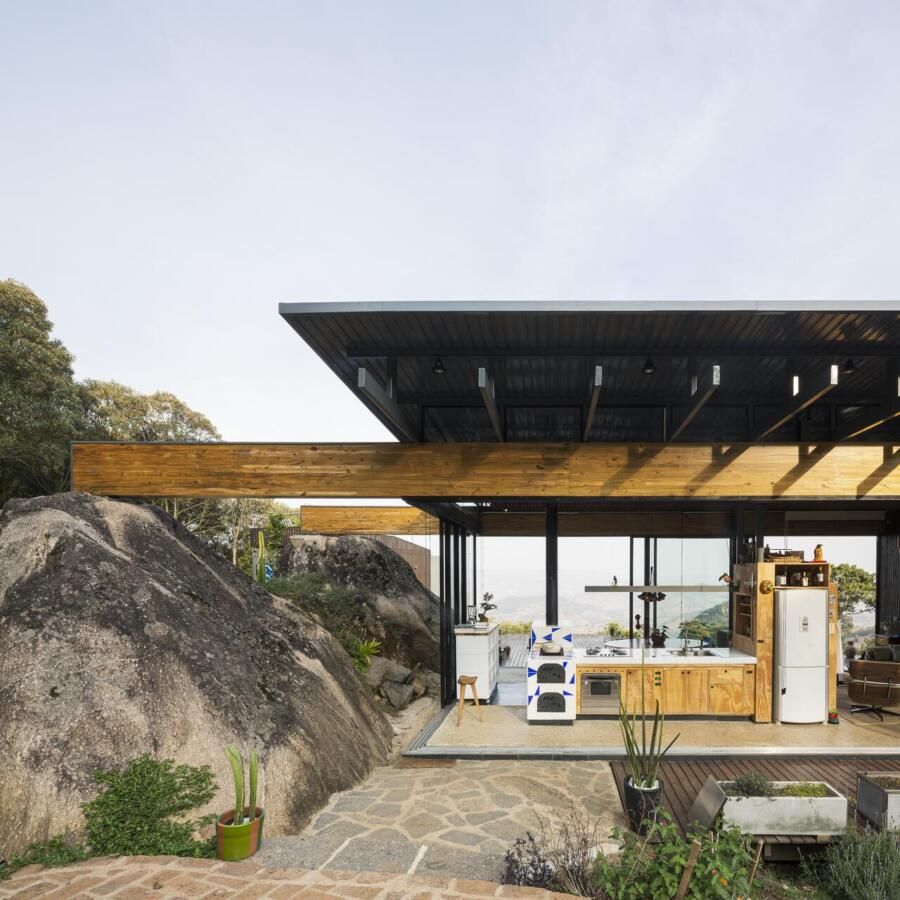“As pedras do terreno, de cerca de cinco metros de altura, são os pilares para as vigas da cobertura, criando um vão para a vista da serra. ”