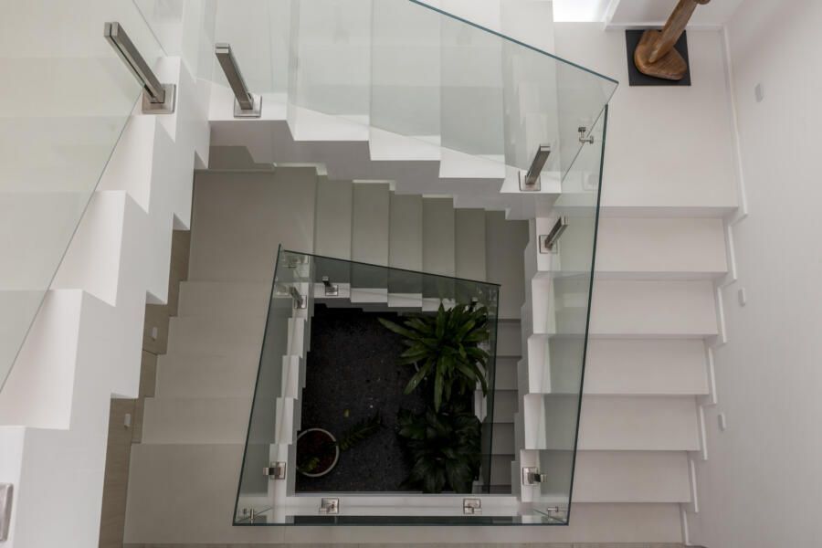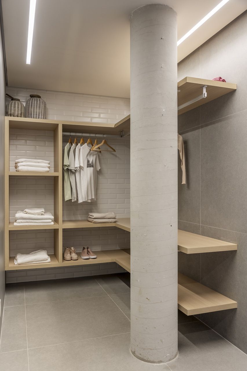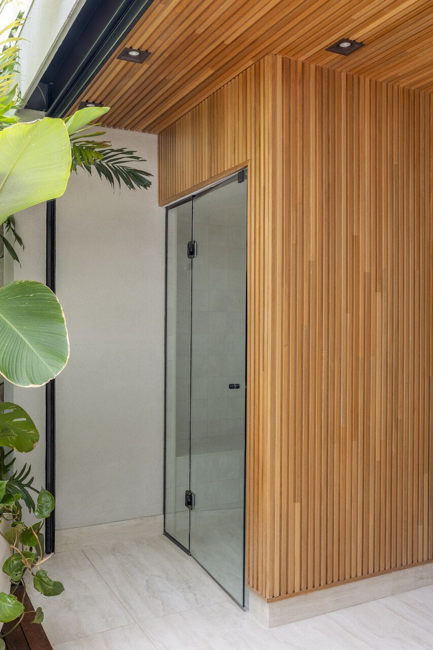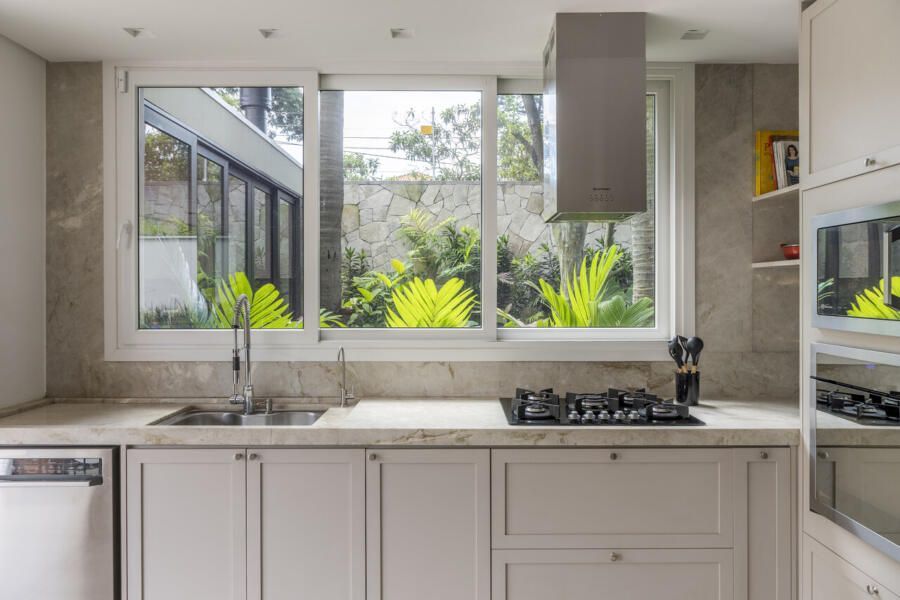 O projeto tem um estilo moderno e conta com várias modificações arquitetônicas. A ampliação do banheiro do casal e do closet, que ocuparam parte do quarto de hóspedes, otimizou os espaços. A lavanderia também foi ampliada, e a garagem foi transformada em escritório.