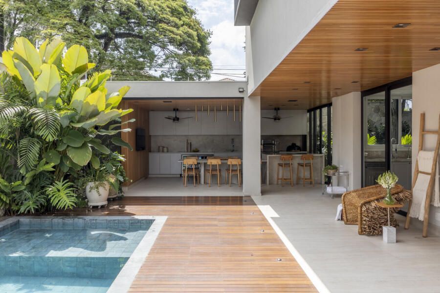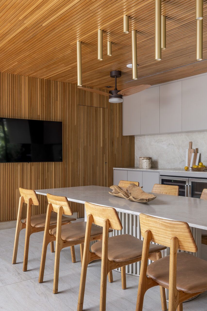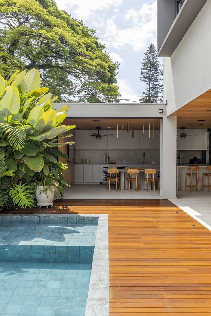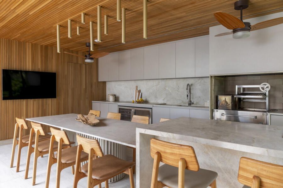 A sala de jantar foi realocada para a área gourmet, que agora conta com uma sauna voltada para a piscina, churrasqueira, parrilheira e toldo retrátil. Já a sala de estar foi reservada para um ambiente mais tranquilo para os adultos, com uma lareira suspensa como ponto central.