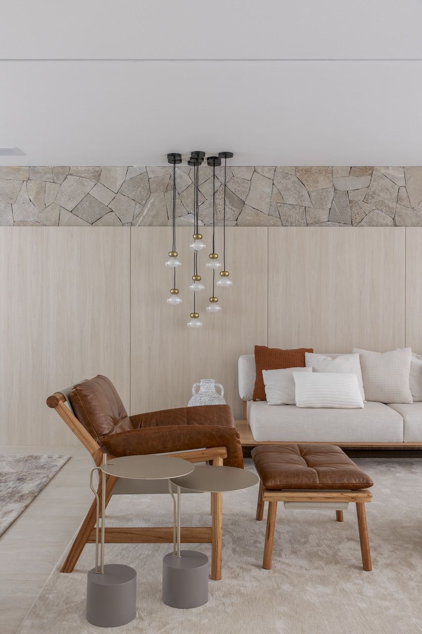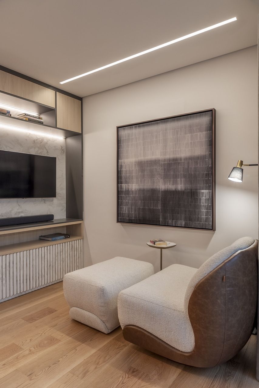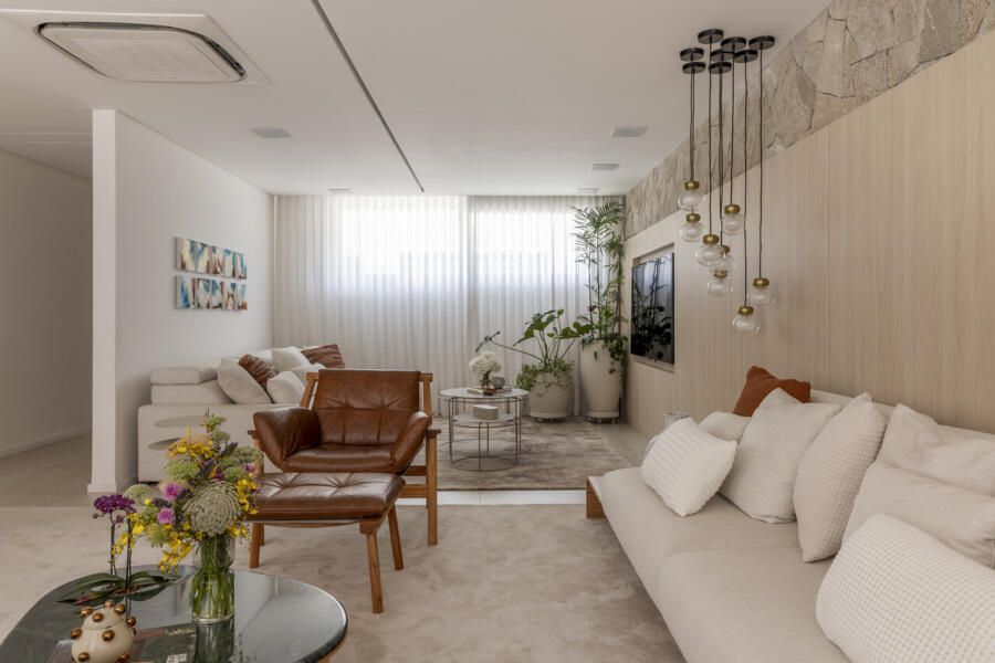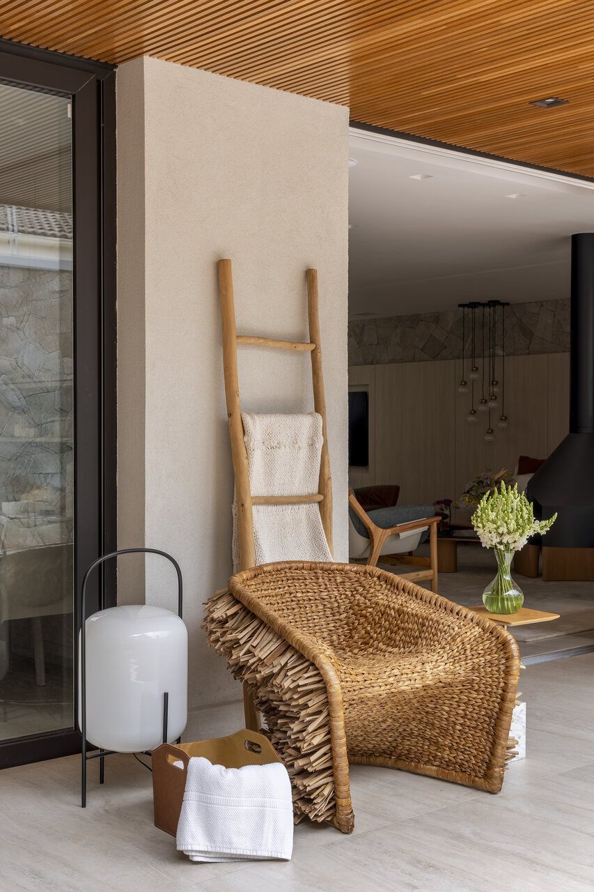 A sala de jantar foi realocada para a área gourmet, que agora conta com uma sauna voltada para a piscina, churrasqueira, parrilheira e toldo retrátil. Já a sala de estar foi reservada para um ambiente mais tranquilo para os adultos, com uma lareira suspensa como ponto central.