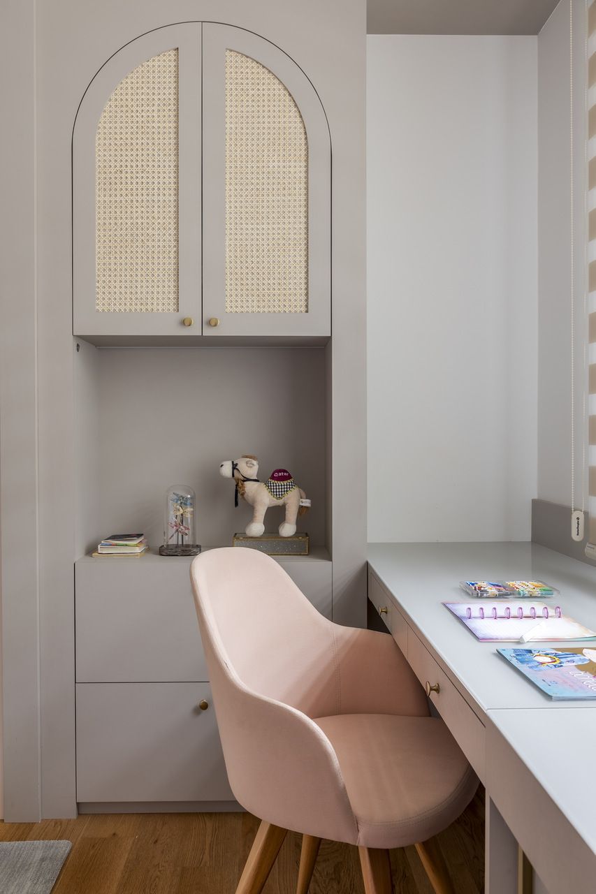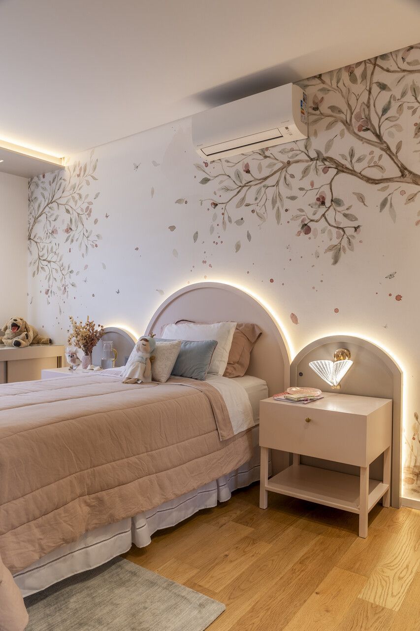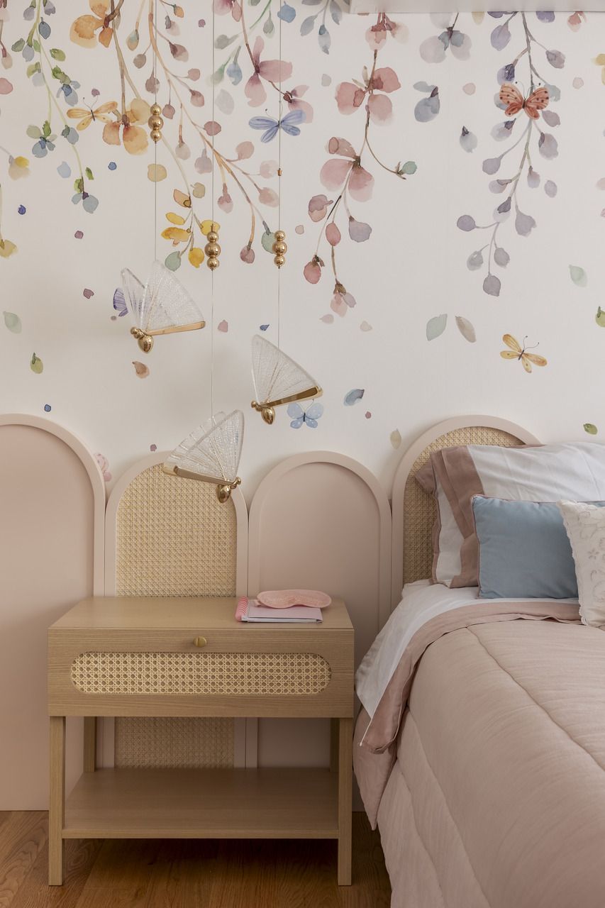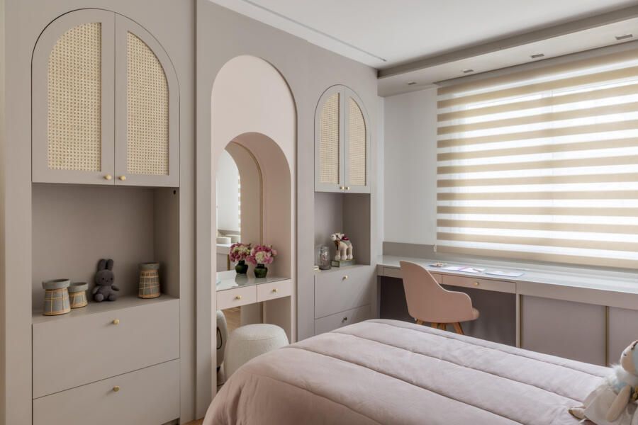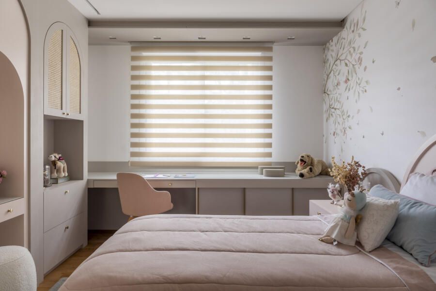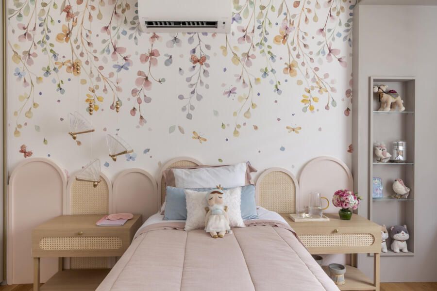 Os quartos das crianças são parecidos, mas mantém a personalidade de cada filha. E o ambiente foi pensado para durar e inclui penteadeira e papel de parede que vai acompanhar o crescimento delas.