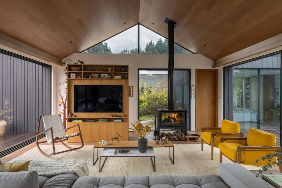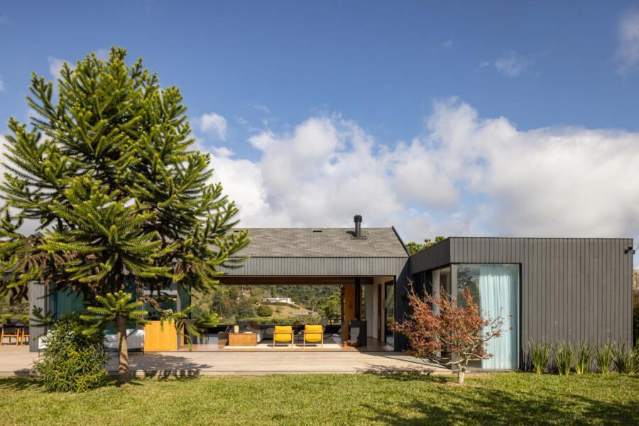 A inspiração veio da ideia de abrigo: uma arquitetura acolhedora, quase arquetípica, que se traduz em formas simples e reconhecíveis — como o telhado de duas águas que coroa o volume principal. Essa geometria clara e afetiva evoca a imagem de uma cabana no meio da floresta, ao mesmo tempo em que se abre de forma generosa para a paisagem do vale.