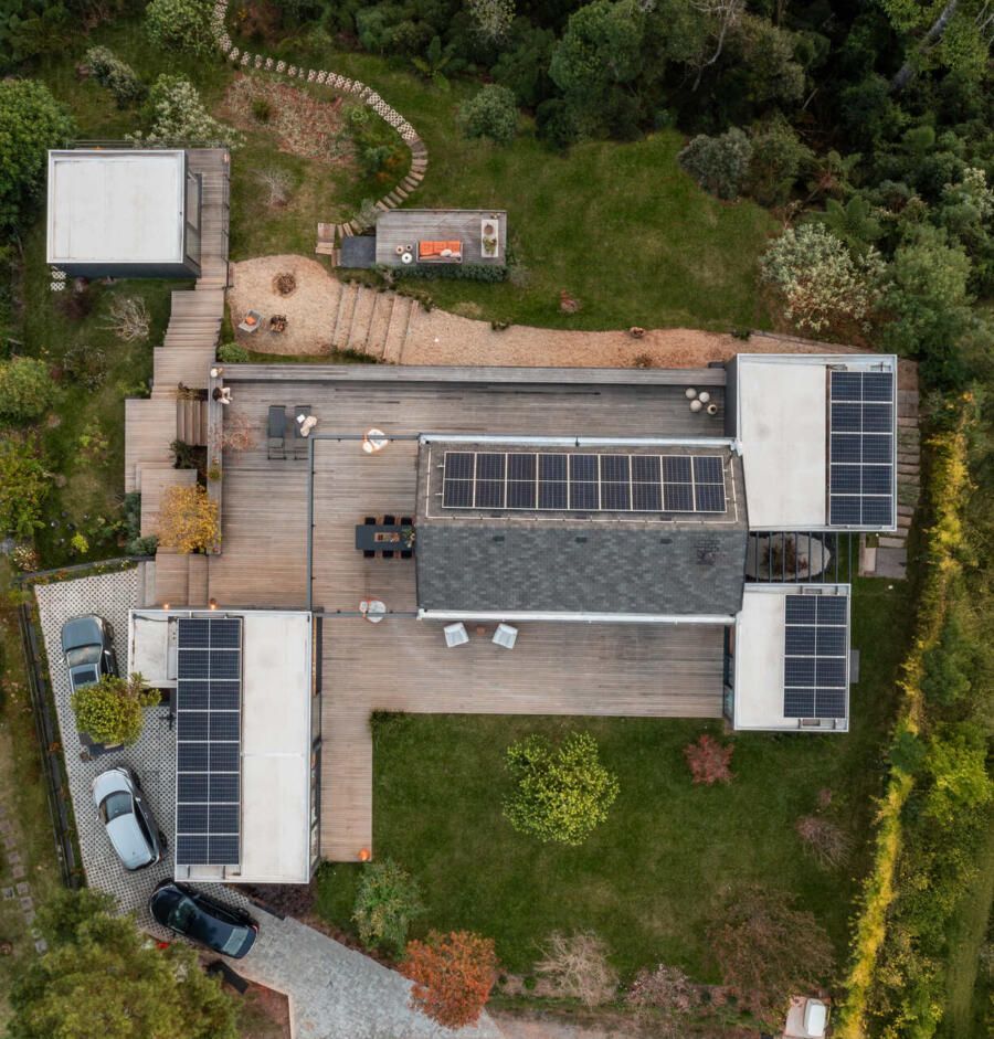 A residência é um exemplo de arquitetura comprometida com a sustentabilidade, tanto nos materiais quanto nas soluções técnicas: placas fotovoltaicas para geração de energia, aquecimento solar da água, captação e reuso de água da chuva, tratamento de águas cinzas, ventilação cruzada e insolação estratégica, dispensando climatização artificial, e uso de materiais locais e madeira certificada.