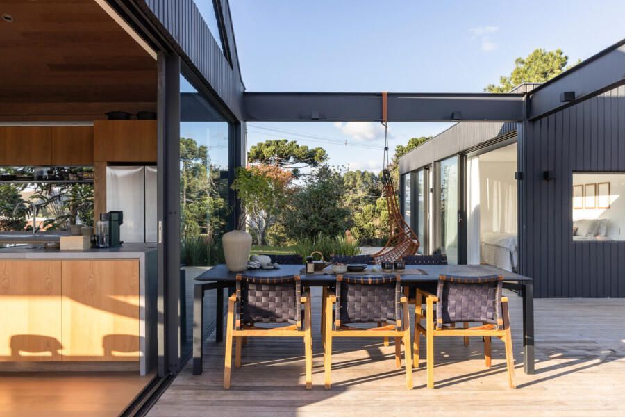 O volume principal reúne sala de estar, jantar e cozinha em um espaço fluido e totalmente integrado — um destaque do projeto. Nas laterais, quatro suítes foram distribuídas em dois blocos: duas suítes ficam em um volume separado, ideal para receber os filhos em suas visitas; outra suíte funciona como escritório; e a suíte master foi posicionada para aproveitar ao máximo a vista e a privacidade.