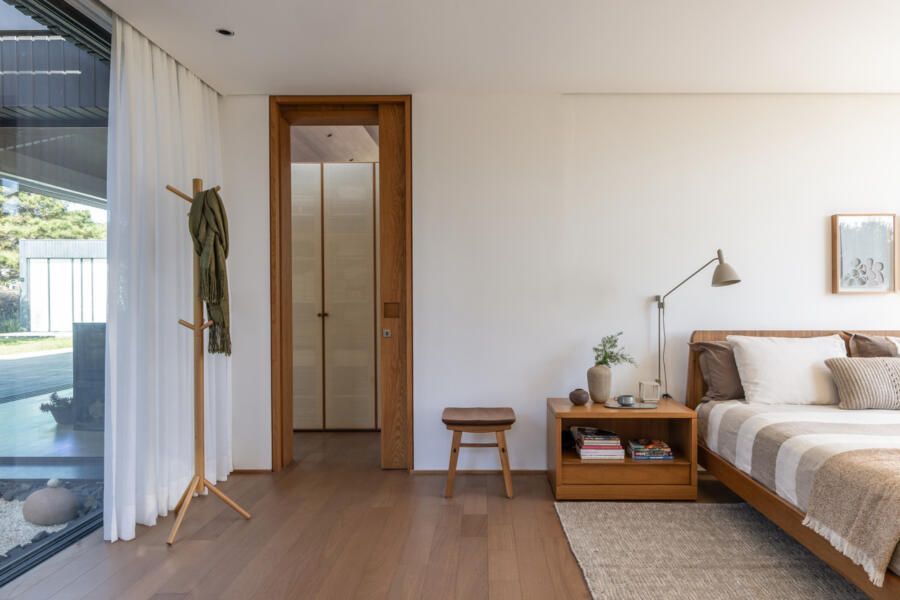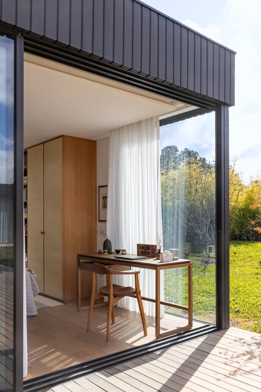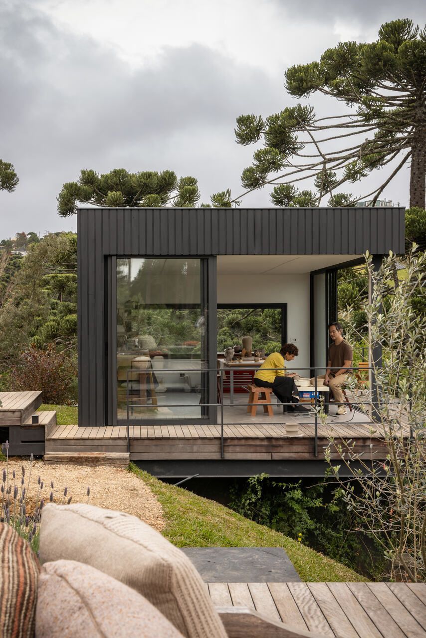 Um volume adicional, mais escondido entre as árvores, abriga o ateliê de cerâmica de Diane e sua filha. Essa edificação autônoma amplia a experiência da casa como lugar de criação e contemplação, onde a arte dialoga diretamente com o entorno.
