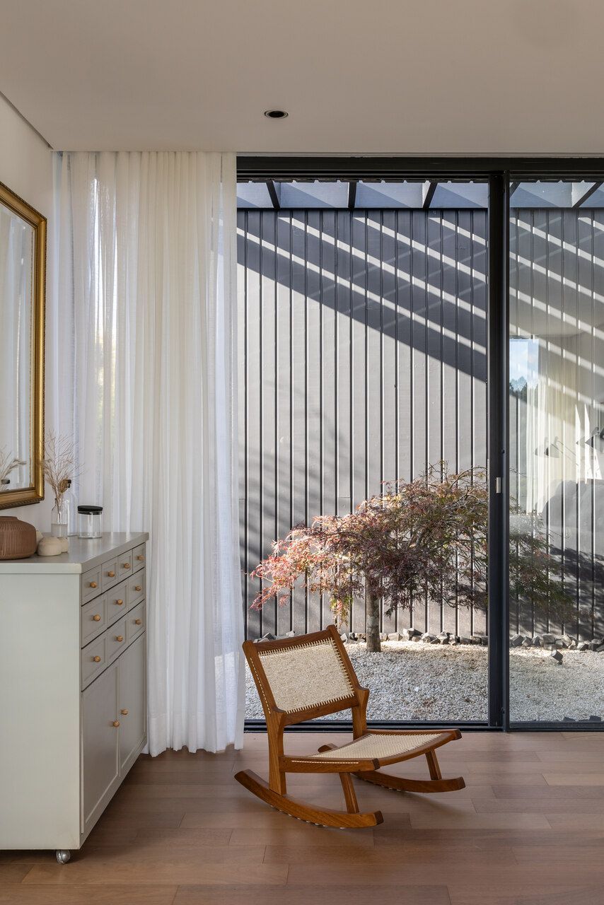 A casa foi organizada em uma planta em formato de “U”, com os blocos levemente deslocados entre si para favorecer a circulação de ar, a entrada de luz natural e a criação de pátios internos. No centro da composição, um pátio voltado para o vale serve como espaço de transição entre os ambientes internos e a natureza ao redor.
