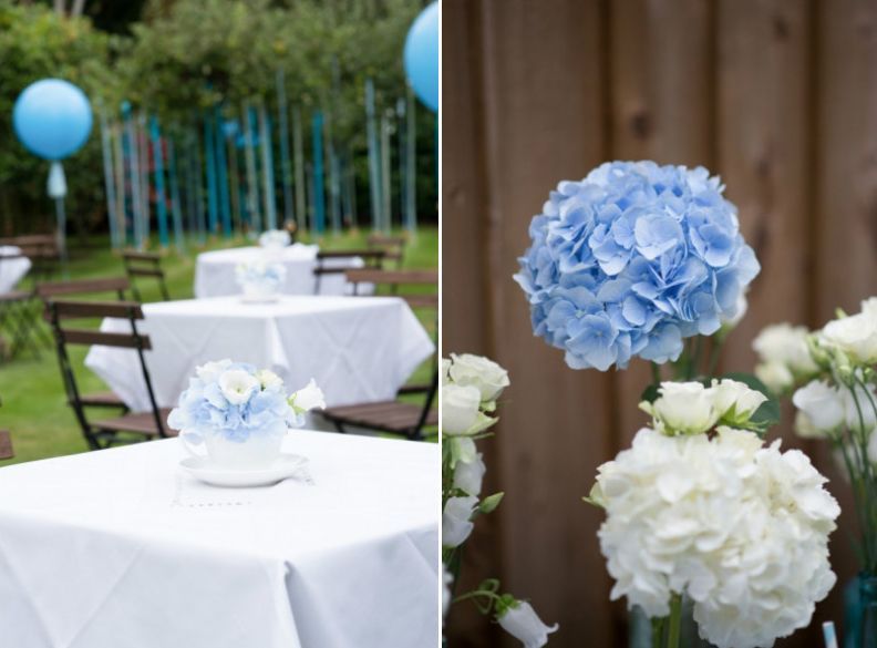 Quando vi as fotos desse chá de bebê no The Pretty Blog fiquei simplesmente encantada. A recepção ao ar livre manteve o tema infantil, mas de uma forma leve, sem pesar a mão, sabe? A decoração impecável conta com bandeirolas, arranjos de hortênsias em xícaras de chá e garrafas, bandejas de prata e para completar, cavalinhos de balanço e ursinhos de pelúcia – uma graça! A mãe optou pela tradicional paleta em tons de azul e branco: não tem erro, é superharmonioso e ajuda a deixar o cenário com um toque mais requintado.