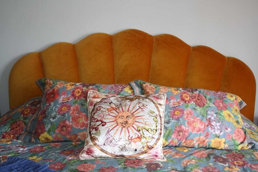 - Cabeceira colorida e aveludada: