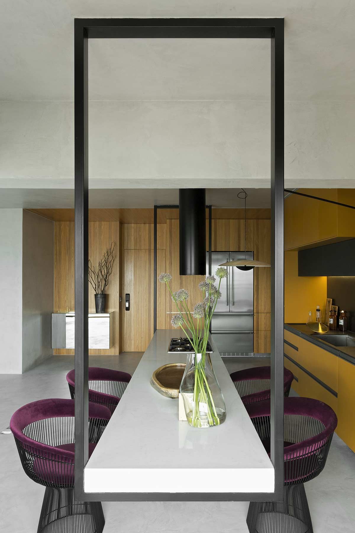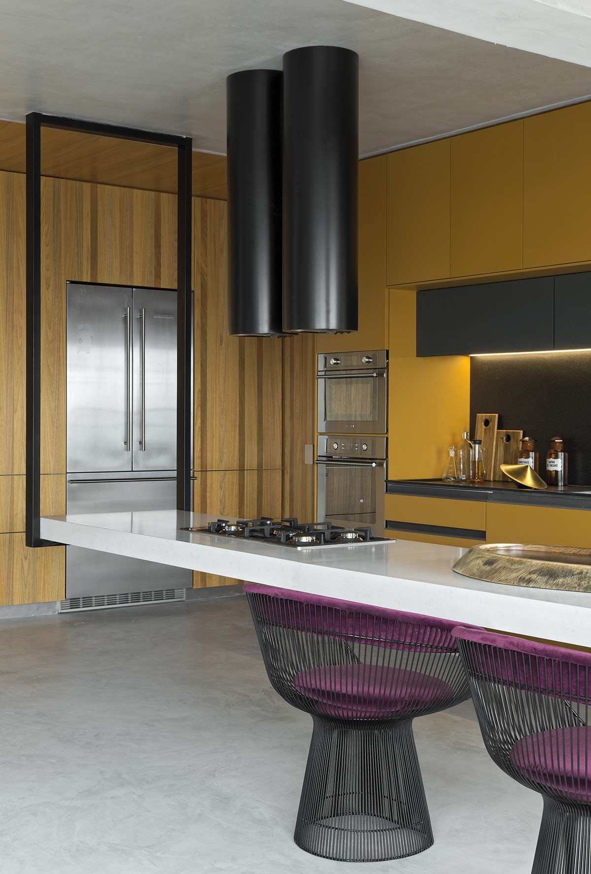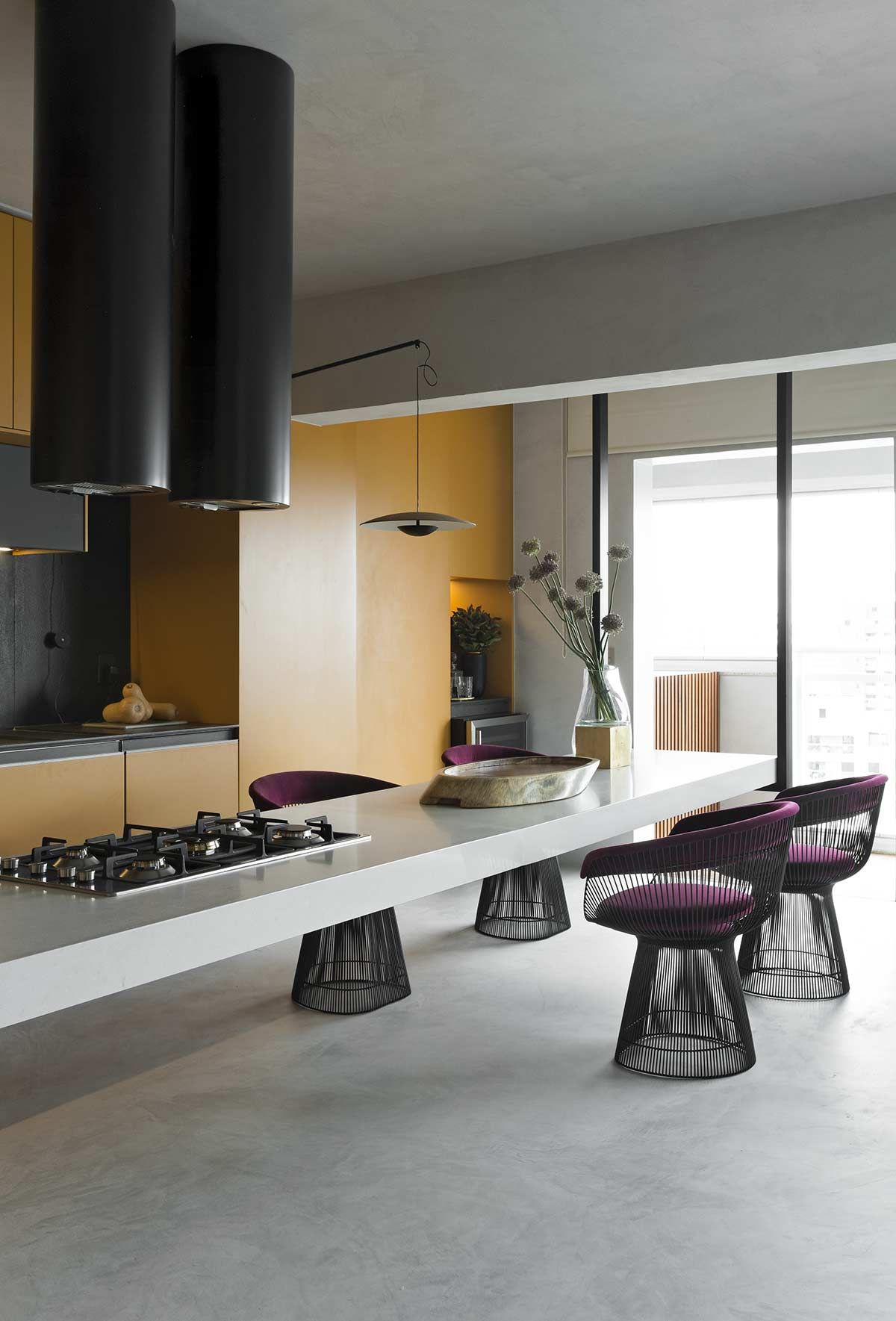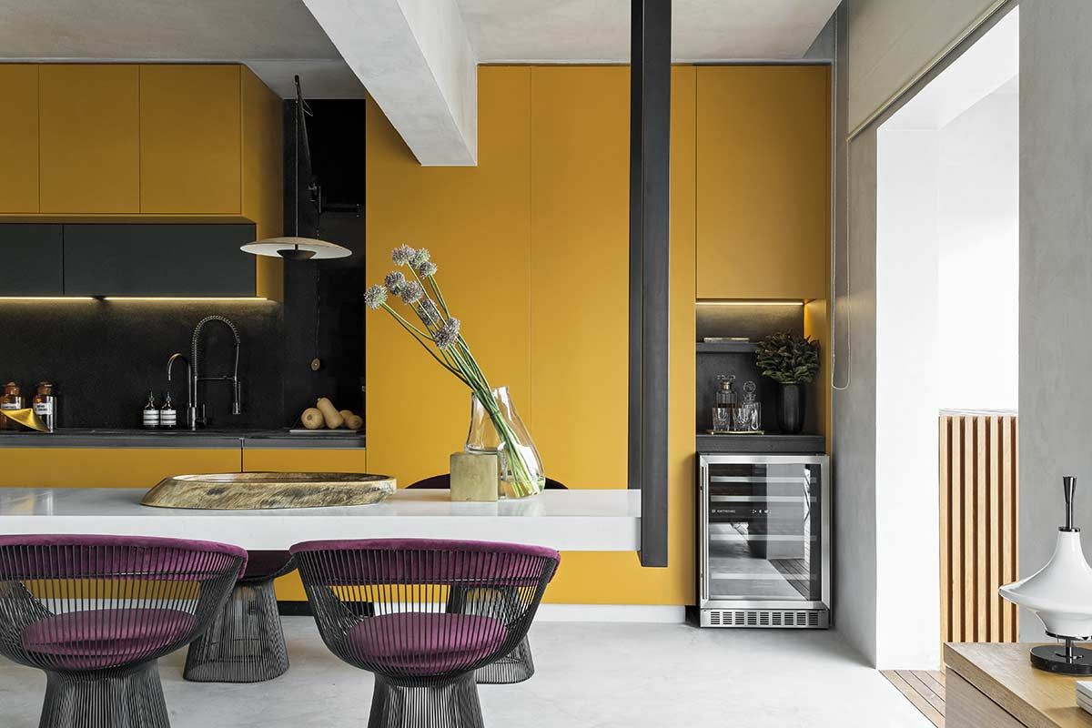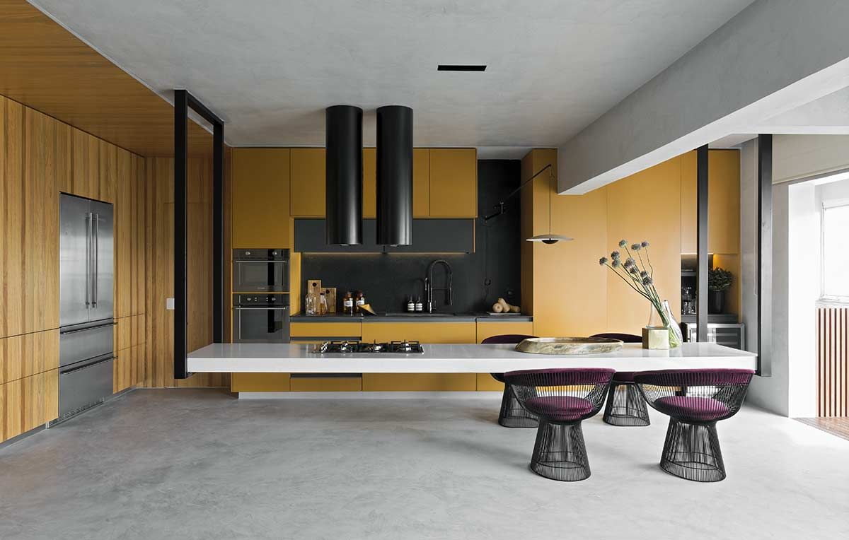 Esta cozinha projetada pelo arquiteto Diego Revollo voa alto das cozinhas tradicionais. Idealizada para um jovem solteiro, o cômodo traz diferenciais como uma ilha com mais de 4 metros de comprimento que paira acima do chão, e a marcenaria em tom mostarda contrastando com o preto, a madeira e o piso e paredes em cimento queimado. O cinza reflete a luz natural e confere uma atmosfera industrial nada óbvia.