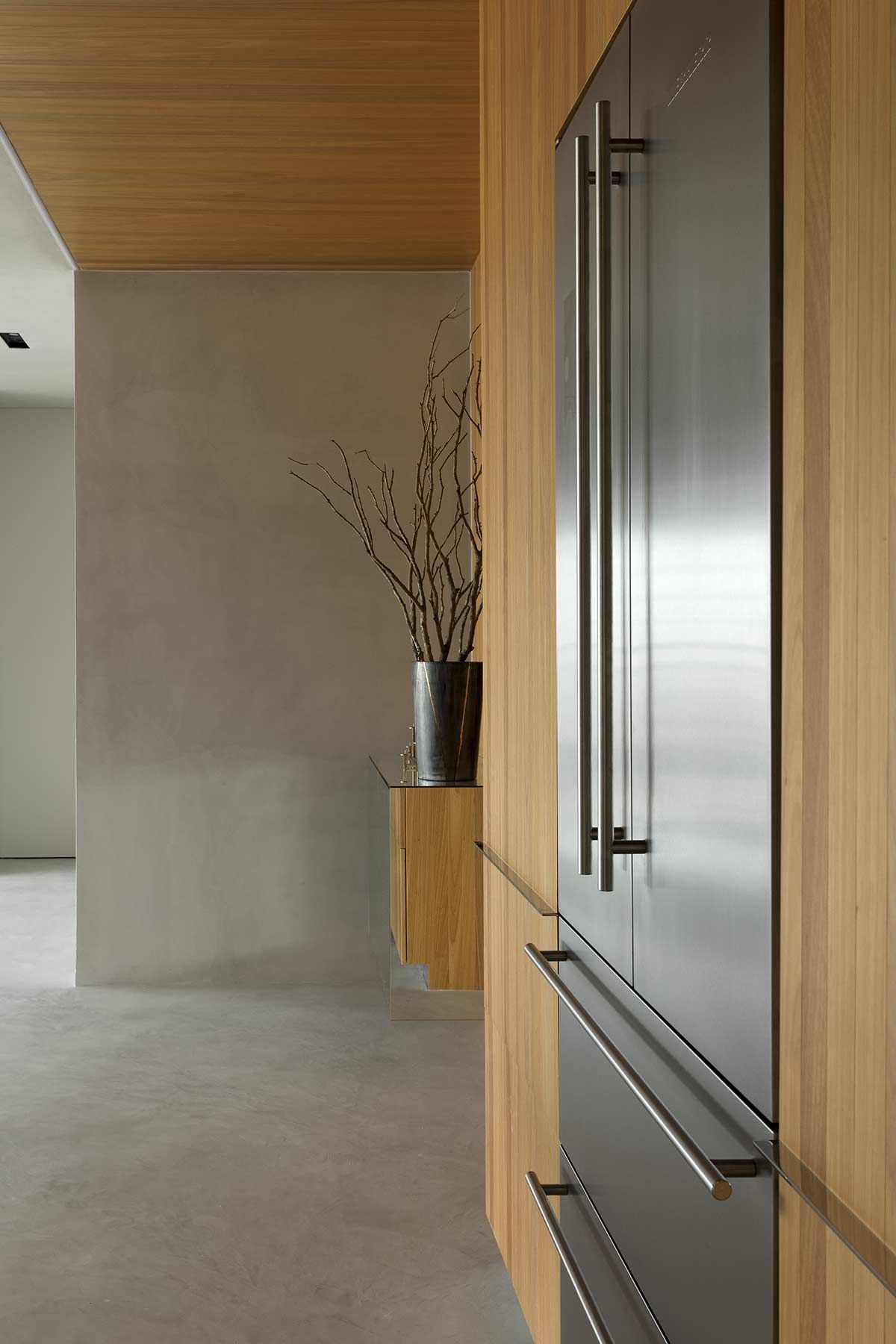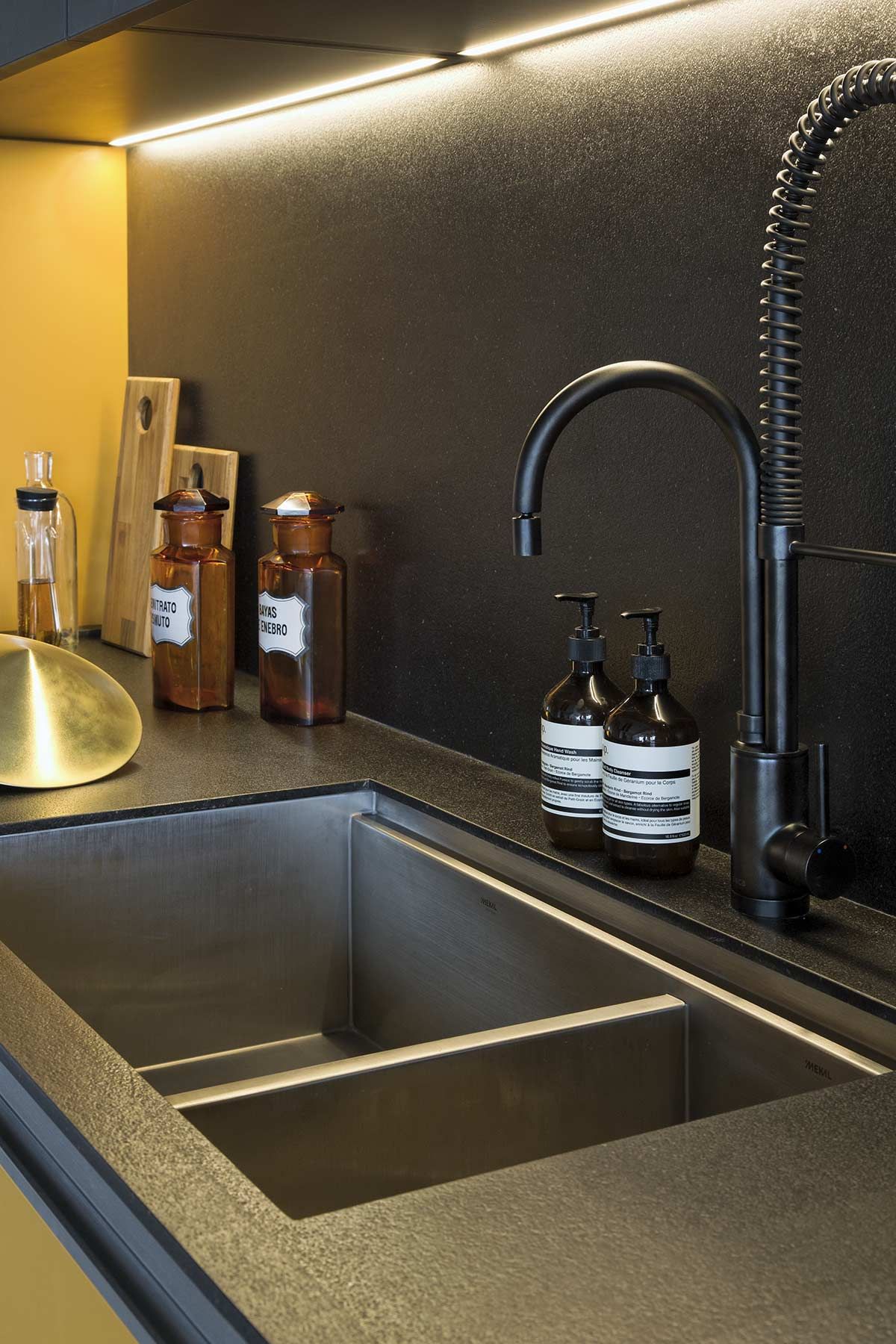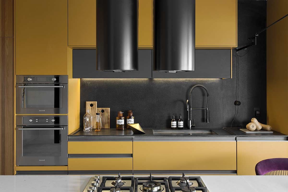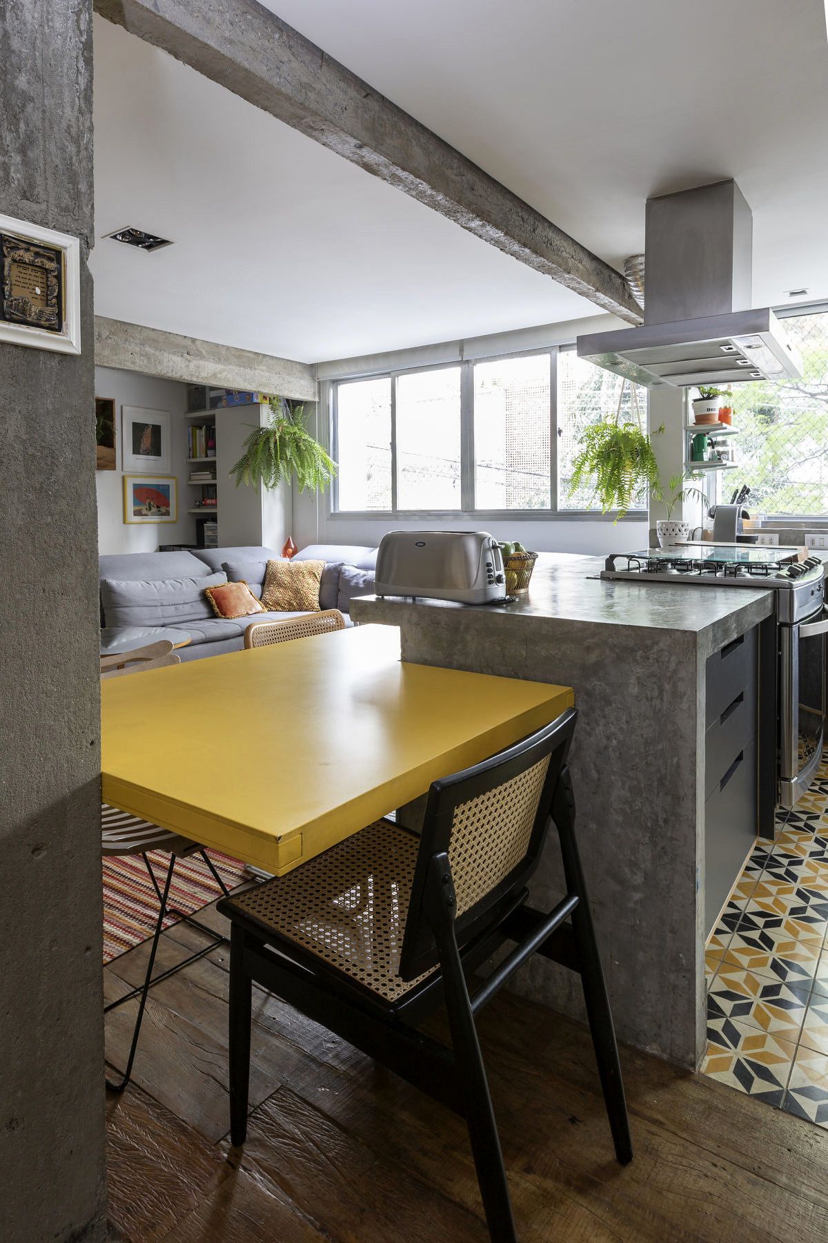Esta cozinha projetada pelo arquiteto Diego Revollo voa alto das cozinhas tradicionais. Idealizada para um jovem solteiro, o cômodo traz diferenciais como uma ilha com mais de 4 metros de comprimento que paira acima do chão, e a marcenaria em tom mostarda contrastando com o preto, a madeira e o piso e paredes em cimento queimado. O cinza reflete a luz natural e confere uma atmosfera industrial nada óbvia.