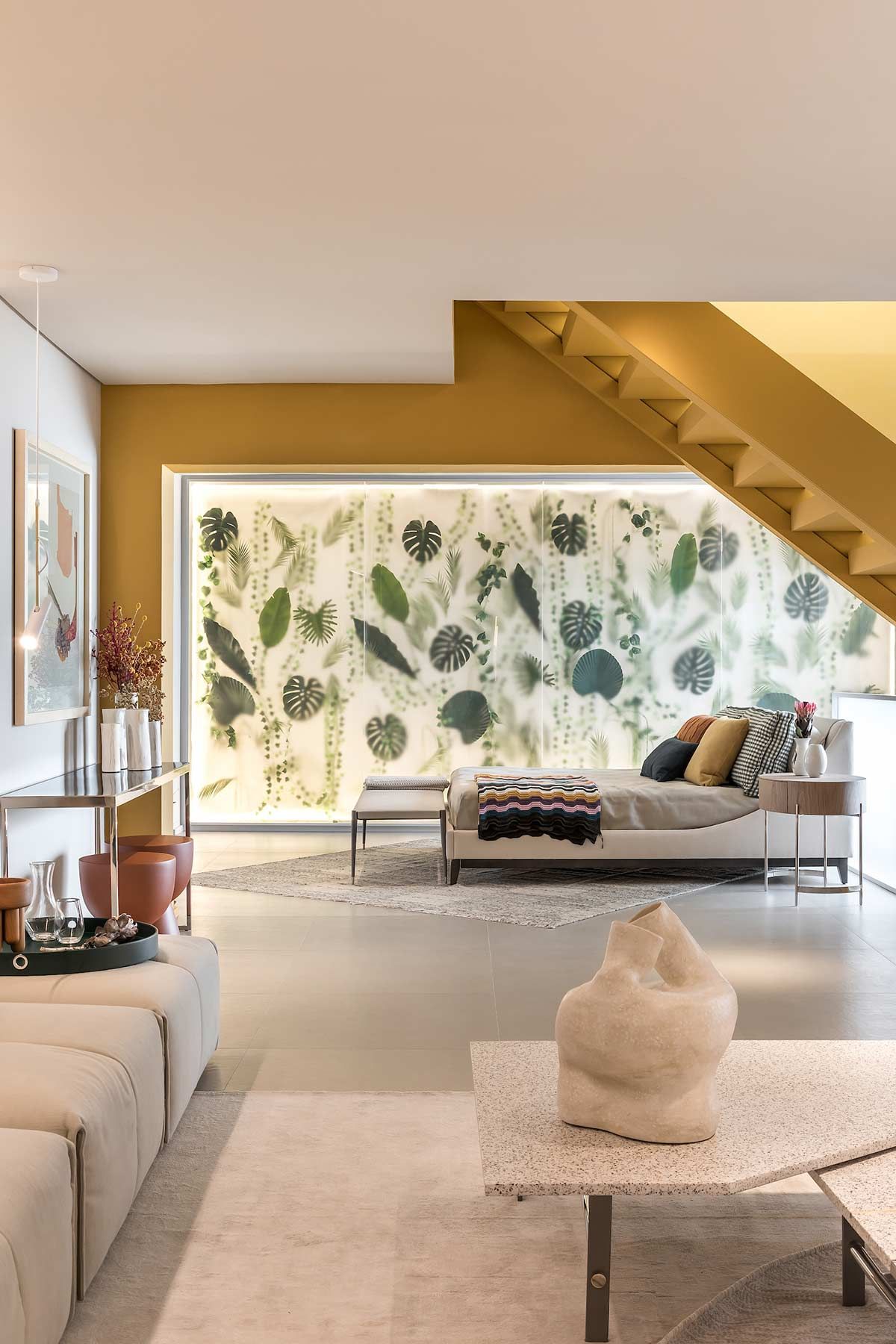 Leve e aconchegante, essa são as sensações que o cinza e o amarelo transmitem neste projeto da Talita Nogueira Arquitetura. A pintura geométrica é uma grande aliada de quem busca mudar um cômodo rapidamente, como nesse caso em que um tom mais calmo de amarelo foi escolhido para dar movimento à sala de jantar. O cinza no piso, na parede, sofá, cama, itens têxteis e objetos decorativos, perpetua a sobriedade da proposta e acentua o protagonismo da escada, que também foi colorida com amarelo.