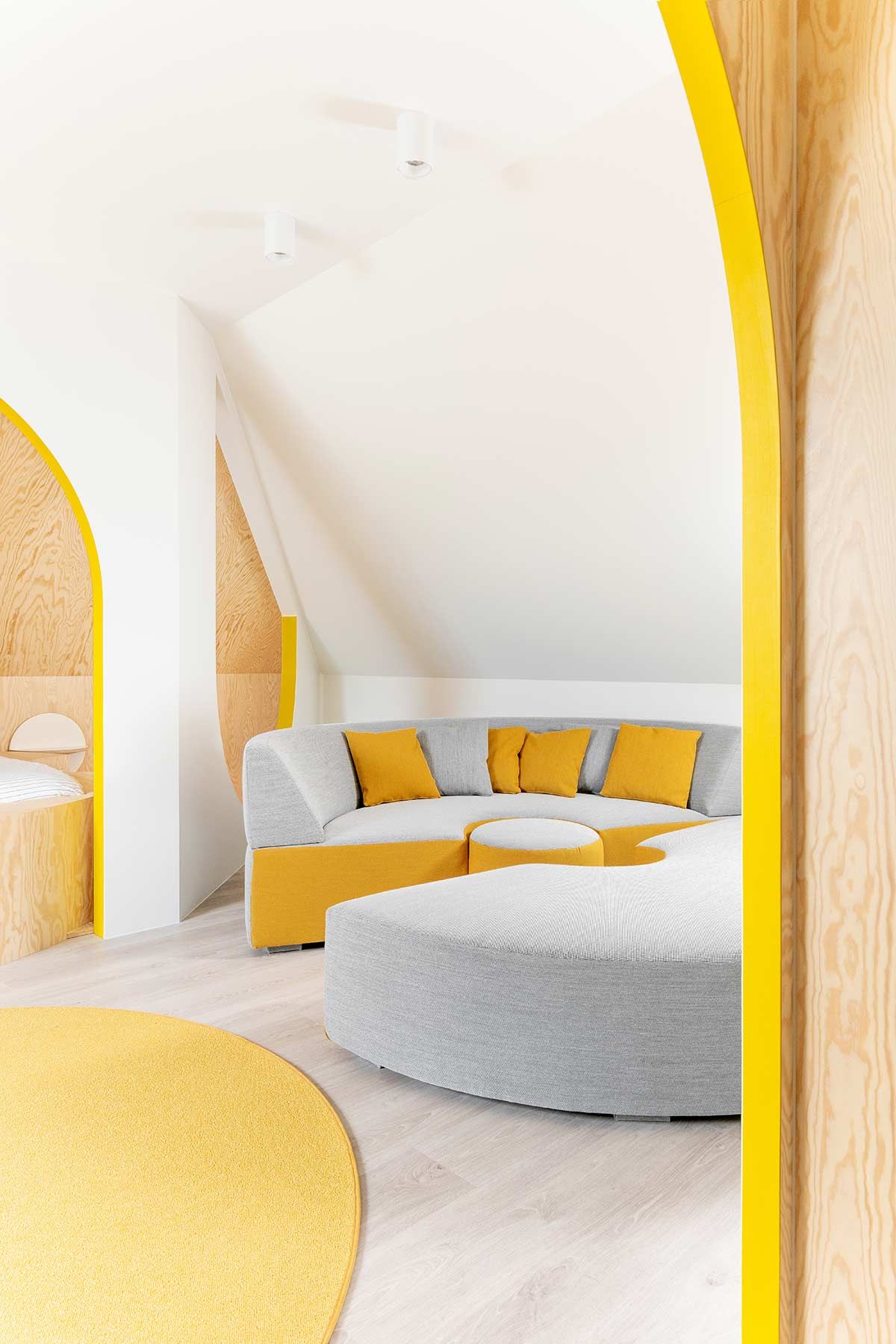 Um antigo sótão escuro em Kasterlee, na Bélgica, ganhou reforma completa assinada pelo escritório Van Staeyen Interieur, e o cinza e amarelo foram bastante explorados ao longo do projeto. Fiel aos tons das cores 2021 eleitas pela Pantone, o destaque vai para o ambiente que funciona como estar e quarto de hóspedes, um lugar ótimo para os moradores curtirem no dia a dia e também receberem os amigos.