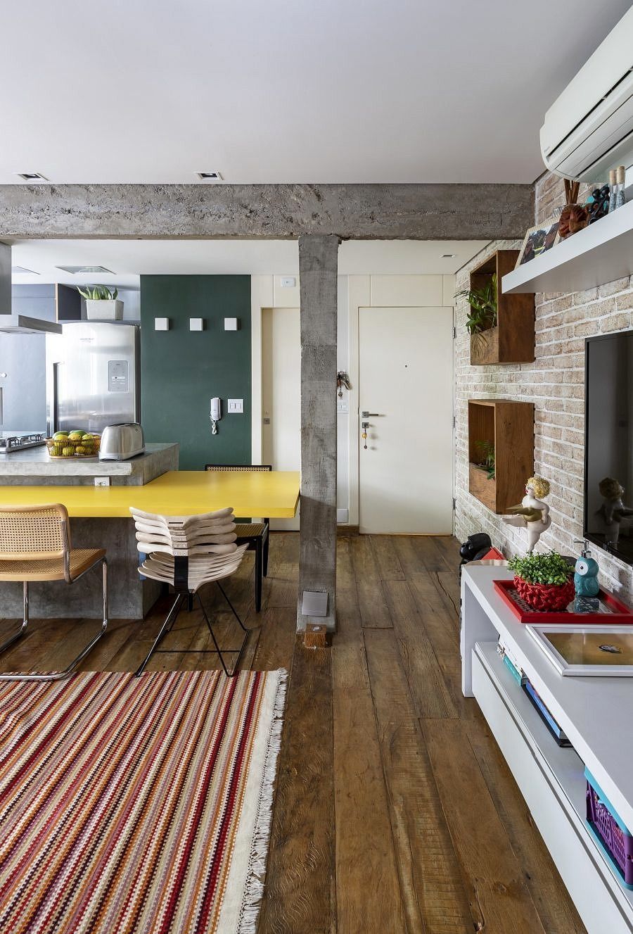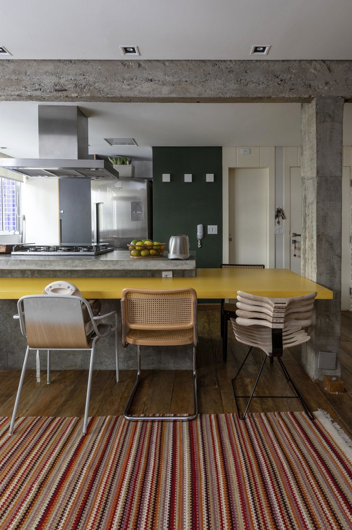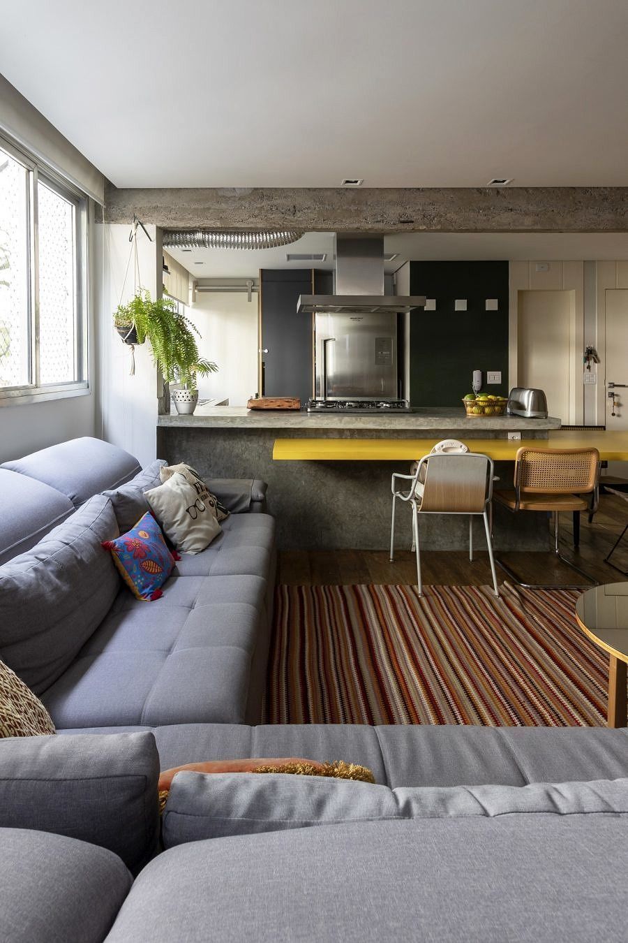 Neste Open House que fizemos em parceria com a Votorantim Cimentos, o amarelo aparece pontualmente na bancada, abraçando a ilha. Mais um vez o cimento queimado + amarelo vibrante aparecem juntos, agregando personalidade e neste caso, criando unidade na linguagem e integração da área social. Quem assina o projeto é o escritório Mestisso Arquitetura e Interiores, e clicando AQUI você confere o tour completo pelo apê. ;-)