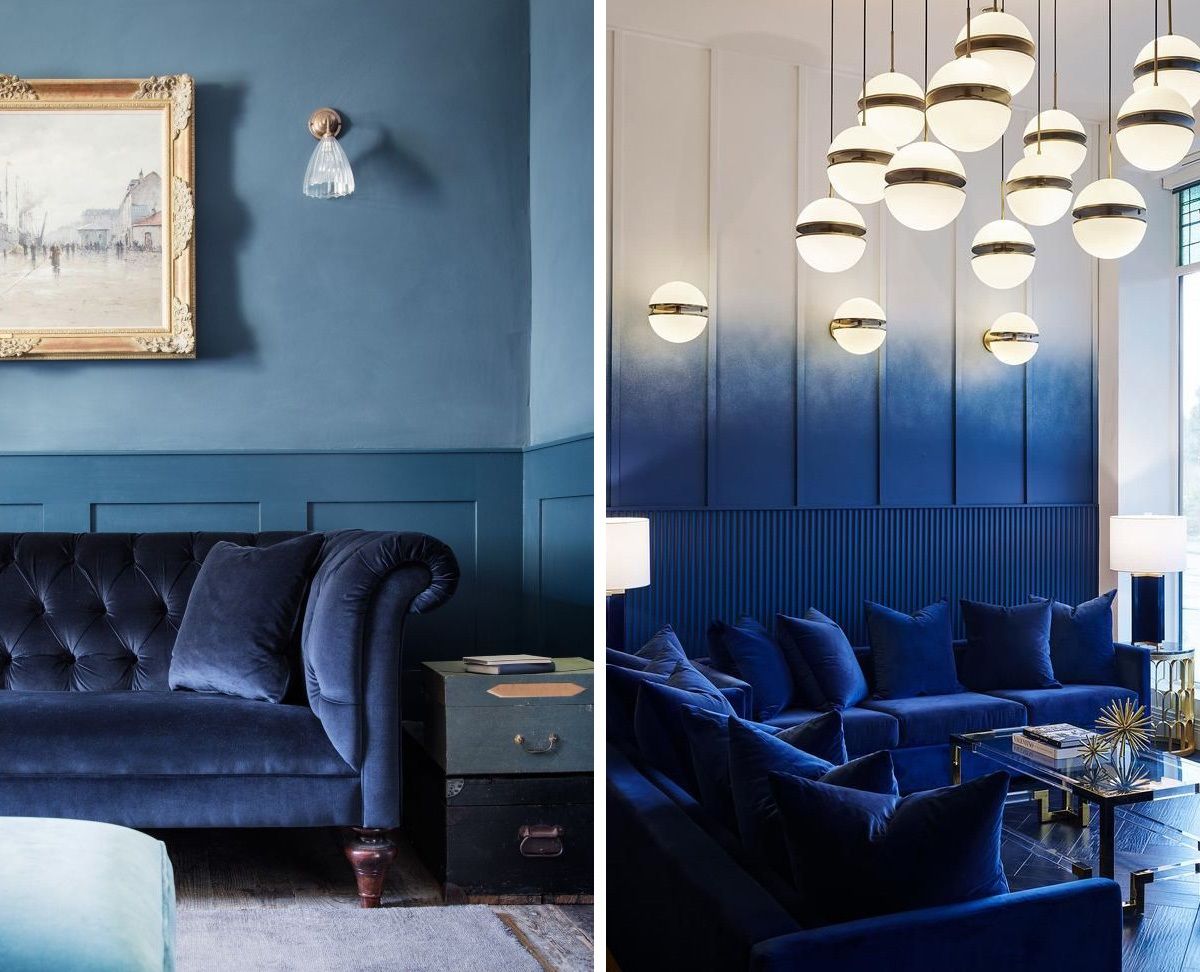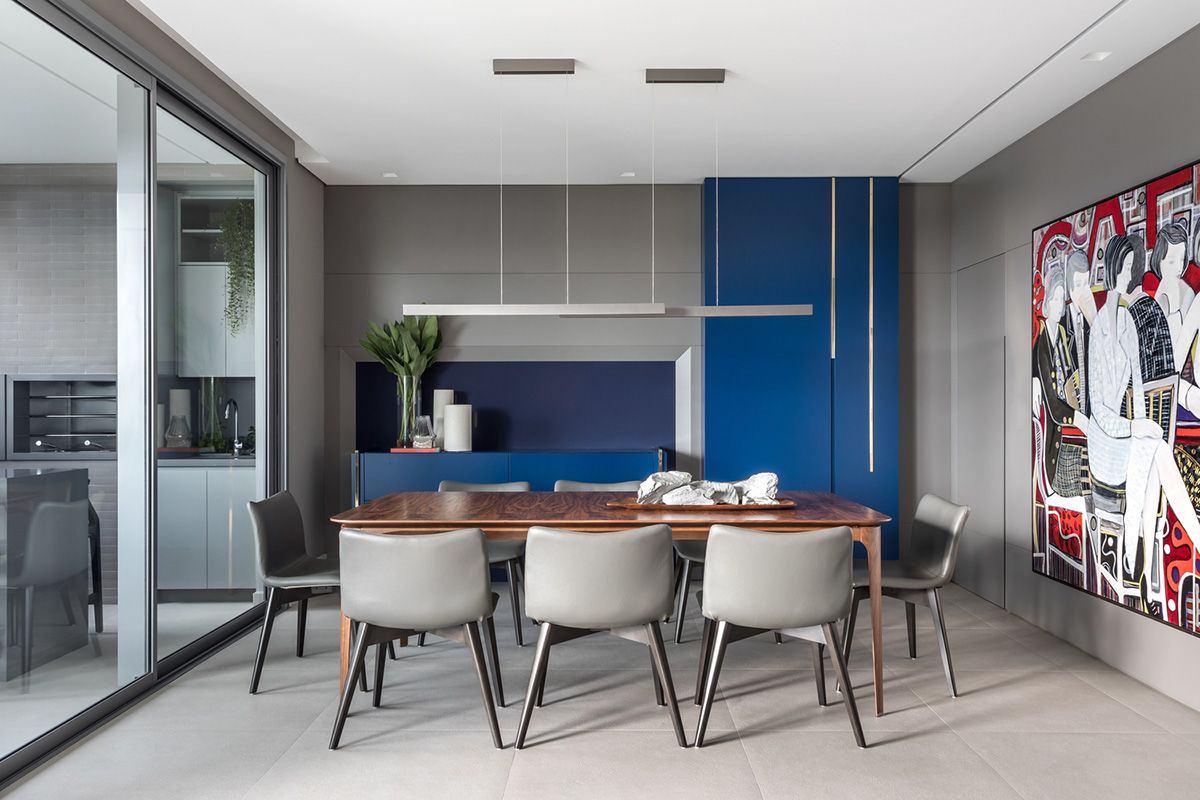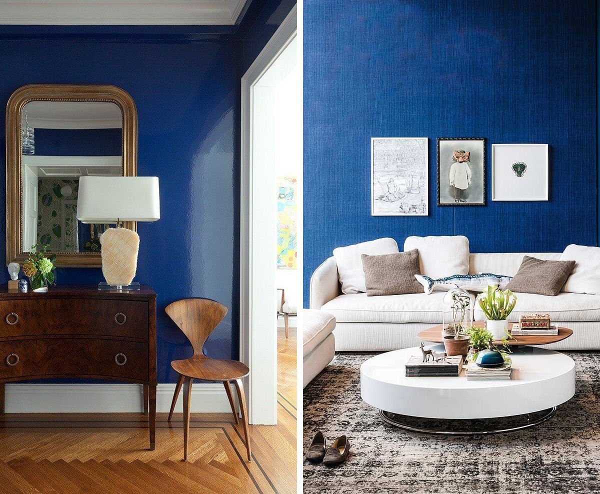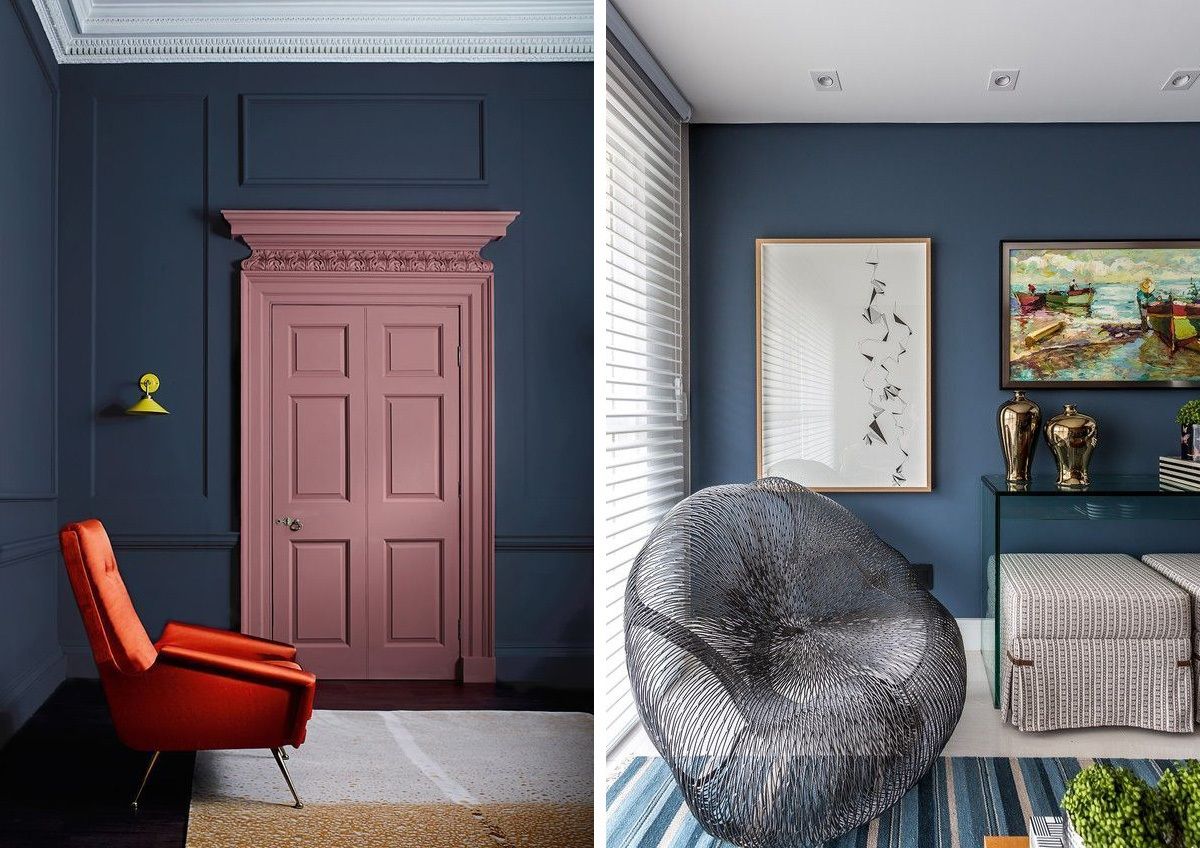 O azul escuro funciona muito bem como base para o ambiente completo, ou até como único ponto de cor no espaço. Dá para apostar na pintura da parede, teto, marcenaria laqueada, papel de parede, mobiliários, almofadas, vasos, mantas, ou no monocromático, que fica lindo e moderno! Algumas cores vão super bem com esse tom de azul, como rosa e verde, além do clássico branco. Na hora de projetar ou transformar a casa, vale pesquisar e se aprofundar no assunto, e foi pensando nisso, inclusive, que selecionei algumas referências com diferentes usos, para você se inspirar e ver como pode funcionar na prática ;-)