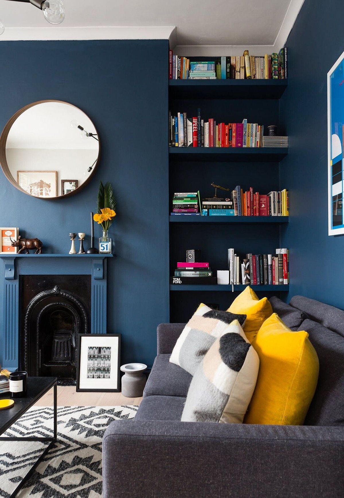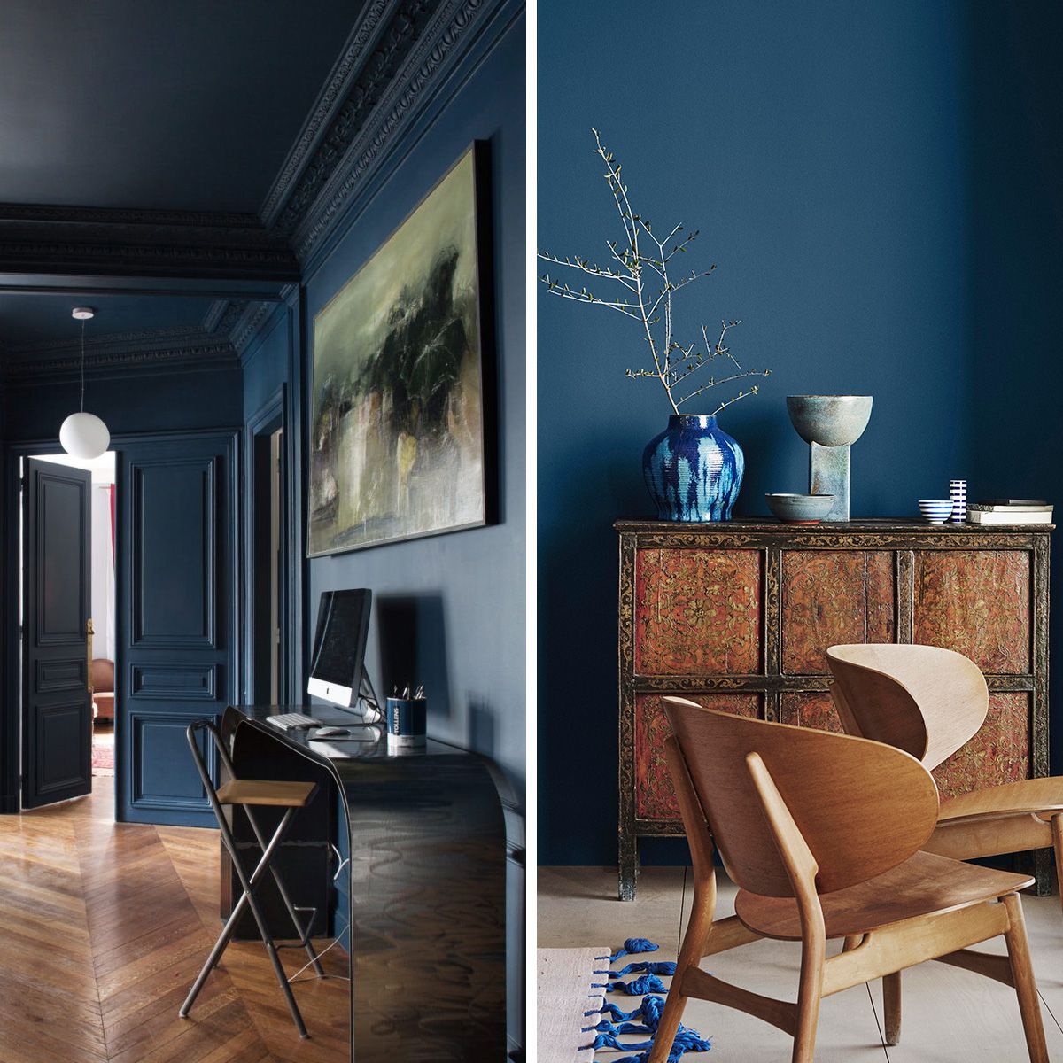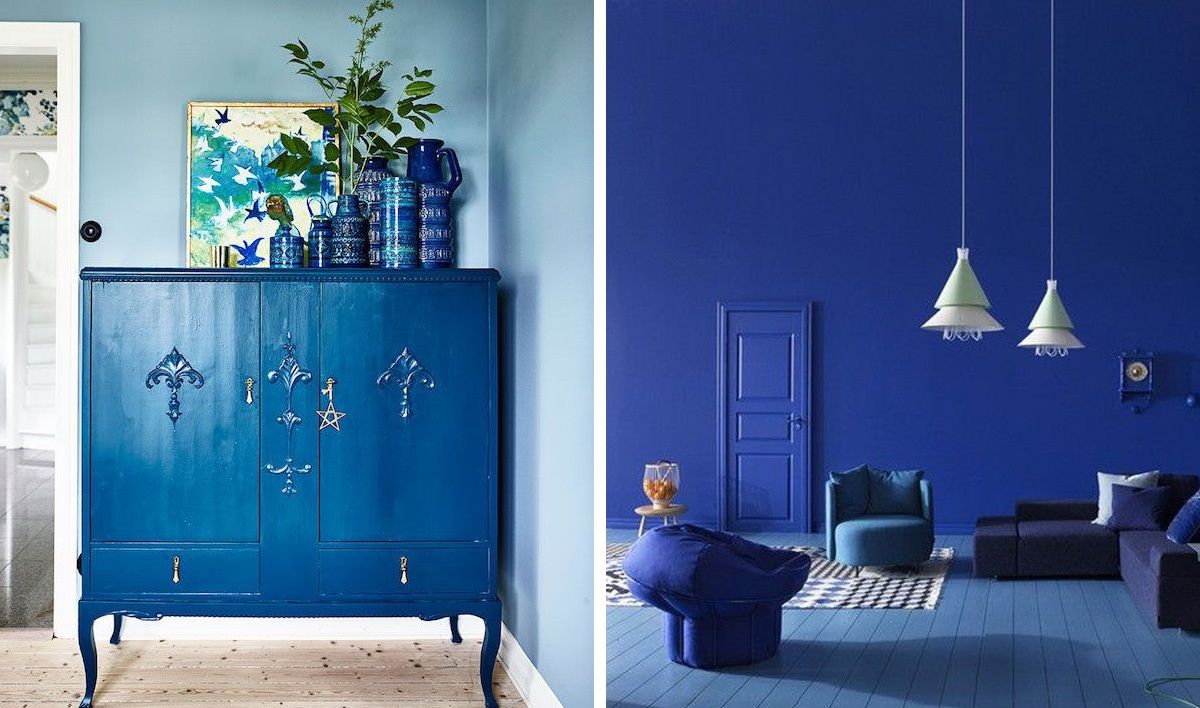 O azul escuro funciona muito bem como base para o ambiente completo, ou até como único ponto de cor no espaço. Dá para apostar na pintura da parede, teto, marcenaria laqueada, papel de parede, mobiliários, almofadas, vasos, mantas, ou no monocromático, que fica lindo e moderno! Algumas cores vão super bem com esse tom de azul, como rosa e verde, além do clássico branco. Na hora de projetar ou transformar a casa, vale pesquisar e se aprofundar no assunto, e foi pensando nisso, inclusive, que selecionei algumas referências com diferentes usos, para você se inspirar e ver como pode funcionar na prática ;-)