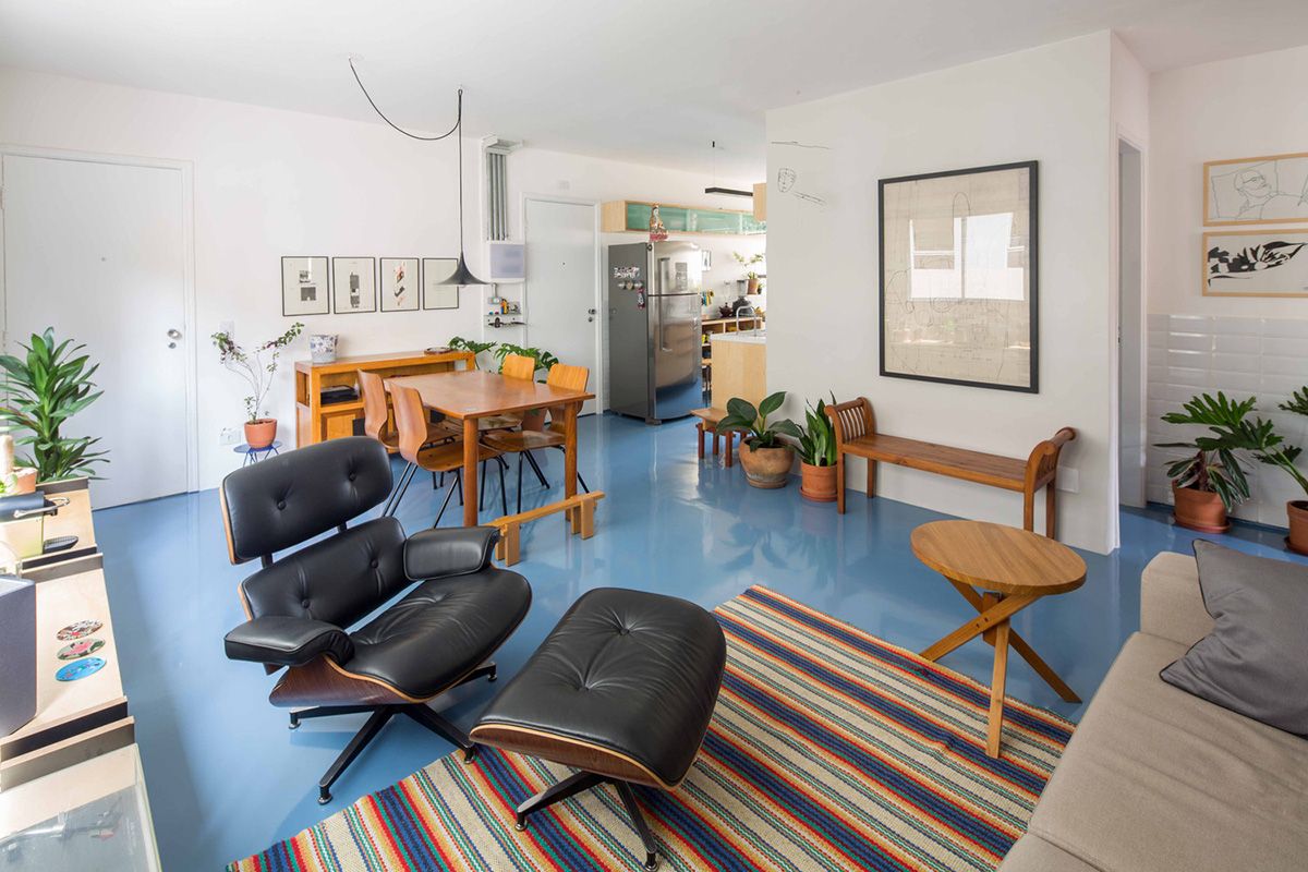 Minha sala e toda azul e branca.