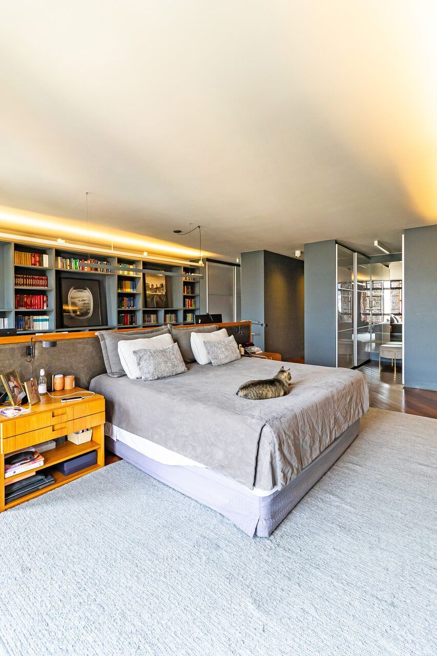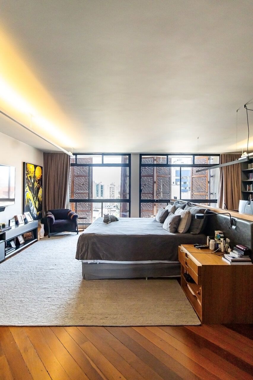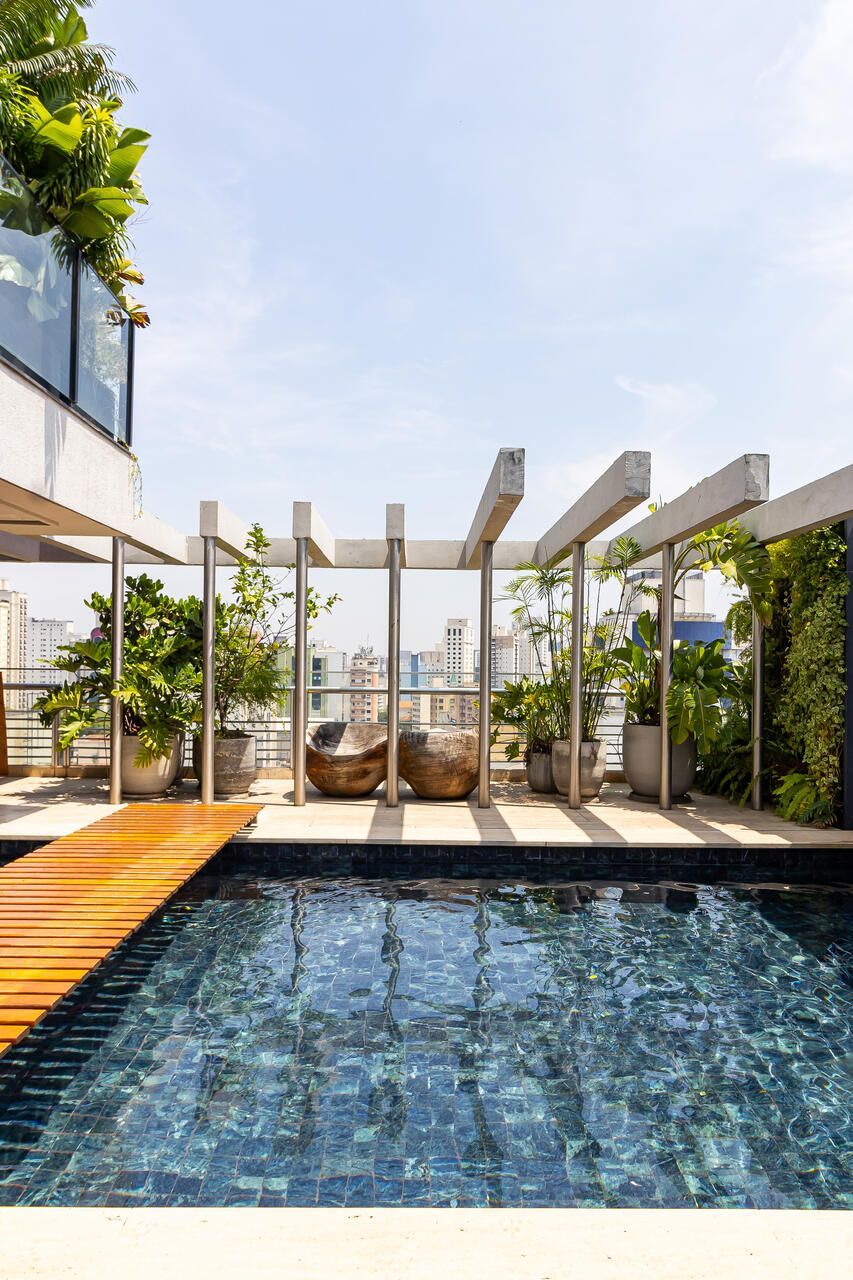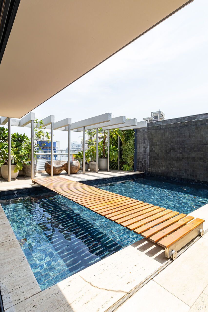 A cobertura duplex, uma das primeiras com piscina na cidade, foi totalmente reformada para o morador que era solteiro e adorava dar festas e receber, e conheceu sua esposa no Open House do imóvel. O piso inferior conta com duas suítes, sendo a suíte master com 80 m² e um super closet, além de living, sala de jantar, lavabo e cozinha. O piso superior abriga uma espaçosa sala de estar, mesa de jogos, bar, sala de TV e uma área externa com um espaço gourmet, piscina, sala de massagem e sauna seca. Acima dessa área, há um enorme deck com ofurô, perfeito para aproveitar o pôr do sol. Além disso, o apartamento conta com cinco banheiros ao todo.