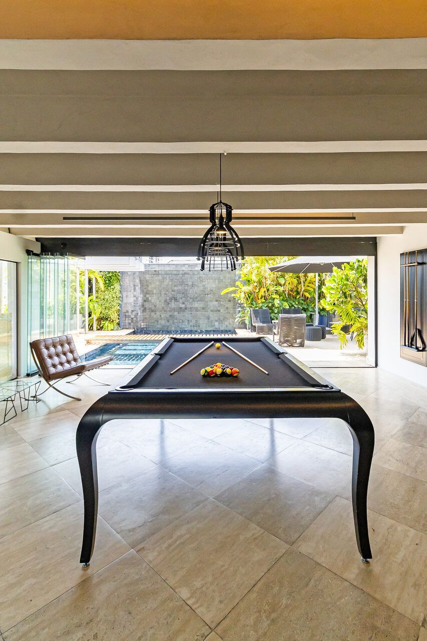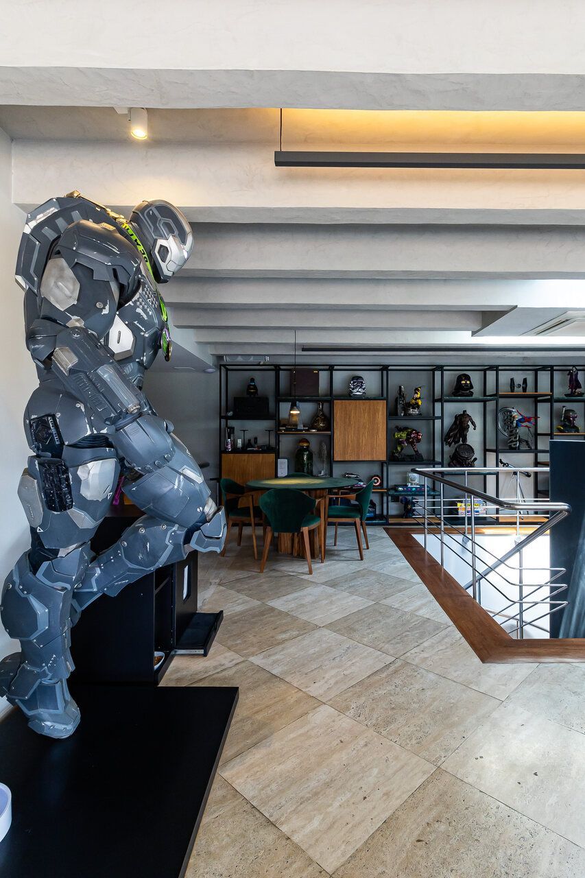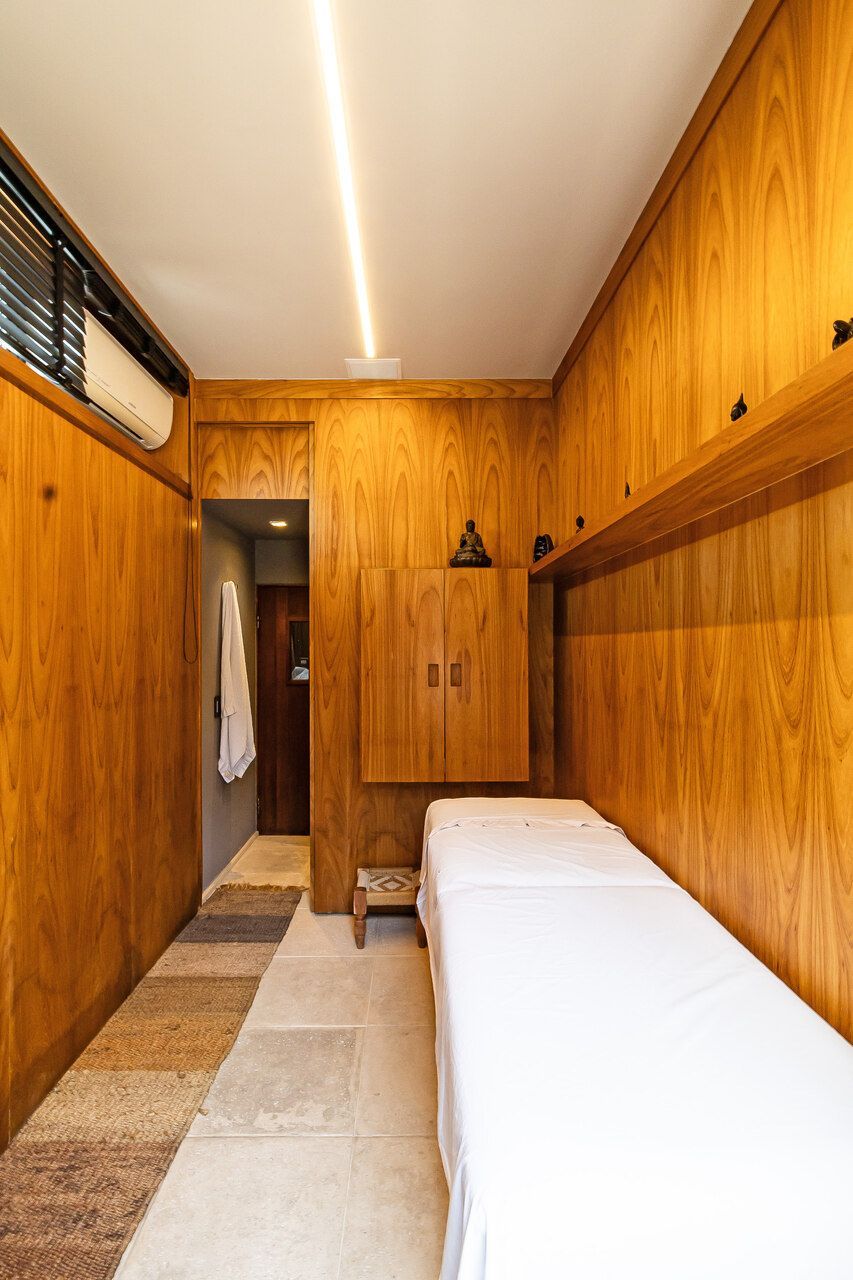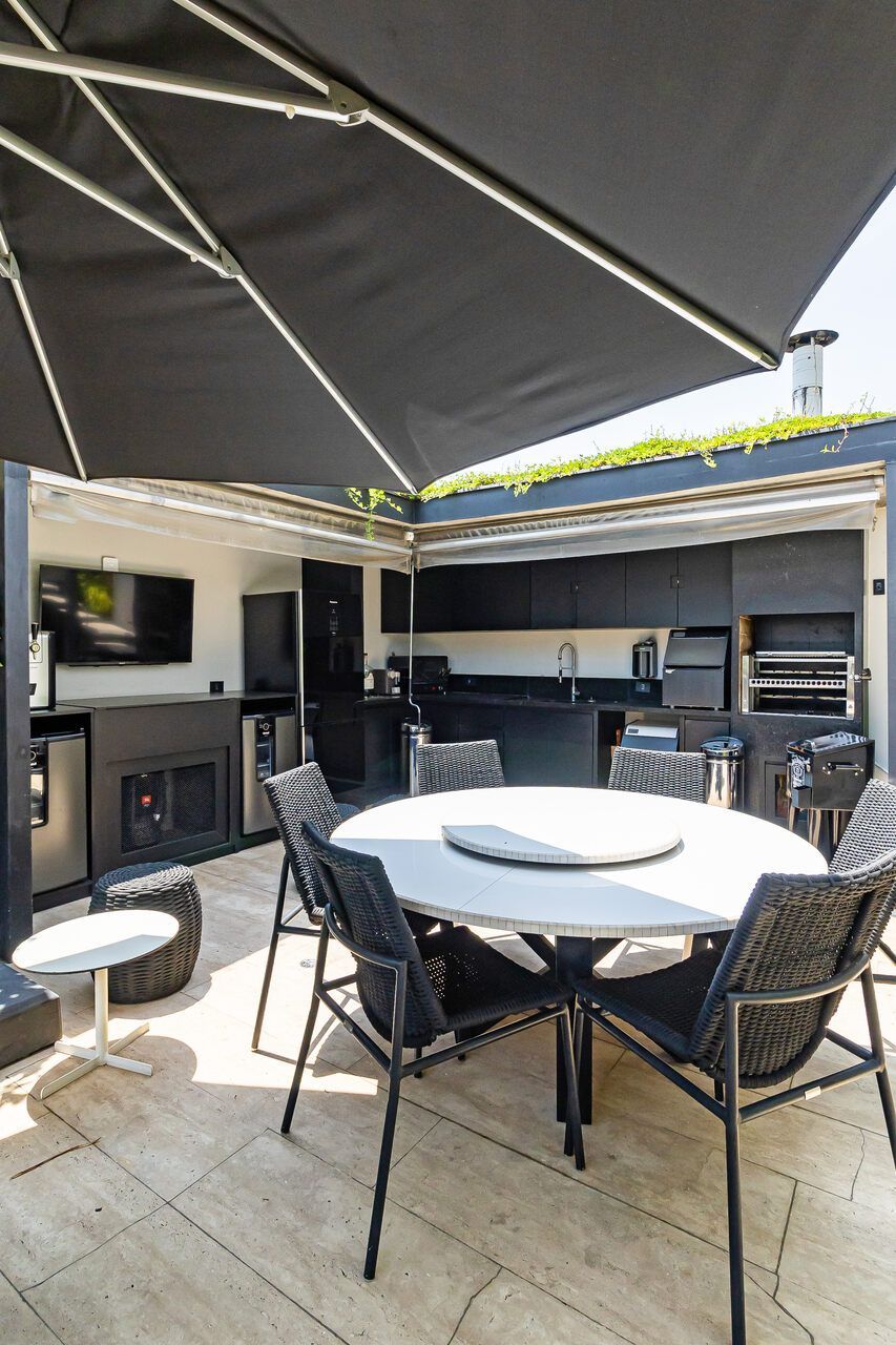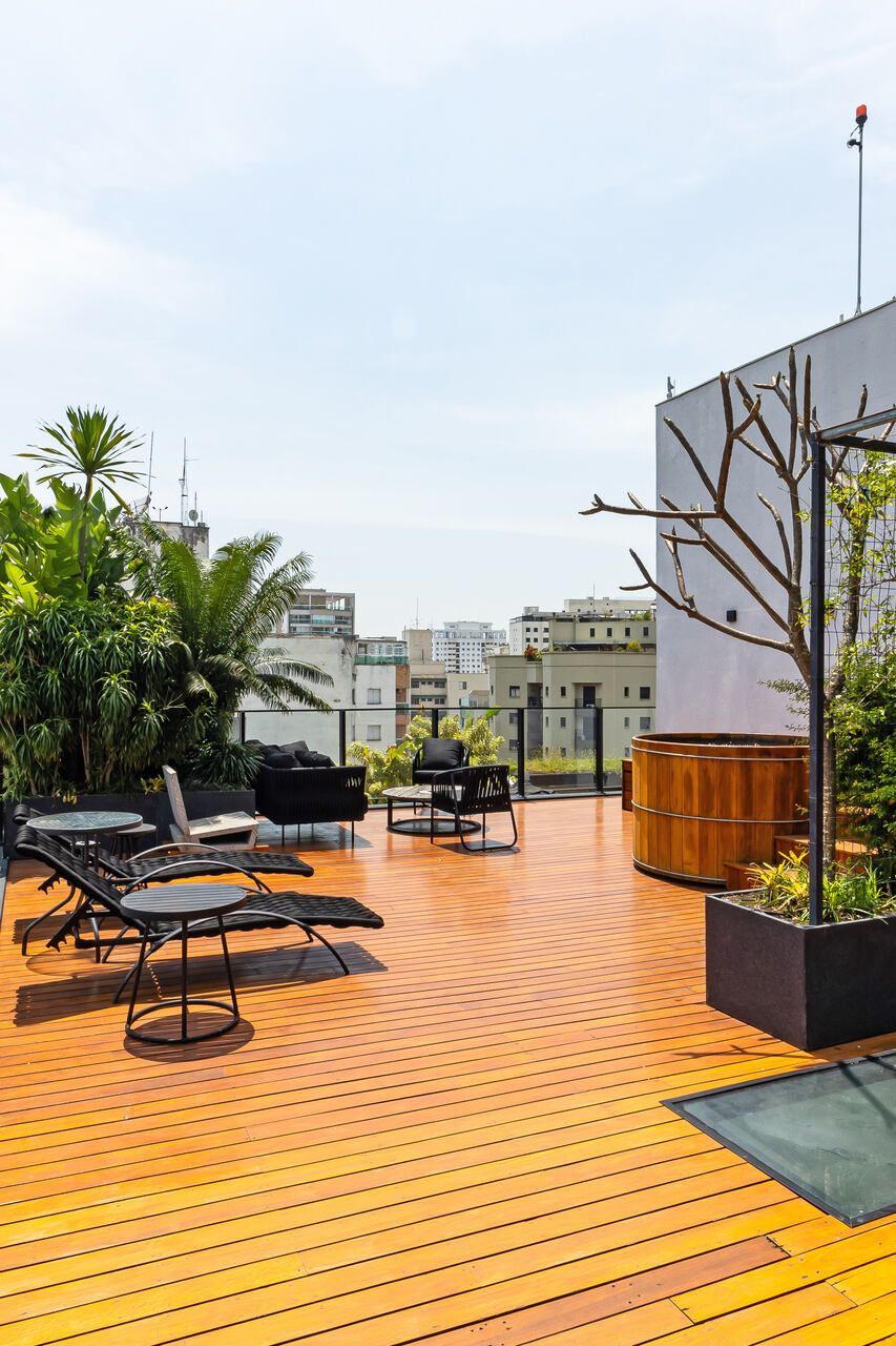 A cobertura duplex, uma das primeiras com piscina na cidade, foi totalmente reformada para o morador que era solteiro e adorava dar festas e receber, e conheceu sua esposa no Open House do imóvel. O piso inferior conta com duas suítes, sendo a suíte master com 80 m² e um super closet, além de living, sala de jantar, lavabo e cozinha. O piso superior abriga uma espaçosa sala de estar, mesa de jogos, bar, sala de TV e uma área externa com um espaço gourmet, piscina, sala de massagem e sauna seca. Acima dessa área, há um enorme deck com ofurô, perfeito para aproveitar o pôr do sol. Além disso, o apartamento conta com cinco banheiros ao todo.