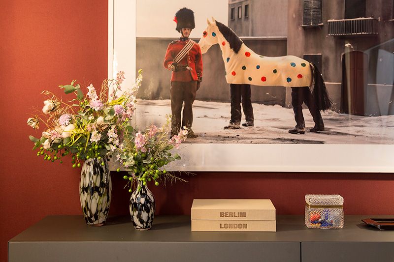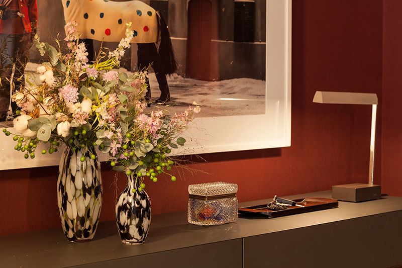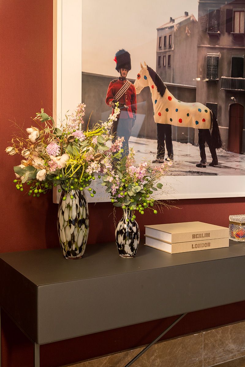 Bom, foi exatamente o que eu fiz neste ambiente aqui da Artefacto da Haddock Lobo, aqui em São Paulo. Repara que no aparador não usei muitas peças, mas escolhi a dedo as que iria manter nele, e dei preferência para elementos práticos e que funcionam principalmente em aparadores em halls de entrada. Repara que eu fiz questão de deixar um porta chaves u porta trecos e uma caixinha de cristal antiga com chocolates (hummmm chocolates rsss). Escolhi essas peças depois de decidir que usaria os 2 vasos Multicor da Cá d’Oro.