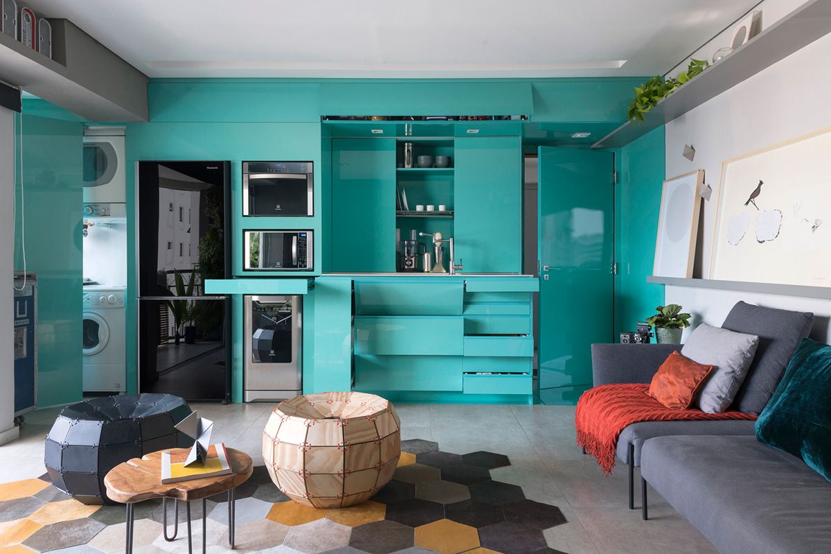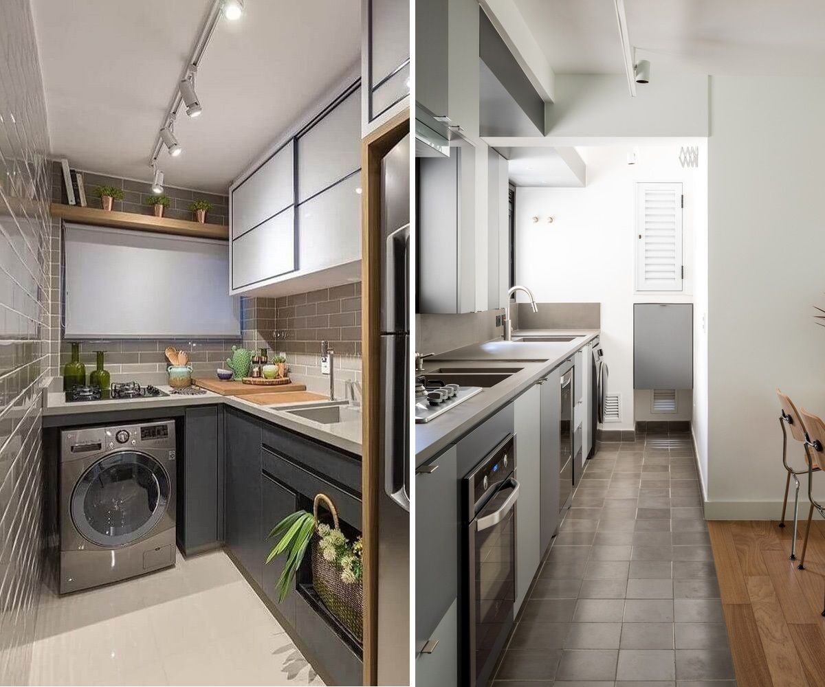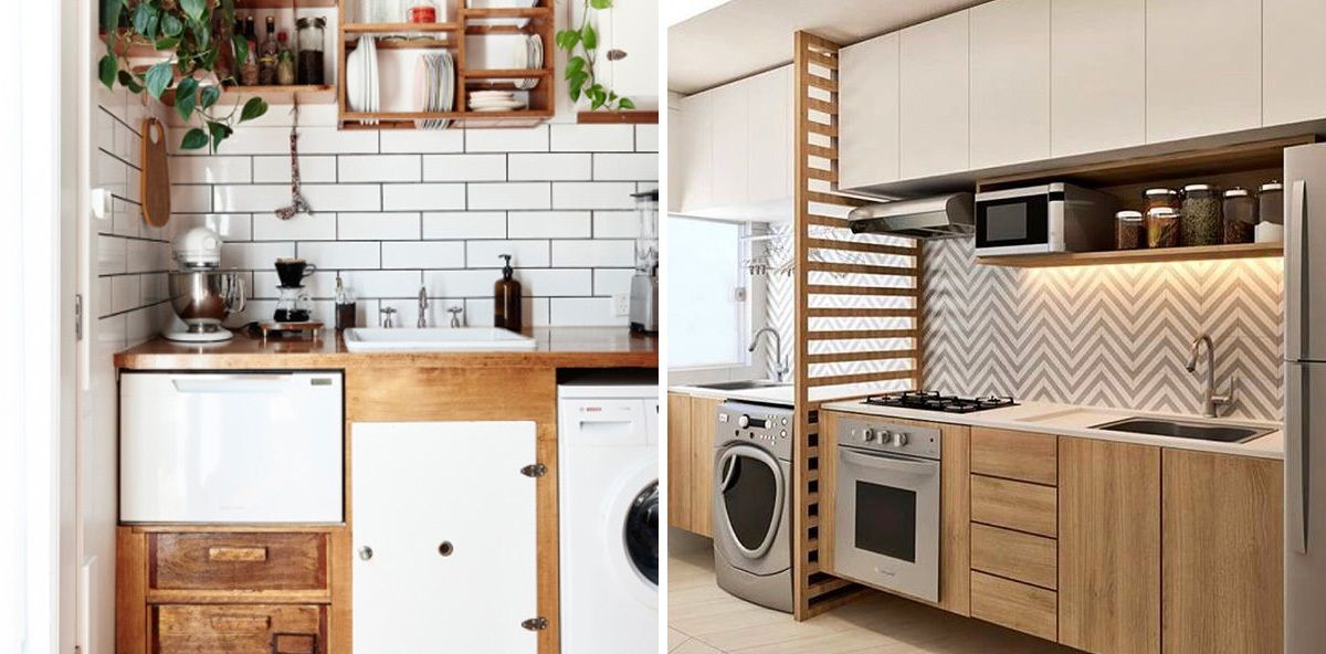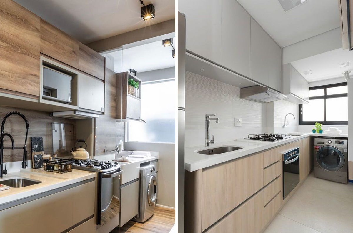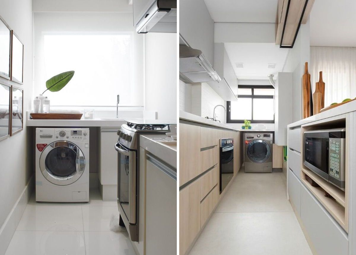 • o tipo e posição da máquina de lavar pode melhorar bastante a circulação e visual. As mais usadas nesse caso são as lava e seca com abertura frontal, que podem ser instaladas no chão ou em cima da bancada, na altura do olhar de quem for usar;