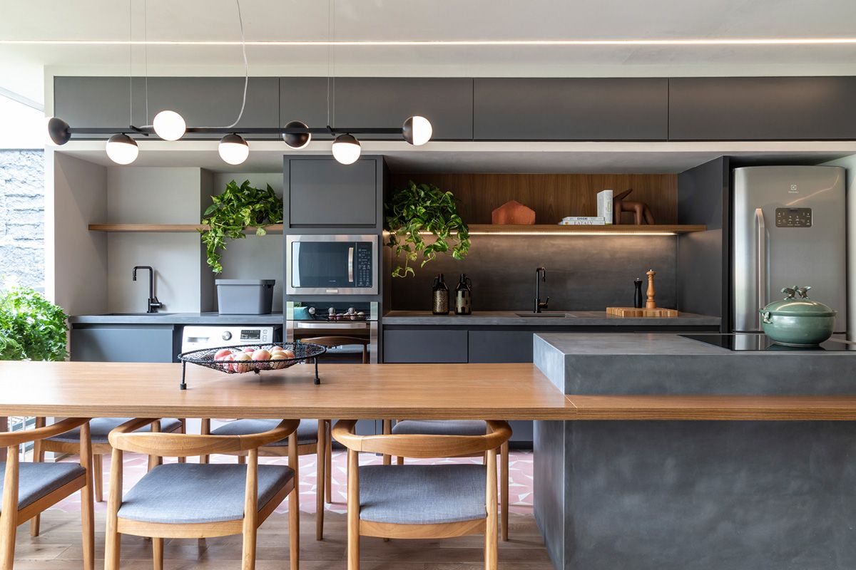 • como a marcenaria é um dos maiores volumes dentro de uma cozinha, criar armários, nichos e prateleiras com mesmo material, cor e formato para ambos os ambientes, deixa o visual clean e contínuo. Além disso, a marcenaria é fundamental para uma boa armazenagem de produtos e utensílios, evitando aquela baguncinha do dia-a-dia rsss;