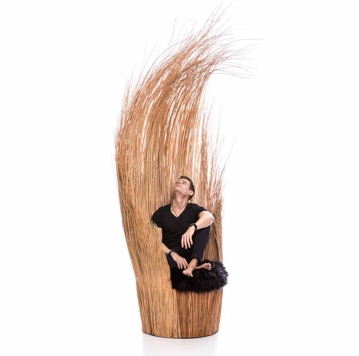 Lembro quem que uma das primeiras vezes que vie pessoalmente o trabalho do Tiago gostei muito e o Bento (meu filho de 3 anos e 1/2 também). Era exatamente essa poltrona que o Tiago esta sentado na foto abaixo. Nossa fez o maior sucesso, o Bento queria pegar, passar a mão, sentar… Achei divertido ele interagindo de maneira super entusiasmada com a peça e isso me marcou.