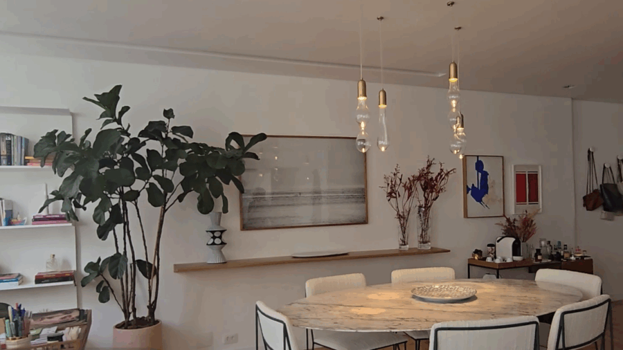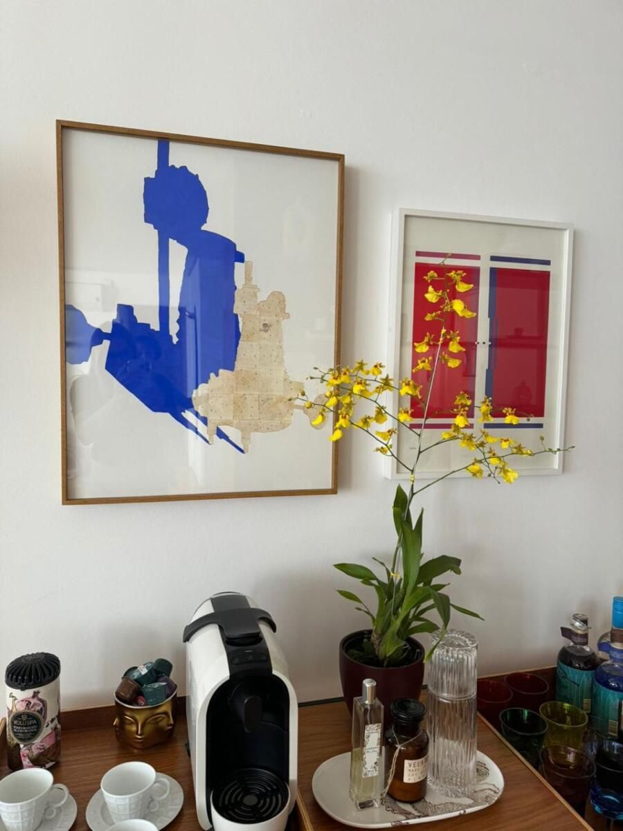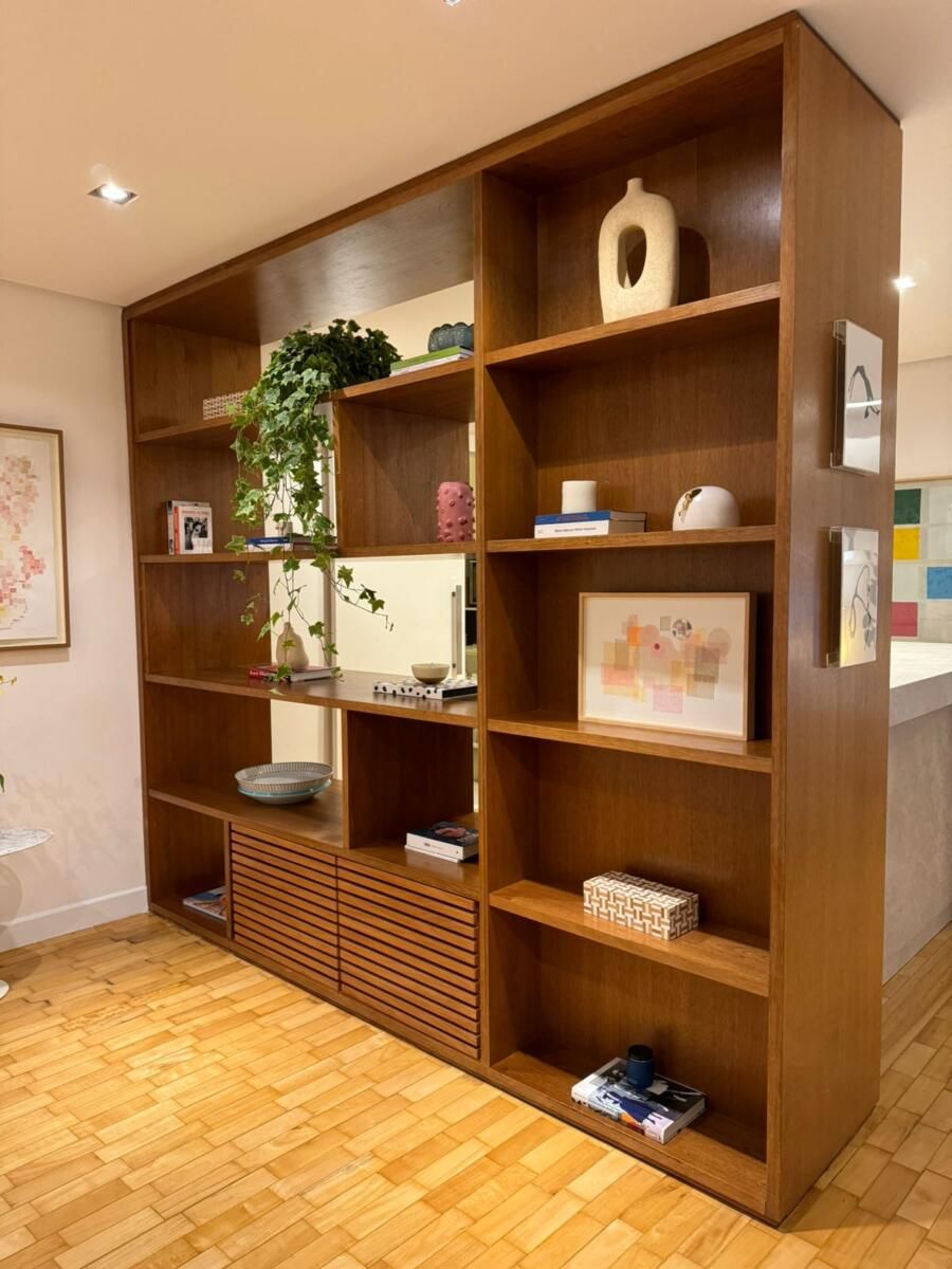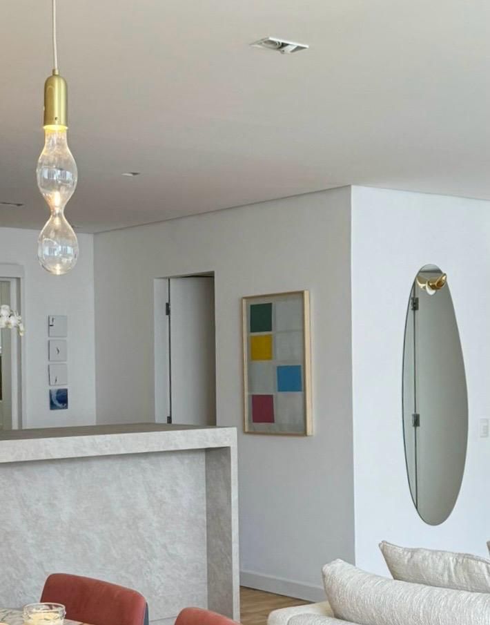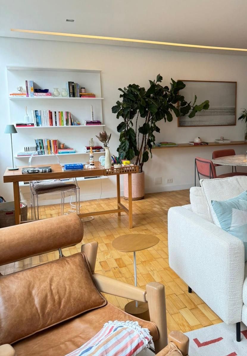 A planta original foi alterada pela antiga moradora, o que tornou o imóvel ainda mais interessante: a cozinha foi reduzida para dar espaço a um bar integrado à sala, a lavanderia foi parcialmente incorporada para criar uma suíte extra e um lavabo foi adicionado. Essas mudanças deixaram os ambientes amplos e bem distribuídos — com destaque especial para a área social, que combina sala de TV, sala de jantar, bar e até um nicho de trabalho. Mariana reutilizou a maior parte do mobiliário do apartamento anterior, apostando em uma base clara e neutra com piso de taco de madeira e toques pontuais de cor nos objetos e mobiliários.
