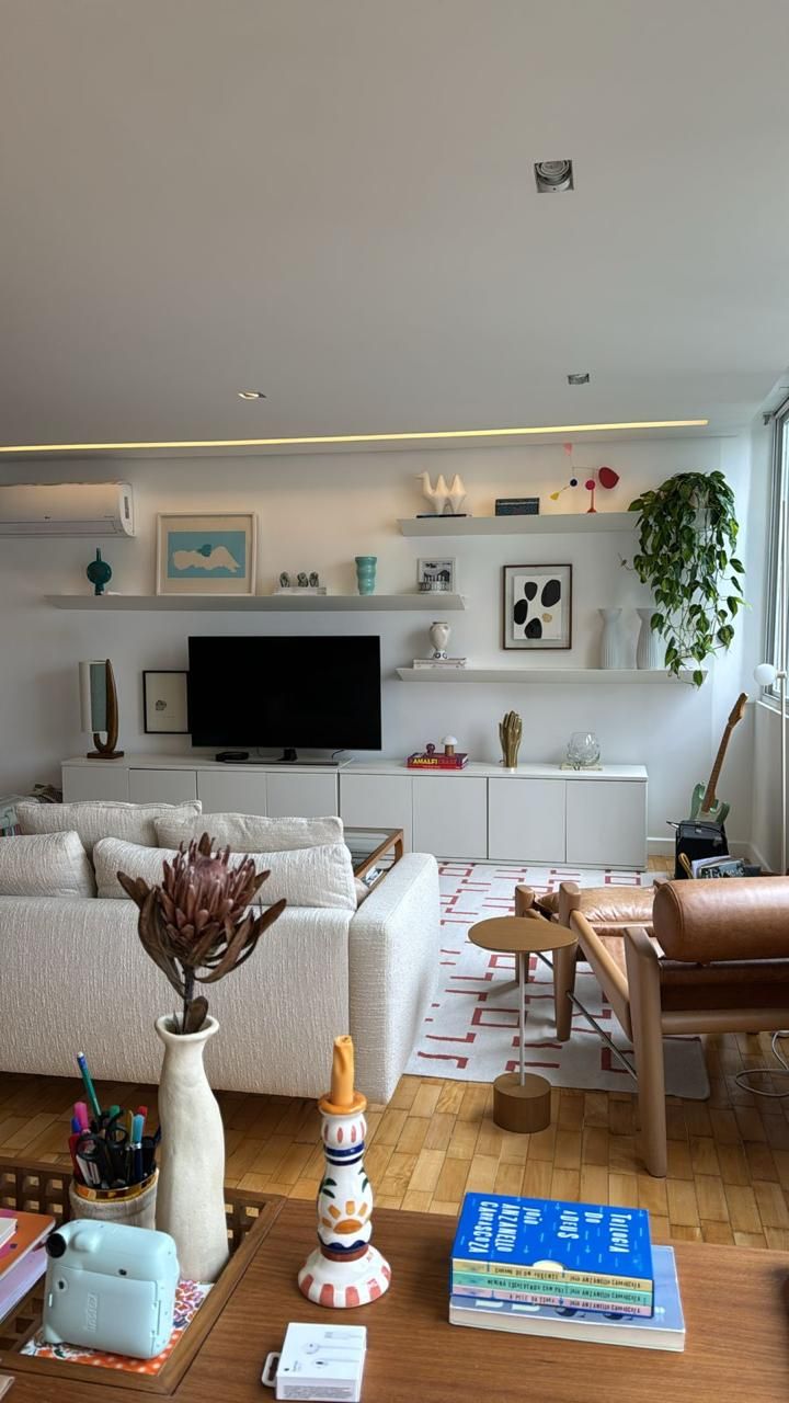 A estética do apartamento pode ser definida como uma fusão entre modernismo clássico e linguagem contemporânea. A construção do edifício, de 1985, imprime sua identidade com janelas longas e materiais originais como o piso de madeira. Já a decoração inclui peças assinadas por jovens designers brasileiros e objetos afetivos, como móveis de viagem, livros e até uma guitarra, que ganhou espaço na sala por ser parte da rotina da moradora.