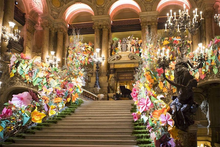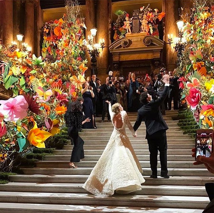A festa aconteceu no Palais Garnier, que teve a entrada inteirinha decorada com flores de papel feitas pela própria noiva. A ideia era levar um pouquinho d clima tropical e colorido brasileiro para o espaço.