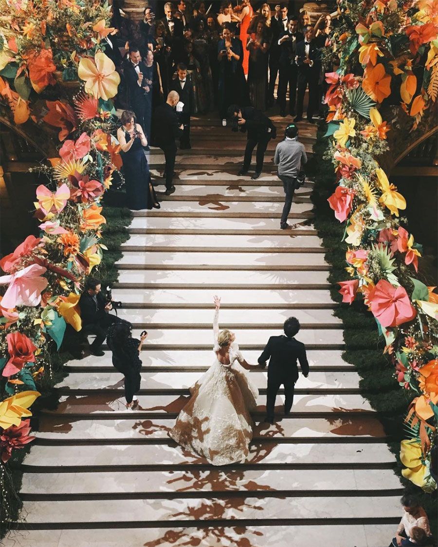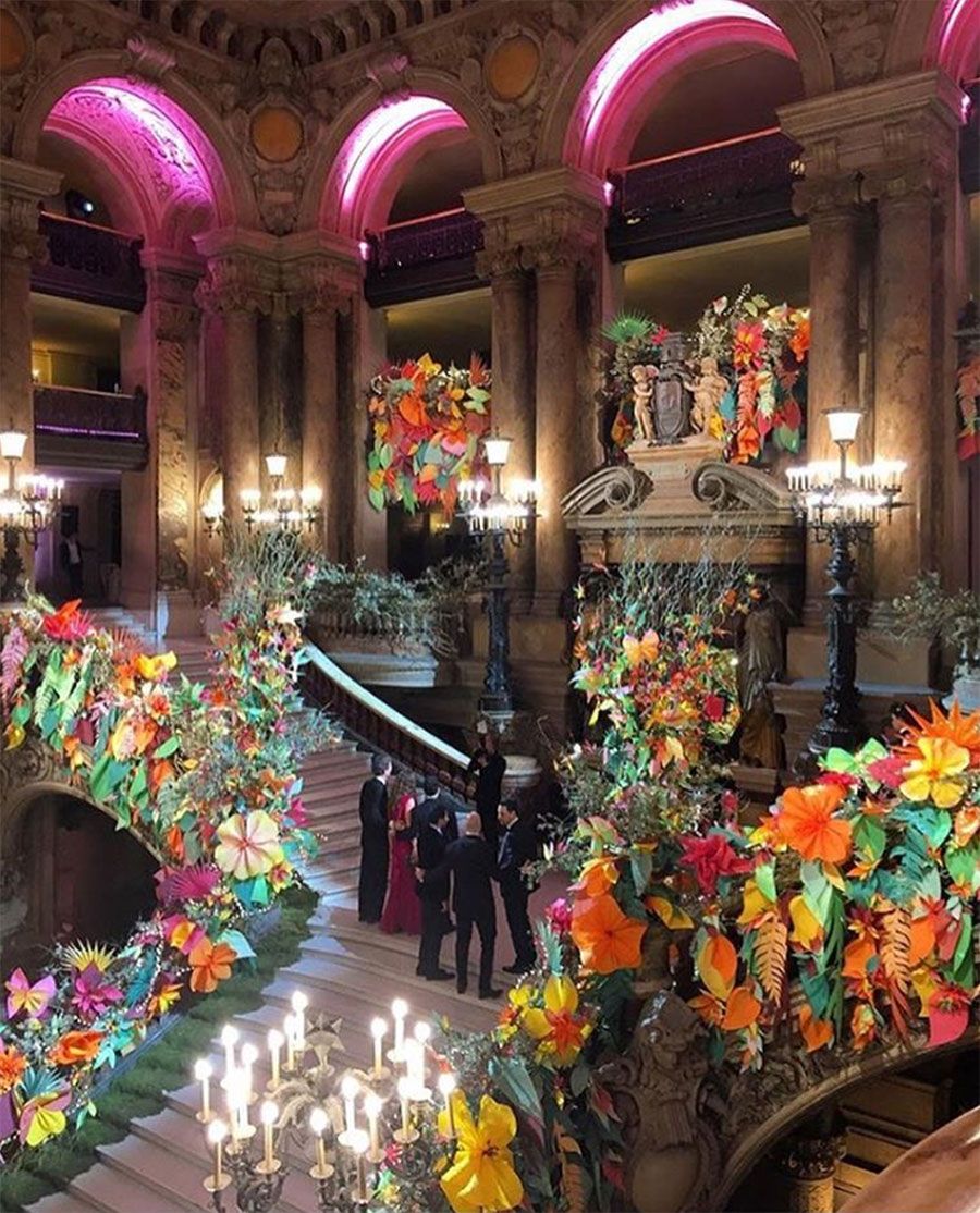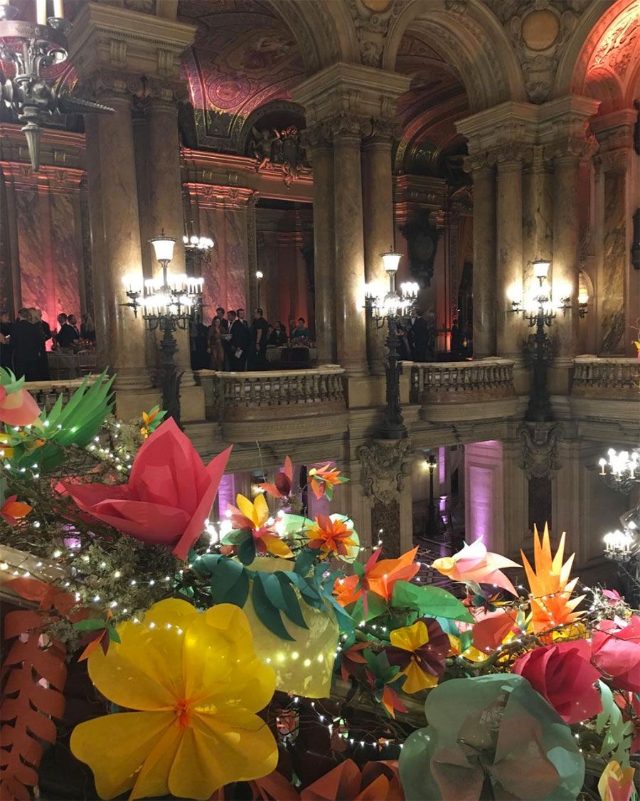 A festa aconteceu no Palais Garnier, que teve a entrada inteirinha decorada com flores de papel feitas pela própria noiva. A ideia era levar um pouquinho d clima tropical e colorido brasileiro para o espaço.