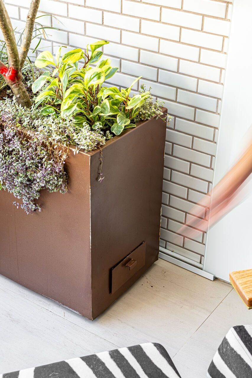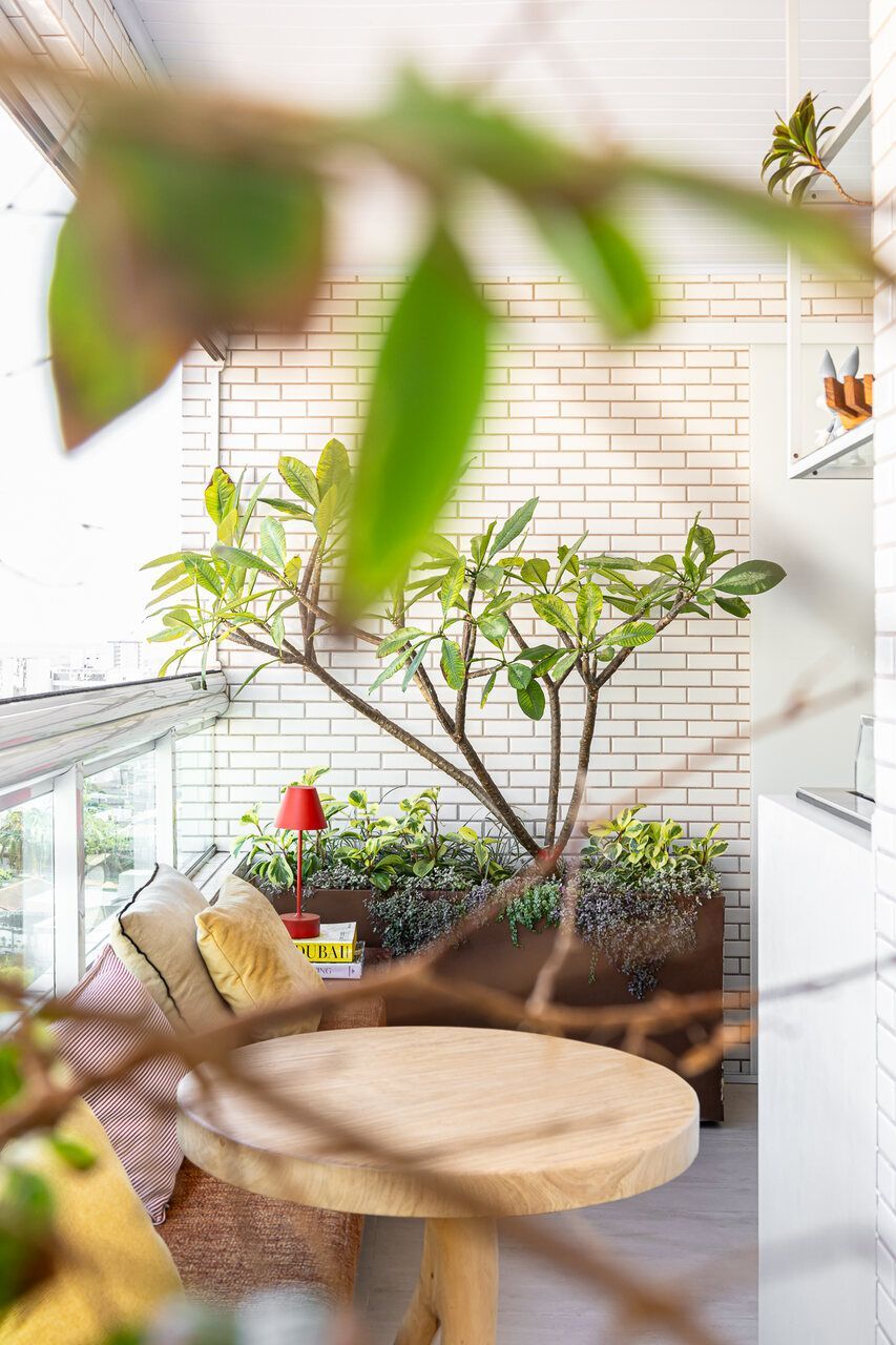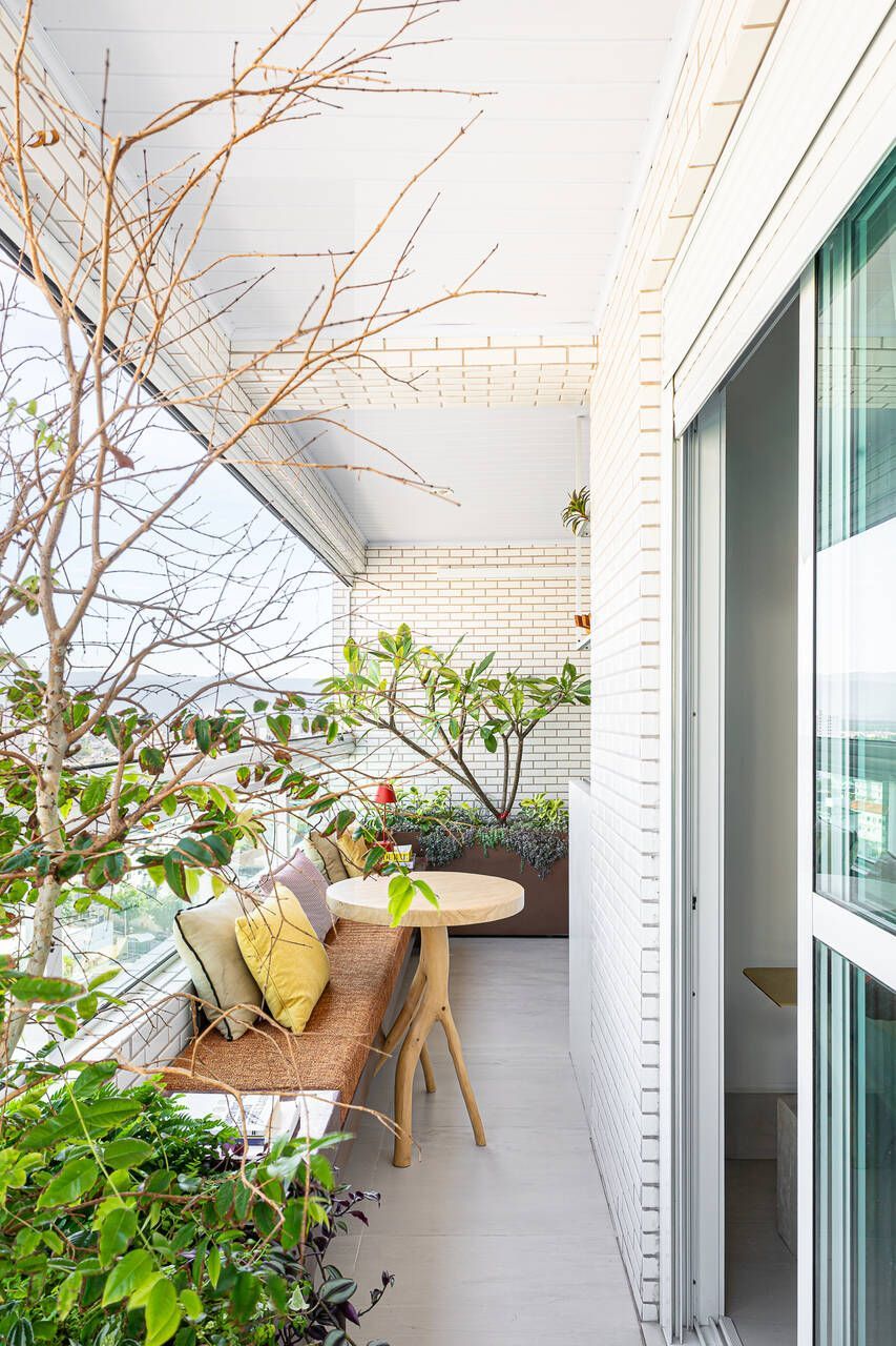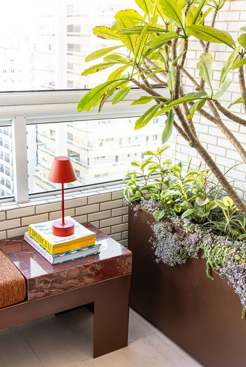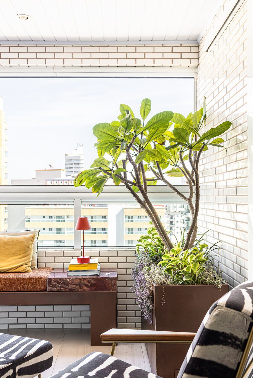 A sacada recebeu um banco contínuo, sem emendas ou pés centrais, e uma jardineira planejada para o casal. Essa solução reforça a integração entre interior e exterior, criando um espaço de respiro e contemplação.