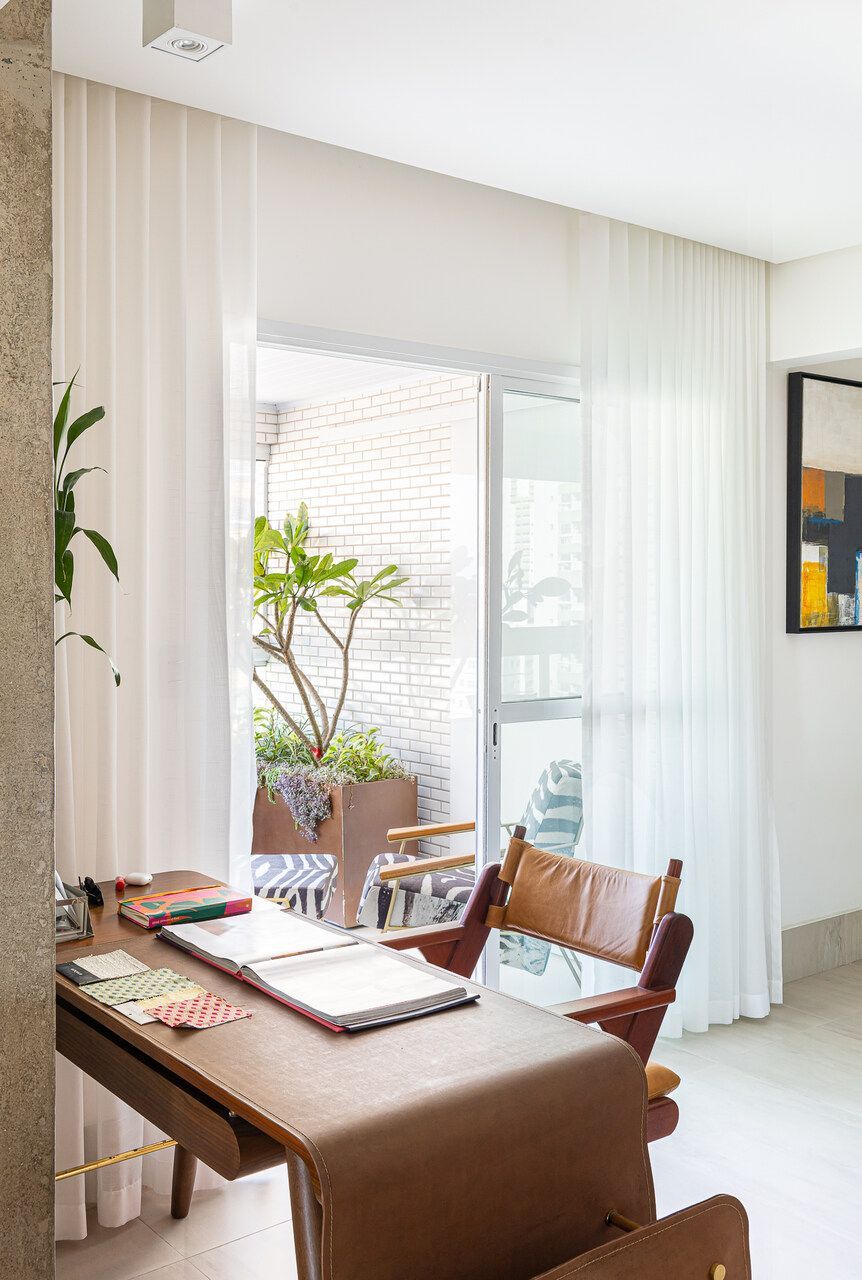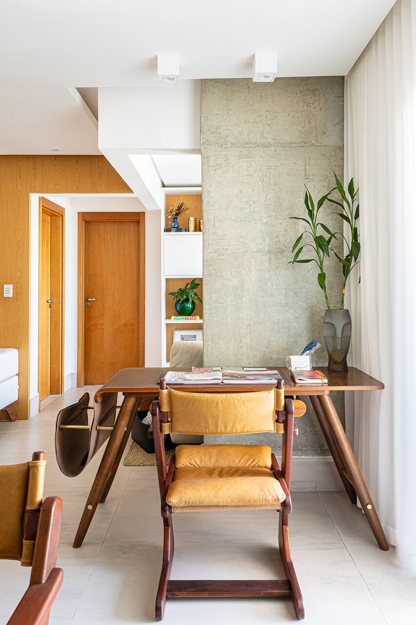 Na área de trabalho, a proposta foi criar um espaço criativo e leve, mantendo a conexão com os demais ambientes. O contraste entre o concreto aparente e os móveis de design marcante dá personalidade ao espaço, que funciona bem tanto para momentos de foco quanto para pausas rápidas ao longo do dia.