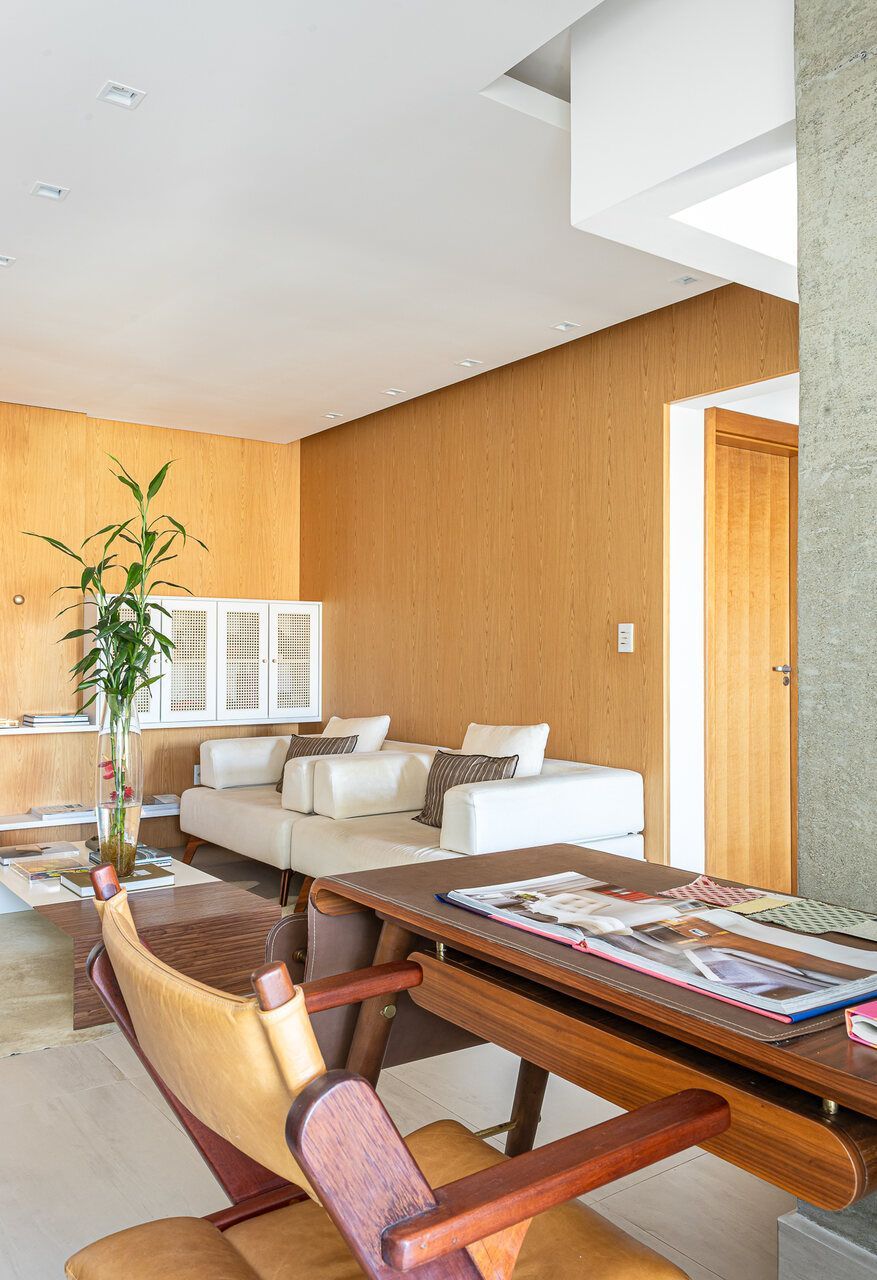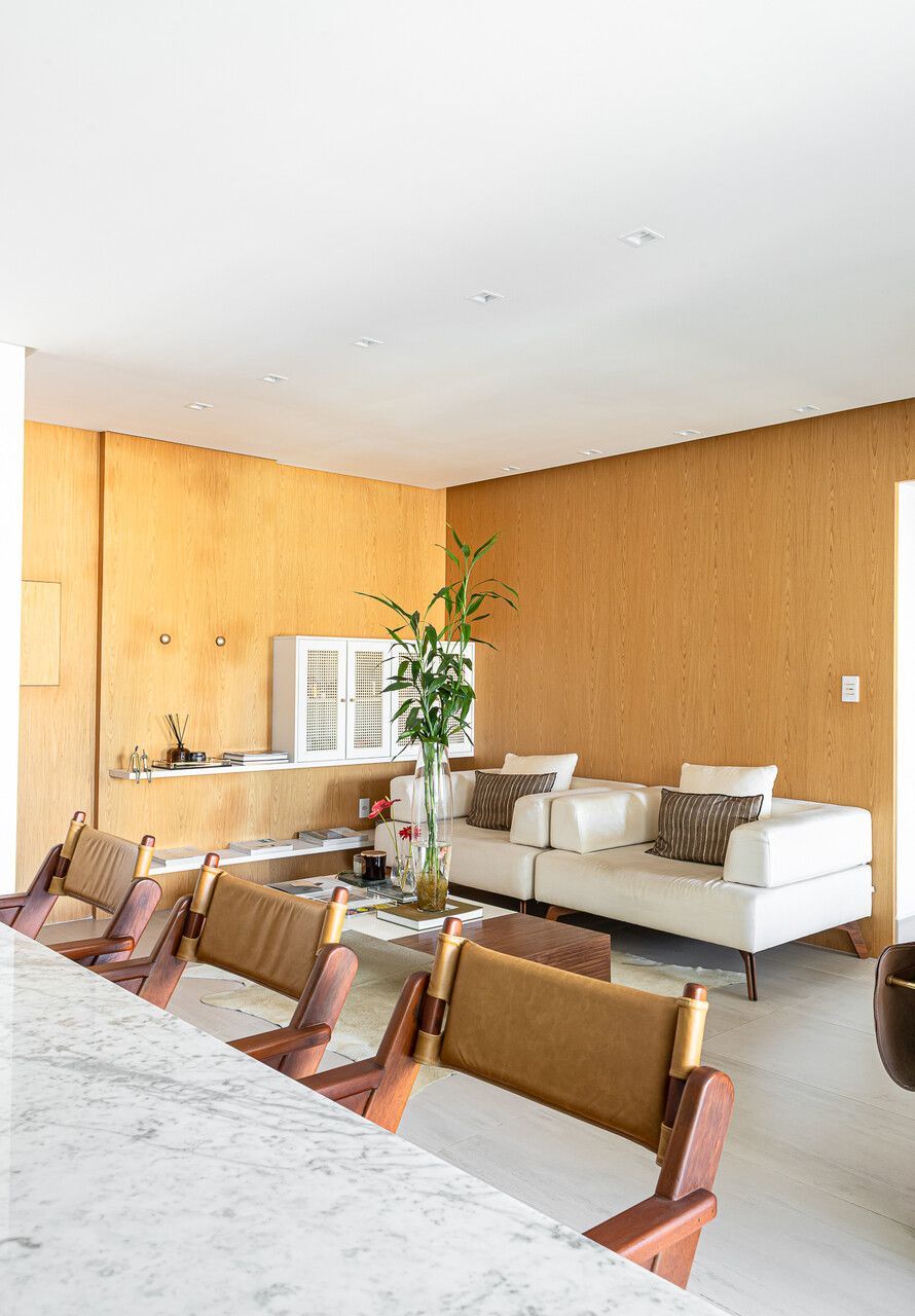 Logo na entrada, o living se destaca com paredes revestidas em lâmina de carvalho natural, criando uma atmosfera acolhedora desde os primeiros passos. Esse uso de madeira aquece o ambiente e reforça a ideia de bem-estar.