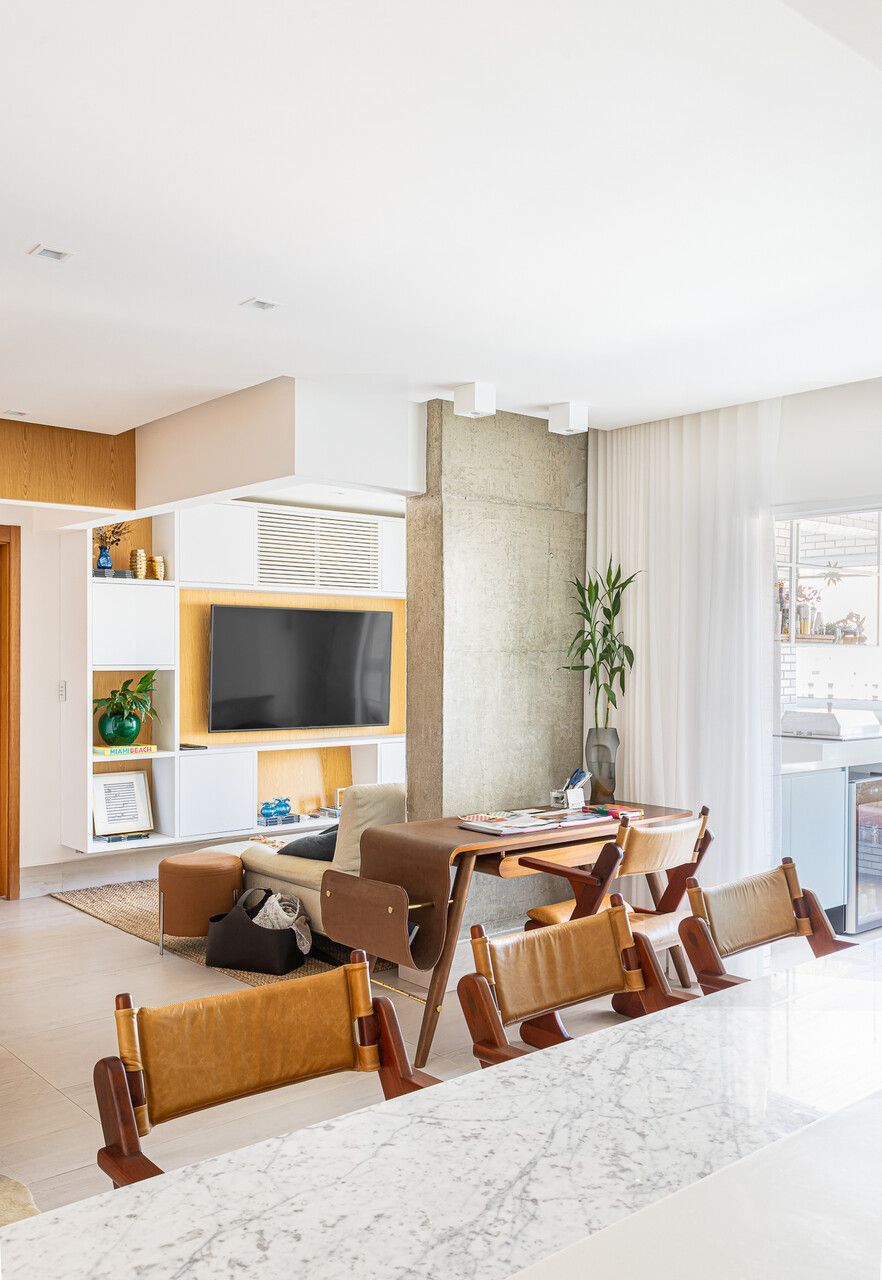 O apartamento da Wanessa tem de 122 m², o projeto de interiores assinado pelo Maurício Queiroz, do escritório Arbrê, teve como foco principal a integração dos espaços e o aproveitamento inteligente de cada metro quadrado. O desafio foi criar um ambiente fluido e acolhedor, reunindo living, sala de TV, home office e cozinha de forma harmônica, ideal para a rotina da Wanessa e do marido.