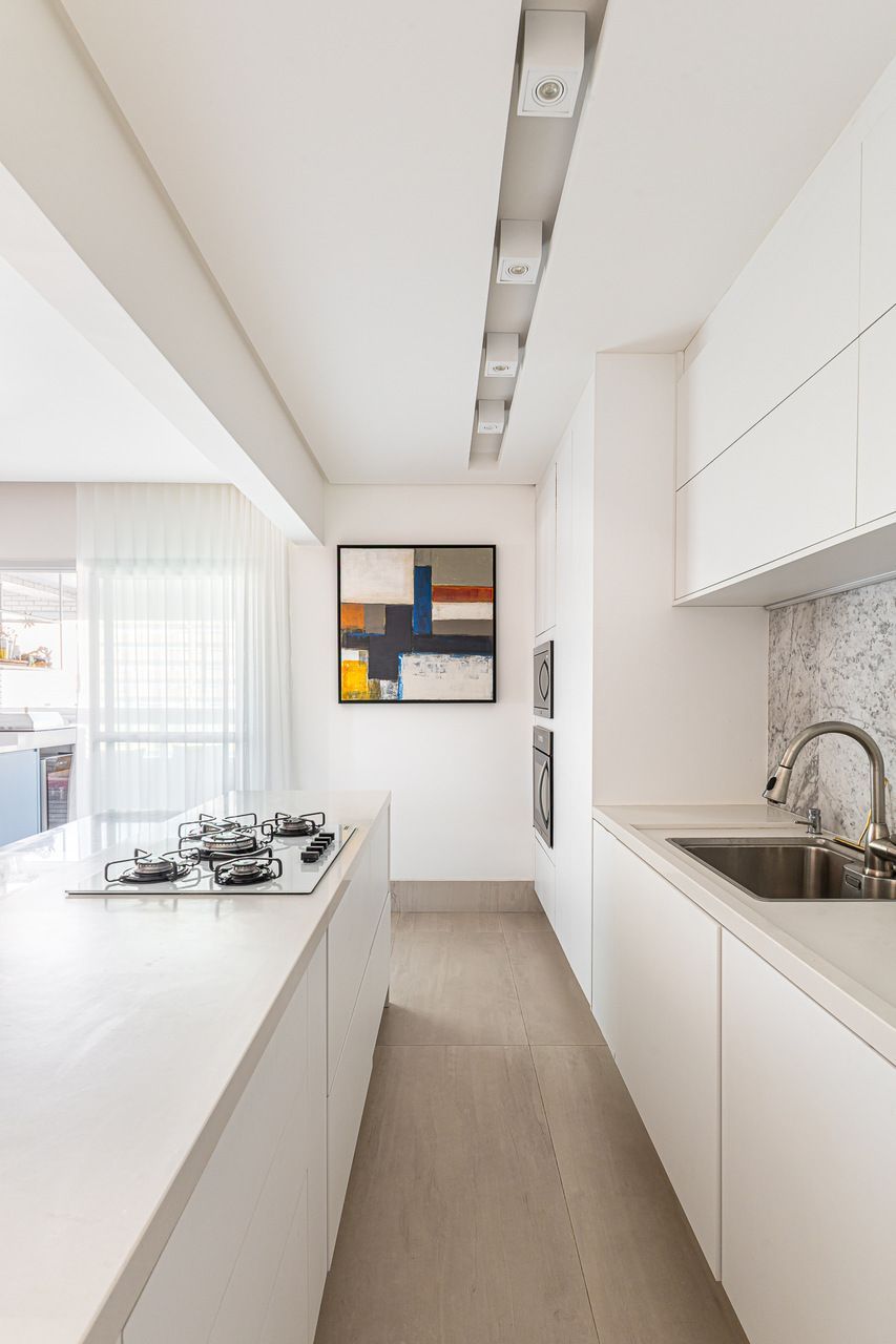A cozinha, ponto central da casa, foi projetada para ser funcional e discreta. A marcenaria branca, com sistema de abertura por toque, esconde os eletrodomésticos e amplia visualmente o ambiente. A bancada mescla o quartzo branco com o mármore Carrara, enquanto as cadeiras garimpadas acrescentam identidade e charme.